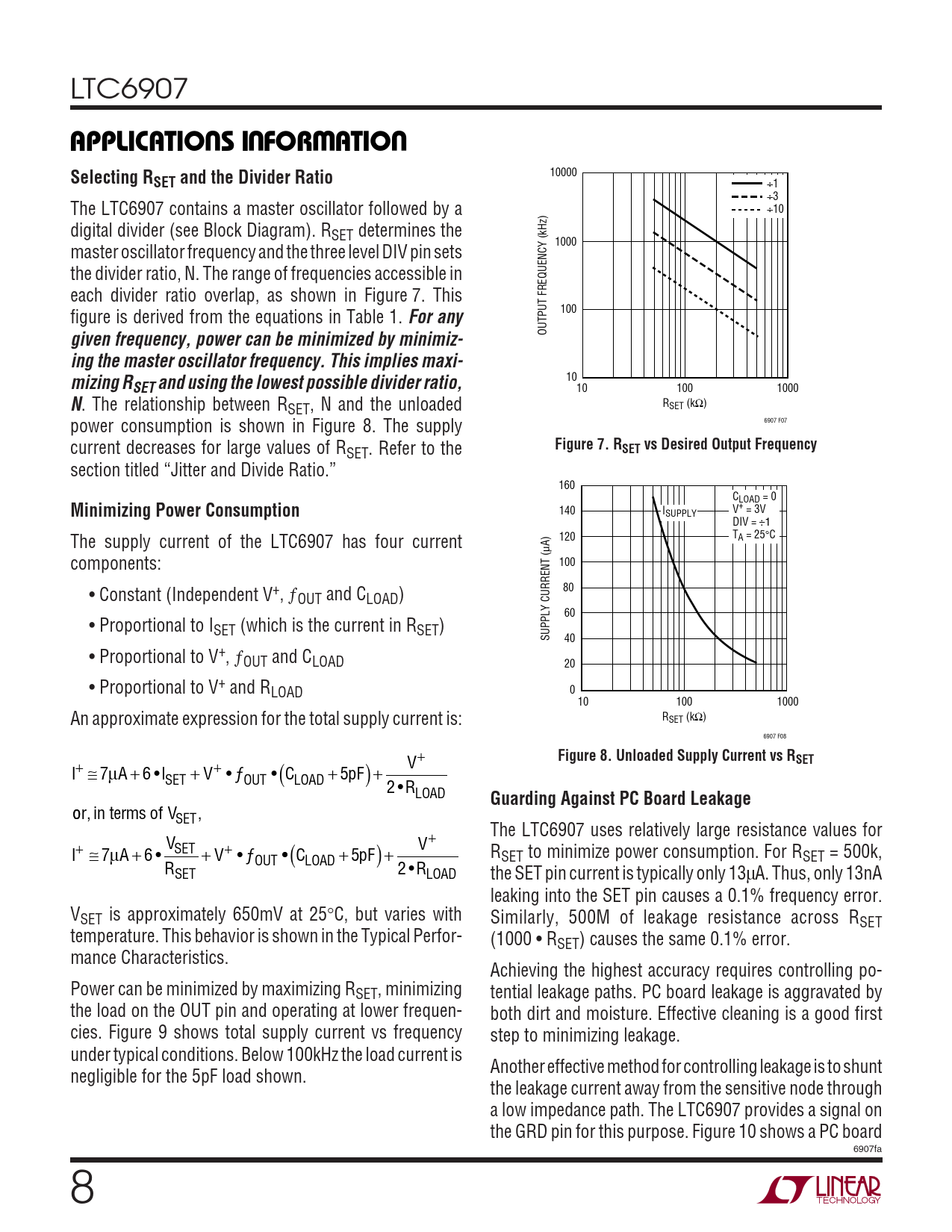 o or, in terms of VSET, The LTC6907 uses relatively large resistance values for V V+ I+ 7 A SET 6 • V+ ≅ µ + + • ƒ • (C + p 5 F R )+ SET to minimize power consumption. For RSET = 500k, R OUT LOAD SET 2 • RLOAD the SET pin current is typically only 13µA. Thus, only 13nA leaking into the SET pin causes a 0.1% frequency error. VSET is approximately 650mV at 25°C, but varies with Similarly, 500M of leakage resistance across RSET temperature. This behavior is shown in the Typical Perfor- (1000 • RSET) causes the same 0.1% error. mance Characteristics. Achieving the highest accuracy requires controlling po- Power can be minimized by maximizing RSET, minimizing tential leakage paths. PC board leakage is aggravated by the load on the OUT pin and operating at lower frequen- both dirt and moisture. Effective cleaning is a good first cies. Figure 9 shows total supply current vs frequency step to minimizing leakage. under typical conditions. Below 100kHz the load current is Another effective method for controlling leakage is to shunt negligible for the 5pF load shown. the leakage current away from the sensitive node through a low impedance path. The LTC6907 provides a signal on the GRD pin for this purpose. Figure 10 shows a PC board 6907fa 8
