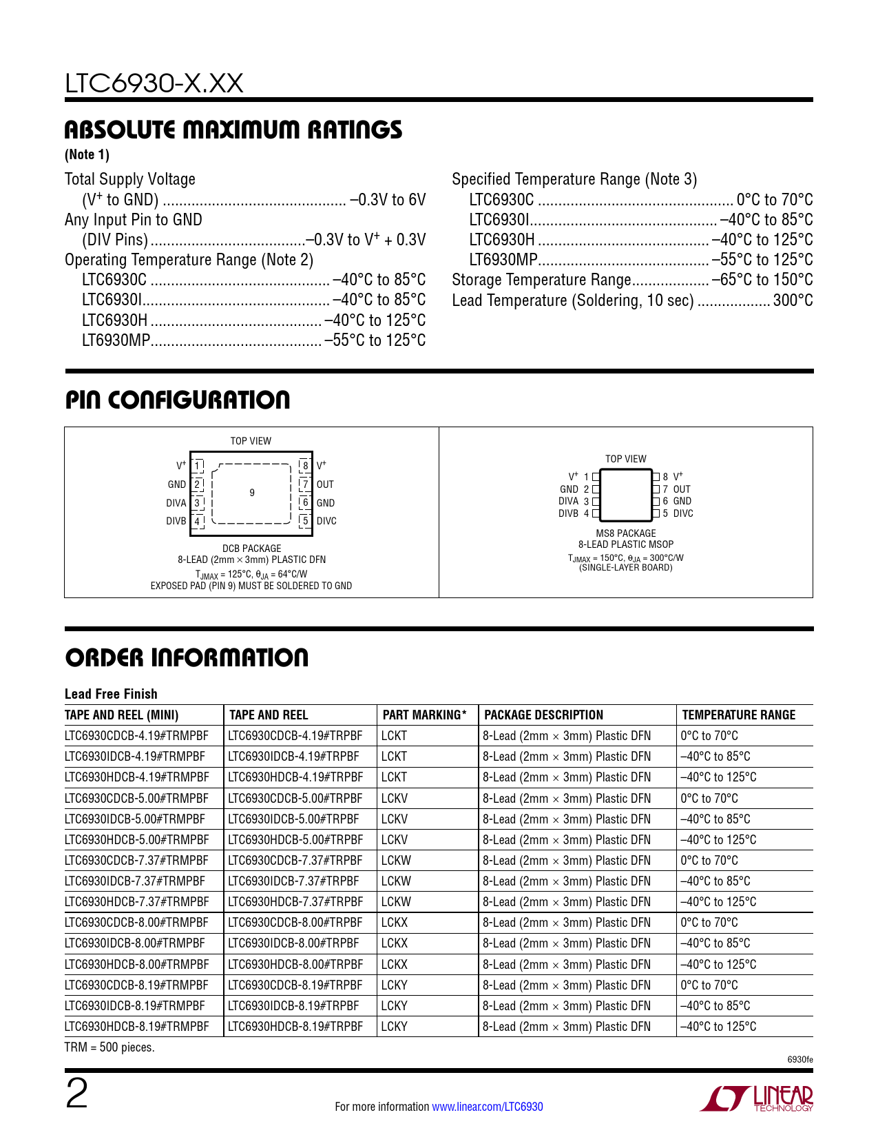 LTC6930CDCB-4.19#TRMPBF LTC6930CDCB-4.19#TRPBF LCKT 8-Lead (2mm 3mm) Plastic DFN 0°C to 70°C LTC6930IDCB-4.19#TRMPBF LTC6930IDCB-4.19#TRPBF LCKT 8-Lead (2mm 3mm) Plastic DFN –40°C to 85°C LTC6930HDCB-4.19#TRMPBF LTC6930HDCB-4.19#TRPBF LCKT 8-Lead (2mm 3mm) Plastic DFN –40°C to 125°C LTC6930CDCB-5.00#TRMPBF LTC6930CDCB-5.00#TRPBF LCKV 8-Lead (2mm 3mm) Plastic DFN 0°C to 70°C LTC6930IDCB-5.00#TRMPBF LTC6930IDCB-5.00#TRPBF LCKV 8-Lead (2mm 3mm) Plastic DFN –40°C to 85°C LTC6930HDCB-5.00#TRMPBF LTC6930HDCB-5.00#TRPBF LCKV 8-Lead (2mm 3mm) Plastic DFN –40°C to 125°C LTC6930CDCB-7.37#TRMPBF LTC6930CDCB-7.37#TRPBF LCKW 8-Lead (2mm 3mm) Plastic DFN 0°C to 70°C LTC6930IDCB-7.37#TRMPBF LTC6930IDCB-7.37#TRPBF LCKW 8-Lead (2mm 3mm) Plastic DFN –40°C to 85°C LTC6930HDCB-7.37#TRMPBF LTC6930HDCB-7.37#TRPBF LCKW 8-Lead (2mm 3mm) Plastic DFN –40°C to 125°C LTC6930CDCB-8.00#TRMPBF LTC6930CDCB-8.00#TRPBF LCKX 8-Lead (2mm 3mm) Plastic DFN 0°C to 70°C LTC6930IDCB-8.00#TRMPBF LTC6930IDCB-8.00#TRPBF LCKX 8-Lead (2mm 3mm) Plastic DFN –40°C to 85°C LTC6930HDCB-8.00#TRMPBF LTC6930HDCB-8.00#TRPBF LCKX 8-Lead (2mm 3mm) Plastic DFN –40°C to 125°C LTC6930CDCB-8.19#TRMPBF LTC6930CDCB-8.19#TRPBF LCKY 8-Lead (2mm 3mm) Plastic DFN 0°C to 70°C LTC6930IDCB-8.19#TRMPBF LTC6930IDCB-8.19#TRPBF LCKY 8-Lead (2mm 3mm) Plastic DFN –40°C to 85°C LTC6930HDCB-8.19#TRMPBF LTC6930HDCB-8.19#TRPBF LCKY 8-Lead (2mm 3mm) Plastic DFN –40°C to 125°C TRM = 500 pieces. 6930fe 2 For more information www.linear.com/LTC6930 Document Outline Features Applications Description Typical Application Absolute Maximum Ratings Pin Configuration Order Information AC Electrical Characteristics DC Electrical Characteristics Timing Characteristics Pin Functions Applications Information Package Description Revision History Related Parts