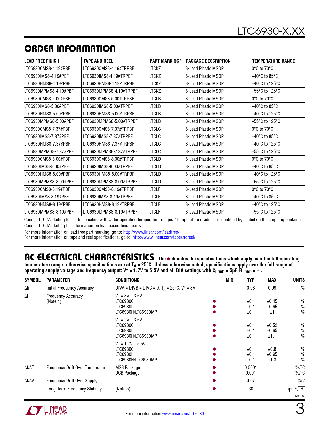LTC6930CMS8-4.19#PBF LTC6930CMS8-4.19#TRPBF LTCKZ 8-Lead Plastic MSOP 0°C to 70°C LTC6930IMS8-4.19#PBF LTC6930IMS8-4.19#TRPBF LTCKZ 8-Lead Plastic MSOP –40°C to 85°C LTC6930HMS8-4.19#PBF LTC6930HMS8-4.19#TRPBF LTCKZ 8-Lead Plastic MSOP –40°C to 125°C LTC6930MPMS8-4.19#PBF LTC6930MPMS8-4.19#TRPBF LTCKZ 8-Lead Plastic MSOP –55°C to 125°C LTC6930CMS8-5.00#PBF LTC6930CMS8-5.00#TRPBF LTCLB 8-Lead Plastic MSOP 0°C to 70°C LTC6930IMS8-5.00#PBF LTC6930IMS8-5.00#TRPBF LTCLB 8-Lead Plastic MSOP –40°C to 85°C LTC6930HMS8-5.00#PBF LTC6930HMS8-5.00#TRPBF LTCLB 8-Lead Plastic MSOP –40°C to 125°C LTC6930MPMS8-5.00#PBF LTC6930MPMS8-5.00#TRPBF LTCLB 8-Lead Plastic MSOP –55°C to 125°C LTC6930CMS8-7.37#PBF LTC6930CMS8-7.37#TRPBF LTCLC 8-Lead Plastic MSOP 0°C to 70°C LTC6930IMS8-7.37#PBF LTC6930IMS8-7.37#TRPBF LTCLC 8-Lead Plastic MSOP –40°C to 85°C LTC6930HMS8-7.37#PBF LTC6930HMS8-7.37#TRPBF LTCLC 8-Lead Plastic MSOP –40°C to 125°C LTC6930MPMS8-7.37#PBF LTC6930MPMS8-7.37#TRPBF LTCLC 8-Lead Plastic MSOP –55°C to 125°C LTC6930CMS8-8.00#PBF LTC6930CMS8-8.00#TRPBF LTCLD 8-Lead Plastic MSOP 0°C to 70°C LTC6930IMS8-8.00#PBF LTC6930IMS8-8.00#TRPBF LTCLD 8-Lead Plastic MSOP –40°C to 85°C LTC6930HMS8-8.00#PBF LTC6930HMS8-8.00#TRPBF LTCLD 8-Lead Plastic MSOP –40°C to 125°C LTC6930MPMS8-8.00#PBF LTC6930MPMS8-8.00#TRPBF LTCLD 8-Lead Plastic MSOP –55°C to 125°C LTC6930CMS8-8.19#PBF LTC6930CMS8-8.19#TRPBF LTCLF 8-Lead Plastic MSOP 0°C to 70°C LTC6930IMS8-8.19#PBF LTC6930IMS8-8.19#TRPBF LTCLF 8-Lead Plastic MSOP –40°C to 85°C LTC6930HMS8-8.19#PBF LTC6930HMS8-8.19#TRPBF LTCLF 8-Lead Plastic MSOP –40°C to 125°C LTC6930MPMS8-8.19#PBF LTC6930MPMS8-8.19#TRPBF LTCLF 8-Lead Plastic MSOP –55°C to 125°C Consult LTC Marketing for parts specified with wider operating temperature ranges.*Temperature grades are identified by a label on the shipping container. Consult LTC Marketing for information on lead based finish parts. For more information on lead free part marking, go to: http://www.linear.com/leadfree/ For more information on tape and reel specifications, go to: http://www.linear.com/tapeandreel/