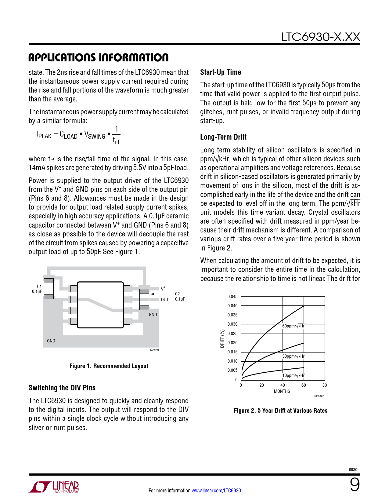 LTC6930-X.XX applicaTions inForMaTion state. The 2ns rise and fall times of the LTC6930 mean that Start-Up Time the instantaneous power supply current required during The start-up time of the LTC6930 is typically 50µs from the the rise and fall portions of the waveform is much greater time that valid power is applied to the first output pulse. than the average. The output is held low for the first 50µs to prevent any The instantaneous power supply current may be calculated glitches, runt pulses, or invalid frequency output during by a similar formula: start-up. 1 IPEAK = CLOAD • VSWING • t Long-Term Drift rf Long-term stability of silicon oscillators is specified in where trf is the rise/fall time of the signal. In this case, ppm/√kHr, which is typical of other silicon devices such 14mA spikes are generated by driving 5.5V into a 5pF load. as operational amplifiers and voltage references. Because Power is supplied to the output driver of the LTC6930 drift in silicon-based oscillators is generated primarily by from the V+ and GND pins on each side of the output pin movement of ions in the silicon, most of the drift is ac- (Pins 6 and 8). Allowances must be made in the design complished early in the life of the device and the drift can to provide for output load related supply current spikes, be expected to level off in the long term. The ppm/√kHr especially in high accuracy applications. A 0.1µF ceramic unit models this time variant decay. Crystal oscillators capacitor connected between V+ and GND (Pins 6 and 8) are often specified with drift measured in ppm/year be- as close as possible to the device will decouple the rest cause their drift mechanism is different. A comparison of of the circuit from spikes caused by powering a capacitive various drift rates over a five year time period is shown output load of up to 50pF. See Figure 1. in Figure 2. When calculating the amount of drift to be expected, it is important to consider the entire time in the calculation, because the relationship to time is not linear. The drift for C1 V+ 0.1µF C2 0.045 OUT 0.1µF 0.040 GND 0.035 0.030 60ppm/√kHr 0.025 GND 0.020 DRIFT (%) 6930 F01 0.015 30ppm/√kHr 0.010 Figure 1. Recommended Layout 0.005 10ppm/√kHr 0 0 20 40 60 80 Switching the DIV Pins MONTHS 6930 F02 The LTC6930 is designed to quickly and cleanly respond to the digital inputs. The output will respond to the DIV Figure 2. 5 Year Drift at Various Rates pins within a single clock cycle without introducing any sliver or runt pulses. 6930fe For more information www.linear.com/LTC6930 9 Document Outline Features Applications Description Typical Application Absolute Maximum Ratings Pin Configuration Order Information AC Electrical Characteristics DC Electrical Characteristics Timing Characteristics Pin Functions Applications Information Package Description Revision History Related Parts