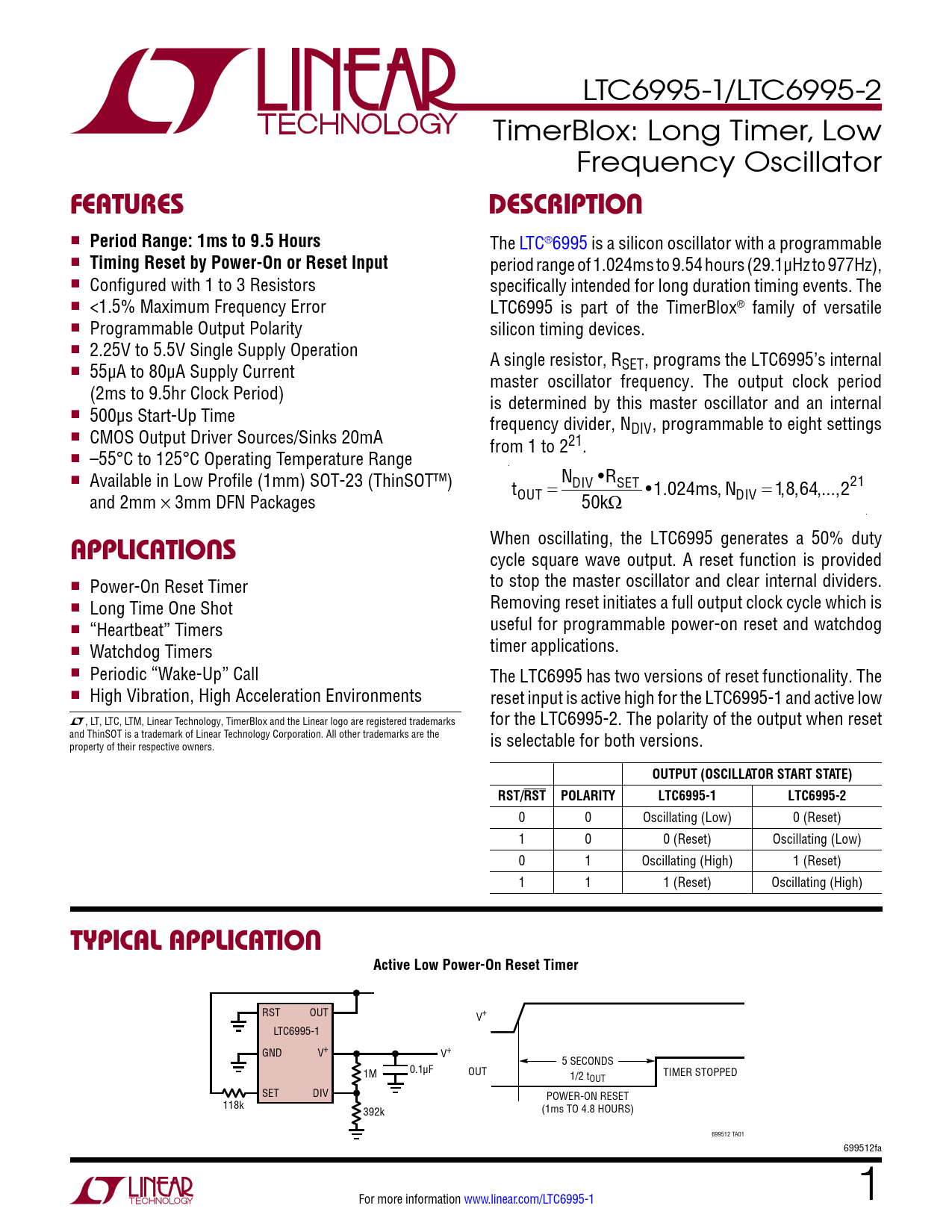 LTC6995-1/LTC6995-2 TimerBlox: Long Timer, Low Frequency Oscillator FeaTuresDescripTion n Period Range: 1ms to 9.5 Hours The LTC®6995 is a silicon oscillator with a programmable n Timing Reset by Power-On or Reset Input period range of 1.024ms to 9.54 hours (29.1µHz to 977Hz), n Configured with 1 to 3 Resistors specifically intended for long duration timing events. The n <1.5% Maximum Frequency Error LTC6995 is part of the TimerBlox® family of versatile n Programmable Output Polarity silicon timing devices. n 2.25V to 5.5V Single Supply Operation A single resistor, RSET , programs the LTC6995’s internal n 55µA to 80µA Supply Current master oscillator frequency. The output clock period (2ms to 9.5hr Clock Period) is determined by this master oscillator and an internal n 500µs Start-Up Time frequency divider, NDIV , programmable to eight settings n CMOS Output Driver Sources/Sinks 20mA from 1 to 221. n –55°C to 125°C Operating Temperature Range n Available in Low Profile (1mm) SOT-23 (ThinSOT™) N t DIV •RSET OUT = •1.024ms, NDIV =1,8,64,...,221 and 2mm × 3mm DFN Packages 50kΩ When oscillating, the LTC6995 generates a 50% duty applicaTions cycle square wave output. A reset function is provided n to stop the master oscillator and clear internal dividers. Power-On Reset Timer n Removing reset initiates a full output clock cycle which is Long Time One Shot n useful for programmable power-on reset and watchdog “Heartbeat” Timers n timer applications. Watchdog Timers n Periodic “Wake-Up” Call The LTC6995 has two versions of reset functionality. The n High Vibration, High Acceleration Environments reset input is active high for the LTC6995-1 and active low L, LT, LTC, LTM, Linear Technology, TimerBlox and the Linear logo are registered trademarks for the LTC6995-2. The polarity of the output when reset and ThinSOT is a trademark of Linear Technology Corporation. All other trademarks are the property of their respective owners. is selectable for both versions. OUTPUT (OSCILLATOR START STATE)RST/RST POLARITYLTC6995-1LTC6995-2 0 0 Oscillating (Low) 0 (Reset) 1 0 0 (Reset) Oscillating (Low) 0 1 Oscillating (High) 1 (Reset) 1 1 1 (Reset) Oscillating (High) Typical applicaTionActive Low Power-On Reset Timer RST OUT V+ LTC6995-1 GND V+ V+ 5 SECONDS 0.1µF 1M OUT 1/2 t TIMER STOPPED OUT SET DIV POWER-ON RESET 118k 392k (1ms TO 4.8 HOURS) 699512 TA01 699512fa For more information www.linear.com/LTC6995-1 1 Document Outline Features Applications Description Typical Application Absolute Maximum Ratings Pin Configuration Order Information Electrical Characteristics Typical Performance Characteristics Pin Functions Block Diagram Operation Applications Information Package Description Typical Application Related Parts