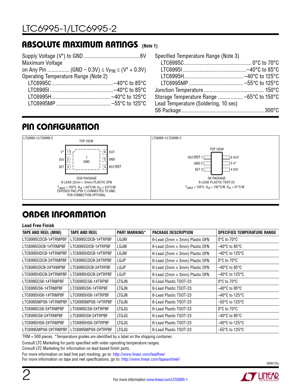 LTC6995-1/LTC6995-2 absoluTe MaxiMuM raTings (Note 1) Supply Voltage (V+) to GND ..6V Specified Temperature Range (Note 3) Maximum Voltage LTC6995C .. 0°C to 70°C on Any Pin .. (GND – 0.3V) ≤ VPIN ≤ (V+ + 0.3V) LTC6995I ...–40°C to 85°C Operating Temperature Range (Note 2) LTC6995H .. –40°C to 125°C LTC6995C ..–40°C to 85°C LTC6995MP ... –55°C to 125°C LTC6995I ...–40°C to 85°C Junction Temperature ... 150°C LTC6995H .. –40°C to 125°C Storage Temperature Range .. –65°C to 150°C LTC6995MP ... –55°C to 125°C Lead Temperature (Soldering, 10 sec) S6 Package ...300°C pin conFiguraTion LTC6995-1/LTC6995-2 LTC6995-1/LTC6995-2 TOP VIEW TOP VIEW V+ 1 6 OUT DIV 7 RST/RST 1 6 OUT 2 5 GND GND GND 2 5 V+ SET 3 4 RST/RST SET 3 4 DIV DCB PACKAGE S6 PACKAGE 6-LEAD (2mm × 3mm) PLASTIC DFN 6-LEAD PLASTIC TSOT-23 TJMAX = 150°C, θJA = 64°C/W, θJC = 9.6°C/W TJMAX = 150°C, θJA = 192°C/W, θJC = 51°C/W EXPOSED PAD (PIN 7) CONNECTED TO GND, PCB CONNECTION OPTIONAL orDer inForMaTion Lead Free Finish TAPE AND REEL (MINI)TAPE AND REELPART MARKING*PACKAGE DESCRIPTIONSPECIFIED TEMPERATURE RANGE LTC6995CDCB-1#TRMPBF LTC6995CDCB-1#TRPBF LGJM 6-Lead (2mm × 3mm) Plastic DFN 0°C to 70°C LTC6995IDCB-1#TRMPBF LTC6995IDCB-1#TRPBF LGJM 6-Lead (2mm × 3mm) Plastic DFN –40°C to 85°C LTC6995HDCB-1#TRMPBF LTC6995HDCB-1#TRPBF LGJM 6-Lead (2mm × 3mm) Plastic DFN –40°C to 125°C LTC6995CDCB-2#TRMPBF LTC6995CDCB-2#TRPBF LGJP 6-Lead (2mm × 3mm) Plastic DFN 0°C to 70°C LTC6995IDCB-2#TRMPBF LTC6995IDCB-2#TRPBF LGJP 6-Lead (2mm × 3mm) Plastic DFN –40°C to 85°C LTC6995HDCB-2#TRMPBF LTC6995HDCB-2#TRPBF LGJP 6-Lead (2mm × 3mm) Plastic DFN –40°C to 125°C LTC6995CS6-1#TRMPBF LTC6995CS6-1#TRPBF LTGJN 6-Lead Plastic TSOT-23 0°C to 70°C LTC6995IS6-1#TRMPBF LTC6995IS6-1#TRPBF LTGJN 6-Lead Plastic TSOT-23 –40°C to 85°C LTC6995HS6-1#TRMPBF LTC6995HS6-1#TRPBF LTGJN 6-Lead Plastic TSOT-23 –40°C to 125°C LTC6995MPS6-1#TRMPBF LTC6995MPS6-1#TRPBF LTGJN 6-Lead Plastic TSOT-23 –55°C to 125°C LTC6995CS6-2#TRMPBF LTC6995CS6-2#TRPBF LTGJQ 6-Lead Plastic TSOT-23 0°C to 70°C LTC6995IS6-2#TRMPBF LTC6995IS6-2#TRPBF LTGJQ 6-Lead Plastic TSOT-23 –40°C to 85°C LTC6995HS6-2#TRMPBF LTC6995HS6-2#TRPBF LTGJQ 6-Lead Plastic TSOT-23 –40°C to 125°C LTC6995MPS6-2#TRMPBF LTC6995MPS6-2#TRPBF LTGJQ 6-Lead Plastic TSOT-23 –55°C to 125°C TRM = 500 pieces. *Temperature grades are identified by a label on the shipping container. Consult LTC Marketing for parts specified with wider operating temperature ranges. Consult LTC Marketing for information on lead based finish parts. For more information on lead free part marking, go to: http://www.linear.com/leadfree/ For more information on tape and reel specifications, go to: http://www.linear.com/tapeandreel/ 699512fa 2 For more information www.linear.com/LTC6995-1 Document Outline Features Applications Description Typical Application Absolute Maximum Ratings Pin Configuration Order Information Electrical Characteristics Typical Performance Characteristics Pin Functions Block Diagram Operation Applications Information Package Description Typical Application Related Parts