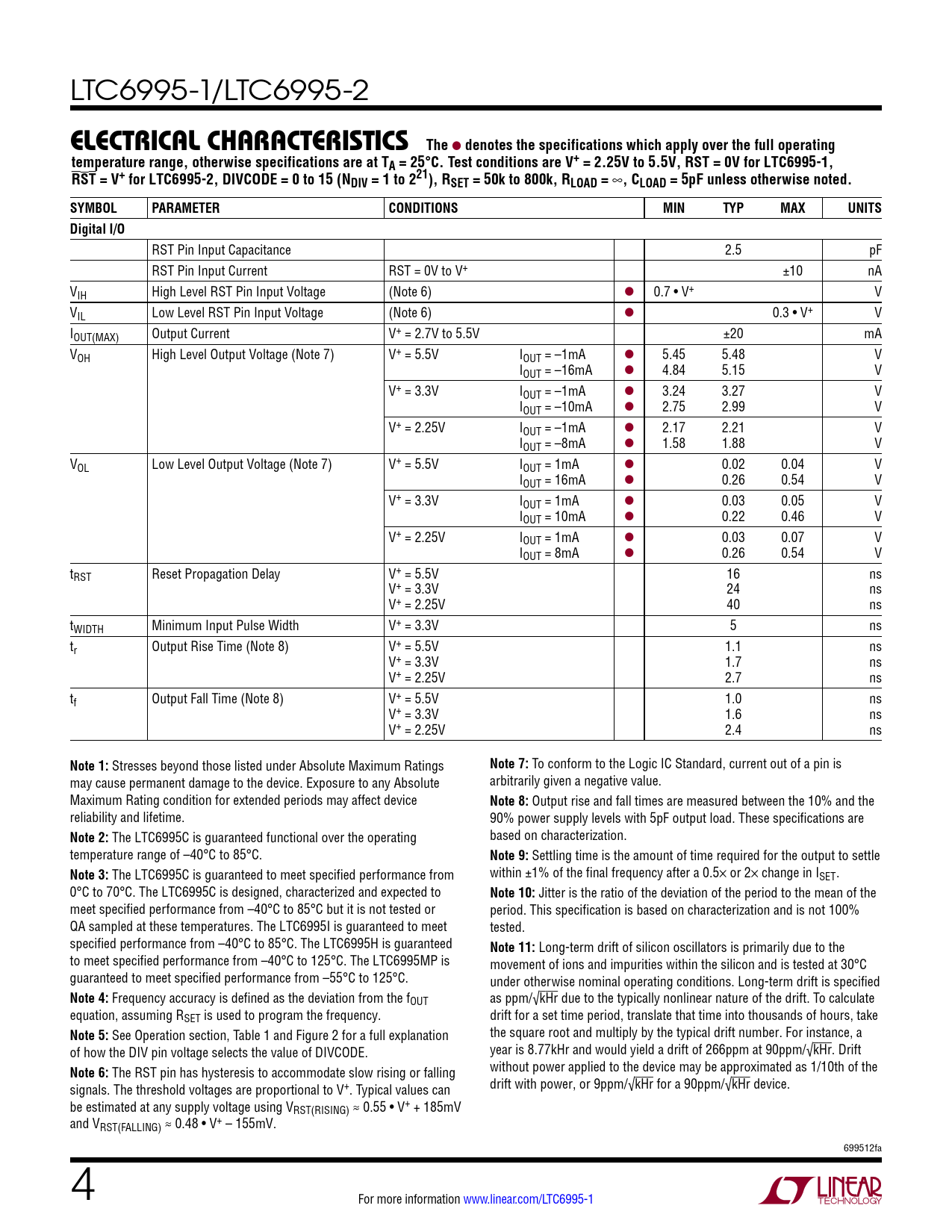 LTC6995-1/LTC6995-2 e lecTrical characTerisTics The l denotes the specifications which apply over the full operatingtemperature range, otherwise specifications are at TA = 25°C. Test conditions are V+ = 2.25V to 5.5V, RST = 0V for LTC6995-1,RST = V+ for LTC6995-2, DIVCODE = 0 to 15 (NDIV = 1 to 221), RSET = 50k to 800k, RLOAD = ∞ , CLOAD = 5pF unless otherwise noted.SYMBOLPARAMETERCONDITIONSMINTYPMAXUNITSDigital I/O RST Pin Input Capacitance 2.5 pF RST Pin Input Current RST = 0V to V+ ±10 nA VIH High Level RST Pin Input Voltage (Note 6) l 0.7 • V+ V VIL Low Level RST Pin Input Voltage (Note 6) l 0.3 • V+ V IOUT(MAX) Output Current V+ = 2.7V to 5.5V ±20 mA VOH High Level Output Voltage (Note 7) V+ = 5.5V IOUT = –1mA l 5.45 5.48 V IOUT = –16mA l 4.84 5.15 V V+ = 3.3V IOUT = –1mA l 3.24 3.27 V IOUT = –10mA l 2.75 2.99 V V+ = 2.25V IOUT = –1mA l 2.17 2.21 V IOUT = –8mA l 1.58 1.88 V VOL Low Level Output Voltage (Note 7) V+ = 5.5V IOUT = 1mA l 0.02 0.04 V IOUT = 16mA l 0.26 0.54 V V+ = 3.3V IOUT = 1mA l 0.03 0.05 V IOUT = 10mA l 0.22 0.46 V V+ = 2.25V IOUT = 1mA l 0.03 0.07 V IOUT = 8mA l 0.26 0.54 V tRST Reset Propagation Delay V+ = 5.5V 16 ns V+ = 3.3V 24 ns V+ = 2.25V 40 ns tWIDTH Minimum Input Pulse Width V+ = 3.3V 5 ns tr Output Rise Time (Note 8) V+ = 5.5V 1.1 ns V+ = 3.3V 1.7 ns V+ = 2.25V 2.7 ns tf Output Fall Time (Note 8) V+ = 5.5V 1.0 ns V+ = 3.3V 1.6 ns V+ = 2.25V 2.4 ns Note 1: Stresses beyond those listed under Absolute Maximum Ratings Note 7: To conform to the Logic IC Standard, current out of a pin is may cause permanent damage to the device. Exposure to any Absolute arbitrarily given a negative value. Maximum Rating condition for extended periods may affect device Note 8: Output rise and fall times are measured between the 10% and the reliability and lifetime. 90% power supply levels with 5pF output load. These specifications are Note 2: The LTC6995C is guaranteed functional over the operating based on characterization. temperature range of –40°C to 85°C. Note 9: Settling time is the amount of time required for the output to settle Note 3: The LTC6995C is guaranteed to meet specified performance from within ±1% of the final frequency after a 0.5× or 2× change in ISET . 0°C to 70°C. The LTC6995C is designed, characterized and expected to Note 10: Jitter is the ratio of the deviation of the period to the mean of the meet specified performance from –40°C to 85°C but it is not tested or period. This specification is based on characterization and is not 100% QA sampled at these temperatures. The LTC6995I is guaranteed to meet tested. specified performance from –40°C to 85°C. The LTC6995H is guaranteed Note 11: Long-term drift of silicon oscillators is primarily due to the to meet specified performance from –40°C to 125°C. The LTC6995MP is movement of ions and impurities within the silicon and is tested at 30°C guaranteed to meet specified performance from –55°C to 125°C. under otherwise nominal operating conditions. Long-term drift is specified Note 4: Frequency accuracy is defined as the deviation from the fOUT as ppm/√kHr due to the typically nonlinear nature of the drift. To calculate equation, assuming RSET is used to program the frequency. drift for a set time period, translate that time into thousands of hours, take Note 5: See Operation section, Table 1 and Figure 2 for a full explanation the square root and multiply by the typical drift number. For instance, a of how the DIV pin voltage selects the value of DIVCODE. year is 8.77kHr and would yield a drift of 266ppm at 90ppm/√kHr. Drift Note 6: The RST pin has hysteresis to accommodate slow rising or falling without power applied to the device may be approximated as 1/10th of the signals. The threshold voltages are proportional to V+. Typical values can drift with power, or 9ppm/√kHr for a 90ppm/√kHr device. be estimated at any supply voltage using VRST(RISING) ≈ 0.55 • V+ + 185mV and VRST(FALLING) ≈ 0.48 • V+ – 155mV. 699512fa 4 For more information www.linear.com/LTC6995-1 Document Outline Features Applications Description Typical Application Absolute Maximum Ratings Pin Configuration Order Information Electrical Characteristics Typical Performance Characteristics Pin Functions Block Diagram Operation Applications Information Package Description Typical Application Related Parts