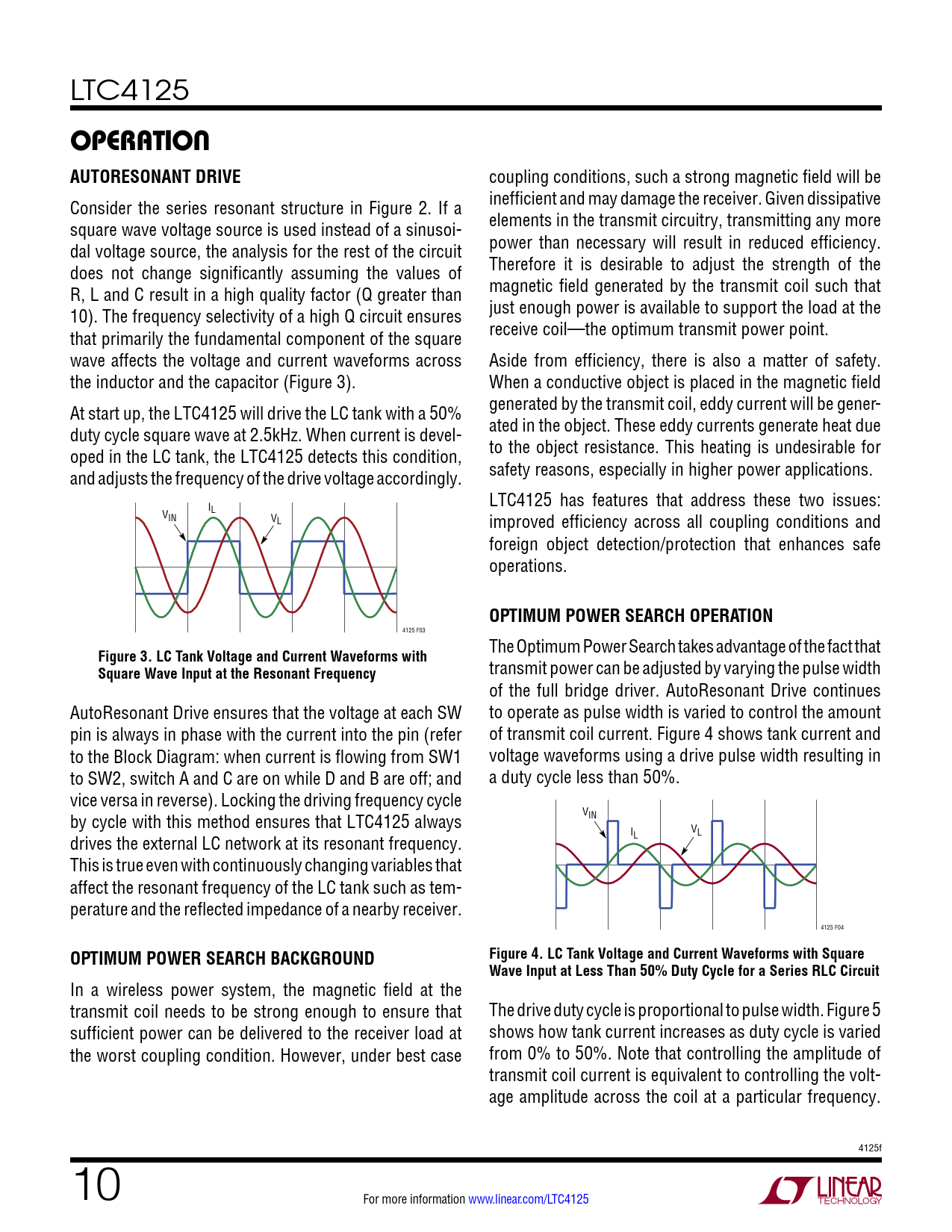 link to page 9 link to page 10 link to page 10 link to page 11 LTC4125 operaTion AUTORESONANT DRIVE coupling conditions, such a strong magnetic field will be Consider the series resonant structure in Figure 2. If a inefficient and may damage the receiver. Given dissipative square wave voltage source is used instead of a sinusoi- elements in the transmit circuitry, transmitting any more dal voltage source, the analysis for the rest of the circuit power than necessary will result in reduced efficiency. does not change significantly assuming the values of Therefore it is desirable to adjust the strength of the R, L and C result in a high quality factor (Q greater than magnetic field generated by the transmit coil such that 10). The frequency selectivity of a high Q circuit ensures just enough power is available to support the load at the that primarily the fundamental component of the square receive coil—the optimum transmit power point. wave affects the voltage and current waveforms across Aside from efficiency, there is also a matter of safety. the inductor and the capacitor (Figure 3). When a conductive object is placed in the magnetic field At start up, the LTC4125 will drive the LC tank with a 50% generated by the transmit coil, eddy current will be gener- duty cycle square wave at 2.5kHz. When current is devel- ated in the object. These eddy currents generate heat due oped in the LC tank, the LTC4125 detects this condition, to the object resistance. This heating is undesirable for and adjusts the frequency of the drive voltage accordingly. safety reasons, especially in higher power applications. LTC4125 has features that address these two issues: I V L IN VL improved efficiency across all coupling conditions and foreign object detection/protection that enhances safe operations. OPTIMUM POWER SEARCH OPERATION 4125 F03 The Optimum Power Search takes advantage of the fact that Figure 3. LC Tank Voltage and Current Waveforms withSquare Wave Input at the Resonant Frequency transmit power can be adjusted by varying the pulse width of the full bridge driver. AutoResonant Drive continues AutoResonant Drive ensures that the voltage at each SW to operate as pulse width is varied to control the amount pin is always in phase with the current into the pin (refer of transmit coil current. Figure 4 shows tank current and to the Block Diagram: when current is flowing from SW1 voltage waveforms using a drive pulse width resulting in to SW2, switch A and C are on while D and B are off; and a duty cycle less than 50%. vice versa in reverse). Locking the driving frequency cycle by cycle with this method ensures that LTC4125 always VIN V drives the external LC network at its resonant frequency. IL L This is true even with continuously changing variables that affect the resonant frequency of the LC tank such as tem- perature and the reflected impedance of a nearby receiver. 4125 F04 OPTIMUM POWER SEARCH BACKGROUNDFigure 4. LC Tank Voltage and Current Waveforms with SquareWave Input at Less Than 50% Duty Cycle for a Series RLC Circuit In a wireless power system, the magnetic field at the transmit coil needs to be strong enough to ensure that The drive duty cycle is proportional to pulse width. Figure 5 sufficient power can be delivered to the receiver load at shows how tank current increases as duty cycle is varied the worst coupling condition. However, under best case from 0% to 50%. Note that controlling the amplitude of transmit coil current is equivalent to controlling the volt- age amplitude across the coil at a particular frequency. 4125f 10 For more information www.linear.com/LTC4125 Document Outline Features Applications Typical Application Description Absolute Maximum Ratings Order Information Pin Configuration Electrical Characteristics Typical Performance Characteristics Pin Functions Functional Block Diagram Operation Applications Information Typical Applications Package Description Typical Application Related Parts