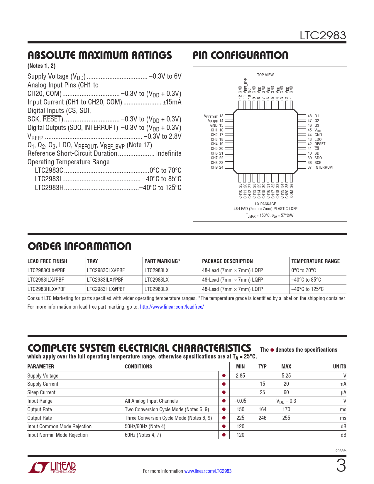 LTC2983 ABSOLUTE MAXIMUM RATINGSPIN CONFIGURATION(Notes 1, 2) Supply Voltage (VDD) ... –0.3V to 6V TOP VIEW Analog Input Pins (CH1 to CH20, COM) ... –0.3V to (VDD + 0.3V) GND V REF_BYP NC GND V DD GND V DD GND V DD GND V DD GND Input Current (CH1 to CH20, COM) .. ±15mA 12 11 10 9 8 7 6 5 4 3 2 1 Digital Inputs (CS, SDI, SCK, RESET) .. –0.3V to (V VREFOUT 13 48 Q1 DD + 0.3V) VREFP 14 47 Q2 Digital Outputs (SDO, INTERRUPT) –0.3V to (V GND 15 46 Q3 DD + 0.3V) CH1 16 45 VDD VREFP .. –0.3V to 2.8V CH2 17 44 GND CH3 18 43 LDO Q1, Q2, Q3, LDO, VREFOUT, VREF_BVP (Note 17) CH4 19 42 RESET CH5 20 41 CS Reference Short-Circuit Duration ... Indefinite CH6 21 40 SDI Operating Temperature Range CH7 22 39 SDO CH8 23 38 SCK LTC2983C ...0ºC to 70ºC CH9 24 37 INTERRUPT LTC2983I ... –40ºC to 85ºC LTC2983H ...–40ºC to 125ºC 25 26 27 28 29 30 31 32 33 34 35 36 CH10 CH11 CH12 CH13 CH14 CH15 CH16 CH17 CH18 CH19 CH20 COM LX PACKAGE 48-LEAD (7mm × 7mm) PLASTIC LQFP TJMAX = 150°C, θJA = 57°C/W ORDER INFORMATION LEAD FREE FINISHTRAYPART MARKING*PACKAGE DESCRIPTIONTEMPERATURE RANGE LTC2983CLX#PBF LTC2983CLX#PBF LTC2983LX 48-Lead (7mm × 7mm) LQFP 0°C to 70°C LTC2983ILX#PBF LTC2983ILX#PBF LTC2983LX 48-Lead (7mm × 7mm) LQFP –40°C to 85°C LTC2983HLX#PBF LTC2983HLX#PBF LTC2983LX 48-Lead (7mm × 7mm) LQFP –40°C to 125°C Consult LTC Marketing for parts specified with wider operating temperature ranges. *The temperature grade is identified by a label on the shipping container. For more information on lead free part marking, go to: http://www.linear.com/leadfree/ COMPLETE SYSTEM ELECTRICAL CHARACTERISTICSThe l denotes the specificationswhich apply over the full operating temperature range, otherwise specifications are at TA = 25°C. PARAMETERCONDITIONSMINTYPMAXUNITS Supply Voltage l 2.85 5.25 V Supply Current l 15 20 mA Sleep Current l 25 60 µA Input Range All Analog Input Channels l –0.05 VDD – 0.3 V Output Rate Two Conversion Cycle Mode (Notes 6, 9) l 150 164 170 ms Output Rate Three Conversion Cycle Mode (Notes 6, 9) l 225 246 255 ms Input Common Mode Rejection 50Hz/60Hz (Note 4) l 120 dB Input Normal Mode Rejection 60Hz (Notes 4, 7) l 120 dB 2983fc For more information www.linear.com/LTC2983 3 Document Outline Features Applications Typical Application Description Absolute Maximum Ratings Order Information Complete System Electrical Characteristics Pin Configuration ADC Electrical Characteristics Reference Electrical Characteristics Digital Inputs and Digital Outputs Typical Performance Characteristics Pin Functions Block Diagram Test Circuits Timing Diagram Overview Applications Information Thermocouple Measurements Diode Measurements RTD Measurements Thermistor Measurements Direct ADC Measurements Supplemental Information Fault Protection and Anti-Aliasing 2- and 3-Cycle Conversion Modes Running Conversions Consecutively on Multiple Channels MUX Configuration Delay Global Configuration Register Custom Thermocouples Custom RTDs Custom Thermistors Package Description Revision History Typical Application Related Parts