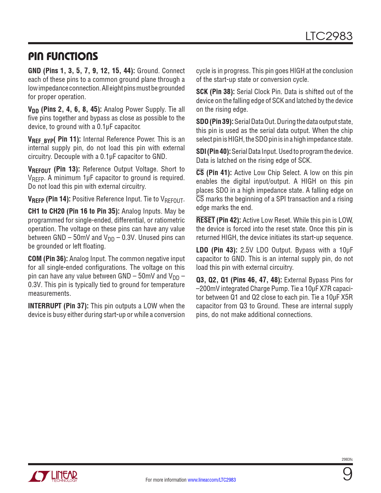 LTC2983 PIN FUNCTIONS GND (Pins 1, 3, 5, 7, 9, 12, 15, 44): Ground. Connect cycle is in progress. This pin goes HIGH at the conclusion each of these pins to a common ground plane through a of the start-up state or conversion cycle. low impedance connection. All eight pins must be grounded SCK (Pin 38): Serial Clock Pin. Data is shifted out of the for proper operation. device on the falling edge of SCK and latched by the device VDD (Pins 2, 4, 6, 8, 45): Analog Power Supply. Tie all on the rising edge. five pins together and bypass as close as possible to the SDO (Pin 39): Serial Data Out. During the data output state, device, to ground with a 0.1μF capacitor. this pin is used as the serial data output. When the chip VREF_BYP( Pin 11): Internal Reference Power. This is an select pin is HIGH, the SDO pin is in a high impedance state. internal supply pin, do not load this pin with external SDI (Pin 40): Serial Data Input. Used to program the device. circuitry. Decouple with a 0.1µF capacitor to GND. Data is latched on the rising edge of SCK. VREFOUT (Pin 13): Reference Output Voltage. Short to CS (Pin 41): Active Low Chip Select. A low on this pin VREFP. A minimum 1μF capacitor to ground is required. enables the digital input/output. A HIGH on this pin Do not load this pin with external circuitry. places SDO in a high impedance state. A falling edge on VREFP (Pin 14): Positive Reference Input. Tie to VREFOUT. CS marks the beginning of a SPI transaction and a rising CH1 to CH20 (Pin 16 to Pin 35): Analog Inputs. May be edge marks the end. programmed for single-ended, differential, or ratiometric RESET (Pin 42): Active Low Reset. While this pin is LOW, operation. The voltage on these pins can have any value the device is forced into the reset state. Once this pin is between GND – 50mV and VDD – 0.3V. Unused pins can returned HIGH, the device initiates its start-up sequence. be grounded or left floating. LDO (Pin 43): 2.5V LDO Output. Bypass with a 10µF COM (Pin 36): Analog Input. The common negative input capacitor to GND. This is an internal supply pin, do not for all single-ended configurations. The voltage on this load this pin with external circuitry. pin can have any value between GND – 50mV and VDD – Q3, Q2, Q1 (Pins 46, 47, 48): External Bypass Pins for 0.3V. This pin is typically tied to ground for temperature –200mV integrated Charge Pump. Tie a 10µF X7R capaci- measurements. tor between Q1 and Q2 close to each pin. Tie a 10µF X5R INTERRUPT (Pin 37): This pin outputs a LOW when the capacitor from Q3 to Ground. These are internal supply device is busy either during start-up or while a conversion pins, do not make additional connections. 2983fc For more information www.linear.com/LTC2983 9 Document Outline Features Applications Typical Application Description Absolute Maximum Ratings Order Information Complete System Electrical Characteristics Pin Configuration ADC Electrical Characteristics Reference Electrical Characteristics Digital Inputs and Digital Outputs Typical Performance Characteristics Pin Functions Block Diagram Test Circuits Timing Diagram Overview Applications Information Thermocouple Measurements Diode Measurements RTD Measurements Thermistor Measurements Direct ADC Measurements Supplemental Information Fault Protection and Anti-Aliasing 2- and 3-Cycle Conversion Modes Running Conversions Consecutively on Multiple Channels MUX Configuration Delay Global Configuration Register Custom Thermocouples Custom RTDs Custom Thermistors Package Description Revision History Typical Application Related Parts