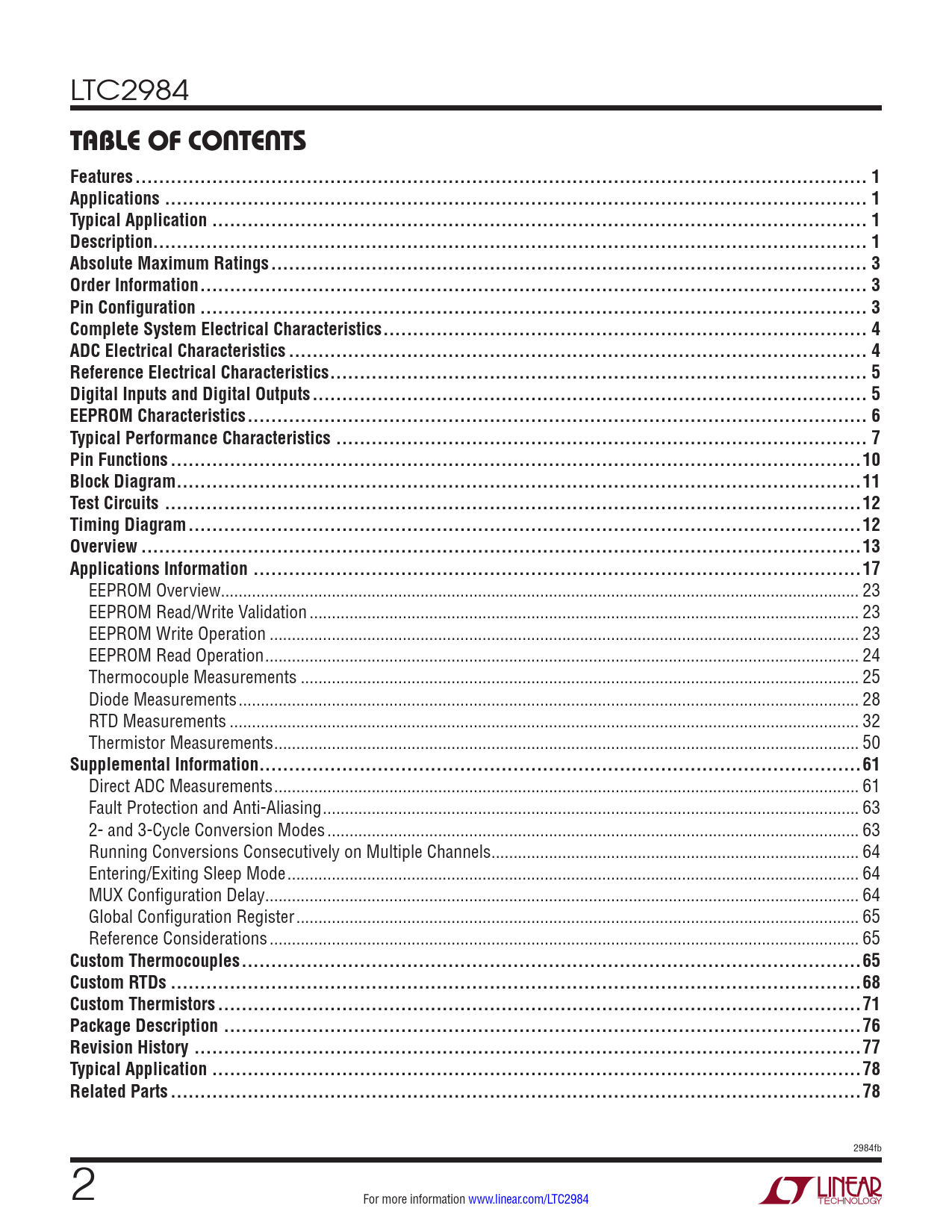 2984fb 2 For more information www.linear.com/LTC2984 Document Outline Features Applications Typical Application Description Absolute Maximum Ratings Order Information Pin Configuration Complete System Electrical Characteristics ADC Electrical Characteristics Reference Electrical Characteristics Digital Inputs and Digital Outputs EEPROM Characteristics Typical Performance Characteristics Pin Functions Block Diagram Test Circuits Timing Diagram Overview Applications Information EEPROM Overview Eeprom Read/Write Validation EEPROM Write Operation EEPROM Read Operation Thermocouple Measurements Diode Measurements RTD Measurements Thermistor Measurements Supplemental Information Direct ADC Measurements Fault Protection and Anti-Aliasing 2- and 3-Cycle Conversion Modes Running Conversions Consecutively on Multiple Channels Entering/Exiting Sleep Mode MUX Configuration Delay Global Configuration Register Reference Considerations Custom Thermocouples Custom RTDs Custom Thermistors Package Description Revision History Typical Application Related Parts