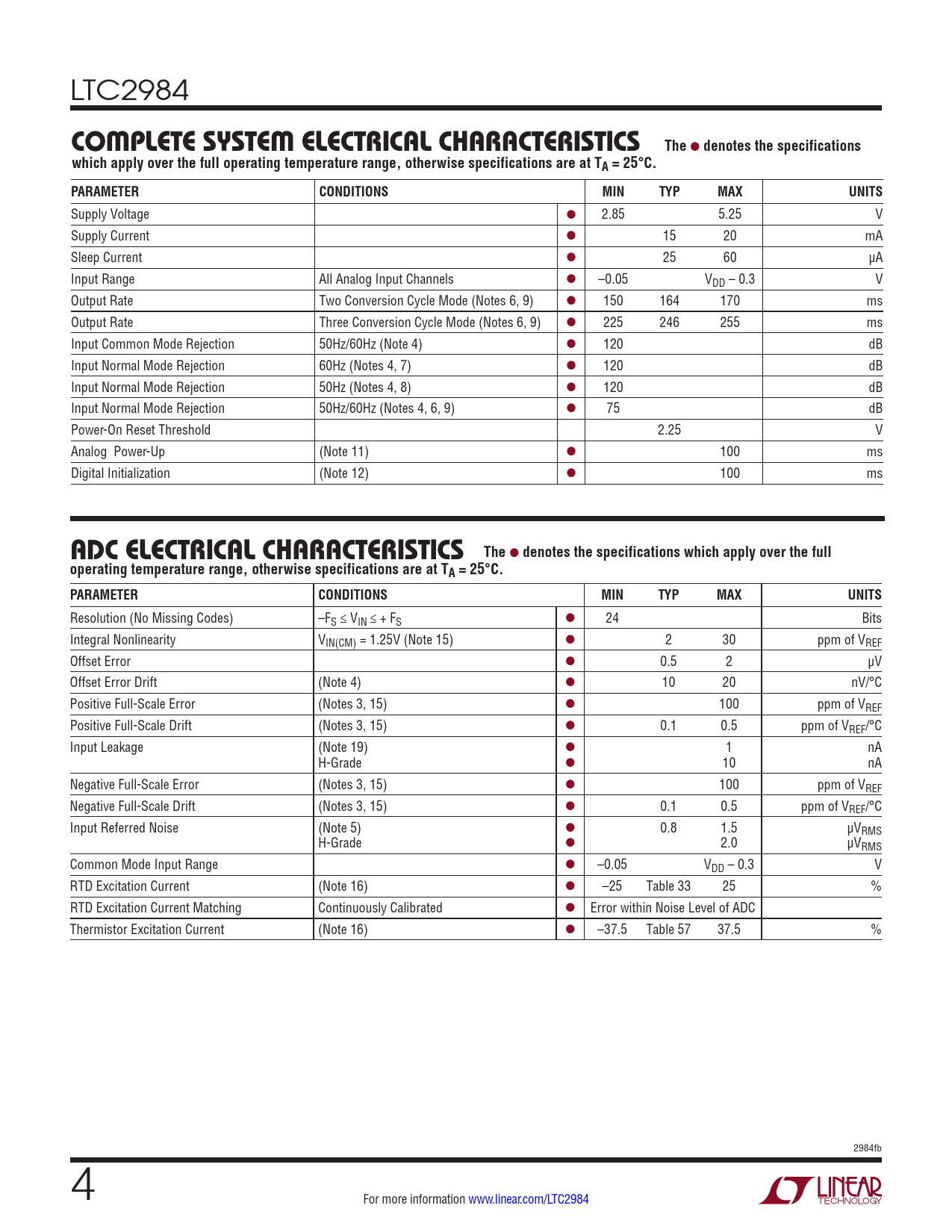 LTC2984 COMPLETE SYSTEM ELECTRICAL CHARACTERISTICSThe l denotes the specificationswhich apply over the full operating temperature range, otherwise specifications are at TA = 25°C.PARAMETERCONDITIONSMINTYPMAXUNITS Supply Voltage l 2.85 5.25 V Supply Current l 15 20 mA Sleep Current l 25 60 µA Input Range All Analog Input Channels l –0.05 VDD – 0.3 V Output Rate Two Conversion Cycle Mode (Notes 6, 9) l 150 164 170 ms Output Rate Three Conversion Cycle Mode (Notes 6, 9) l 225 246 255 ms Input Common Mode Rejection 50Hz/60Hz (Note 4) l 120 dB Input Normal Mode Rejection 60Hz (Notes 4, 7) l 120 dB Input Normal Mode Rejection 50Hz (Notes 4, 8) l 120 dB Input Normal Mode Rejection 50Hz/60Hz (Notes 4, 6, 9) l 75 dB Power-On Reset Threshold 2.25 V Analog Power-Up (Note 11) l 100 ms Digital Initialization (Note 12) l 100 ms ADC ELECTRICAL CHARACTERISTICSThe l denotes the specifications which apply over the fulloperating temperature range, otherwise specifications are at TA = 25°C. PARAMETERCONDITIONSMINTYPMAXUNITS Resolution (No Missing Codes) –FS ≤ VIN ≤ + FS l 24 Bits Integral Nonlinearity VIN(CM) = 1.25V (Note 15) l 2 30 ppm of VREF Offset Error l 0.5 2 µV Offset Error Drift (Note 4) l 10 20 nV/°C Positive Full-Scale Error (Notes 3, 15) l 100 ppm of VREF Positive Full-Scale Drift (Notes 3, 15) l 0.1 0.5 ppm of VREF/°C Input Leakage (Note 19) l 1 nA H-Grade l 10 nA Negative Full-Scale Error (Notes 3, 15) l 100 ppm of VREF Negative Full-Scale Drift (Notes 3, 15) l 0.1 0.5 ppm of VREF/°C Input Referred Noise (Note 5) l 0.8 1.5 µVRMS H-Grade l 2.0 µVRMS Common Mode Input Range l –0.05 VDD – 0.3 V RTD Excitation Current (Note 16) l –25 Table 33 25 % RTD Excitation Current Matching Continuously Calibrated l Error within Noise Level of ADC Thermistor Excitation Current (Note 16) l –37.5 Table 57 37.5 % 2984fb 4 For more information www.linear.com/LTC2984 Document Outline Features Applications Typical Application Description Absolute Maximum Ratings Order Information Pin Configuration Complete System Electrical Characteristics ADC Electrical Characteristics Reference Electrical Characteristics Digital Inputs and Digital Outputs EEPROM Characteristics Typical Performance Characteristics Pin Functions Block Diagram Test Circuits Timing Diagram Overview Applications Information EEPROM Overview Eeprom Read/Write Validation EEPROM Write Operation EEPROM Read Operation Thermocouple Measurements Diode Measurements RTD Measurements Thermistor Measurements Supplemental Information Direct ADC Measurements Fault Protection and Anti-Aliasing 2- and 3-Cycle Conversion Modes Running Conversions Consecutively on Multiple Channels Entering/Exiting Sleep Mode MUX Configuration Delay Global Configuration Register Reference Considerations Custom Thermocouples Custom RTDs Custom Thermistors Package Description Revision History Typical Application Related Parts