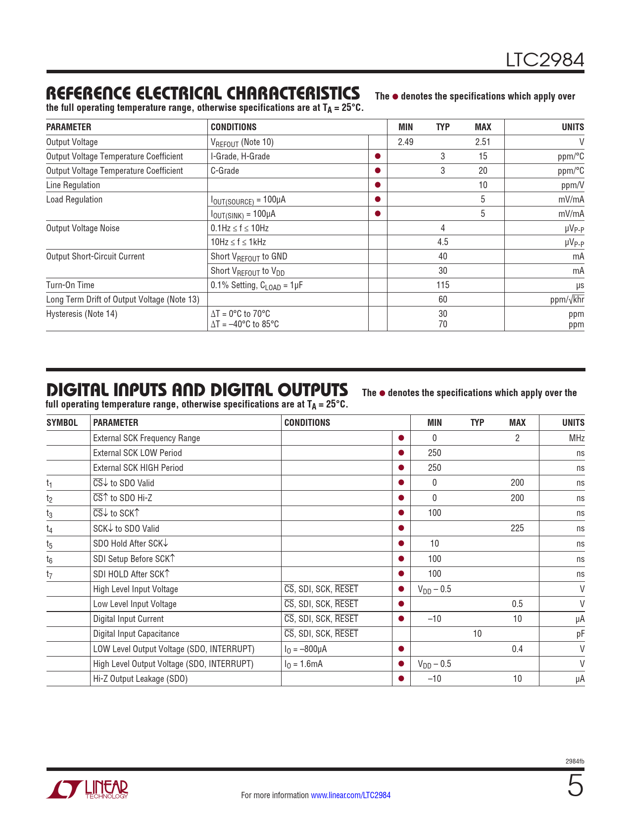 LTC2984 REFERENCE ELECTRICAL CHARACTERISTICSThe l denotes the specifications which apply overthe full operating temperature range, otherwise specifications are at TA = 25°C. PARAMETERCONDITIONSMINTYPMAXUNITS Output Voltage VREFOUT (Note 10) 2.49 2.51 V Output Voltage Temperature Coefficient I-Grade, H-Grade l 3 15 ppm/°C Output Voltage Temperature Coefficient C-Grade l 3 20 ppm/°C Line Regulation l 10 ppm/V Load Regulation IOUT(SOURCE) = 100µA l 5 mV/mA IOUT(SINK) = 100µA l 5 mV/mA Output Voltage Noise 0.1Hz ≤ f ≤ 10Hz 4 µVP-P 10Hz ≤ f ≤ 1kHz 4.5 µVP-P Output Short-Circuit Current Short VREFOUT to GND 40 mA Short VREFOUT to VDD 30 mA Turn-On Time 0.1% Setting, CLOAD = 1µF 115 µs Long Term Drift of Output Voltage (Note 13) 60 ppm/√khr Hysteresis (Note 14) ∆T = 0°C to 70°C 30 ppm ∆T = –40°C to 85°C 70 ppm DIGITAL INPUTS AND DIGITAL OUTPUTSThe l denotes the specifications which apply over thefull operating temperature range, otherwise specifications are at TA = 25°C.SYMBOLPARAMETERCONDITIONSMINTYPMAXUNITS External SCK Frequency Range l 0 2 MHz External SCK LOW Period l 250 ns External SCK HIGH Period l 250 ns t1 CS↓ to SDO Valid l 0 200 ns t2 CS↑ to SDO Hi-Z l 0 200 ns t3 CS↓ to SCK↑ l 100 ns t4 SCK↓ to SDO Valid l 225 ns t5 SDO Hold After SCK↓ l 10 ns t6 SDI Setup Before SCK↑ l 100 ns t7 SDI HOLD After SCK↑ l 100 ns High Level Input Voltage CS, SDI, SCK, RESET l VDD – 0.5 V Low Level Input Voltage CS, SDI, SCK, RESET l 0.5 V Digital Input Current CS, SDI, SCK, RESET l –10 10 µA Digital Input Capacitance CS, SDI, SCK, RESET 10 pF LOW Level Output Voltage (SDO, INTERRUPT) IO = –800µA l 0.4 V High Level Output Voltage (SDO, INTERRUPT) IO = 1.6mA l VDD – 0.5 V Hi-Z Output Leakage (SDO) l –10 10 µA 2984fb For more information www.linear.com/LTC2984 5 Document Outline Features Applications Typical Application Description Absolute Maximum Ratings Order Information Pin Configuration Complete System Electrical Characteristics ADC Electrical Characteristics Reference Electrical Characteristics Digital Inputs and Digital Outputs EEPROM Characteristics Typical Performance Characteristics Pin Functions Block Diagram Test Circuits Timing Diagram Overview Applications Information EEPROM Overview Eeprom Read/Write Validation EEPROM Write Operation EEPROM Read Operation Thermocouple Measurements Diode Measurements RTD Measurements Thermistor Measurements Supplemental Information Direct ADC Measurements Fault Protection and Anti-Aliasing 2- and 3-Cycle Conversion Modes Running Conversions Consecutively on Multiple Channels Entering/Exiting Sleep Mode MUX Configuration Delay Global Configuration Register Reference Considerations Custom Thermocouples Custom RTDs Custom Thermistors Package Description Revision History Typical Application Related Parts