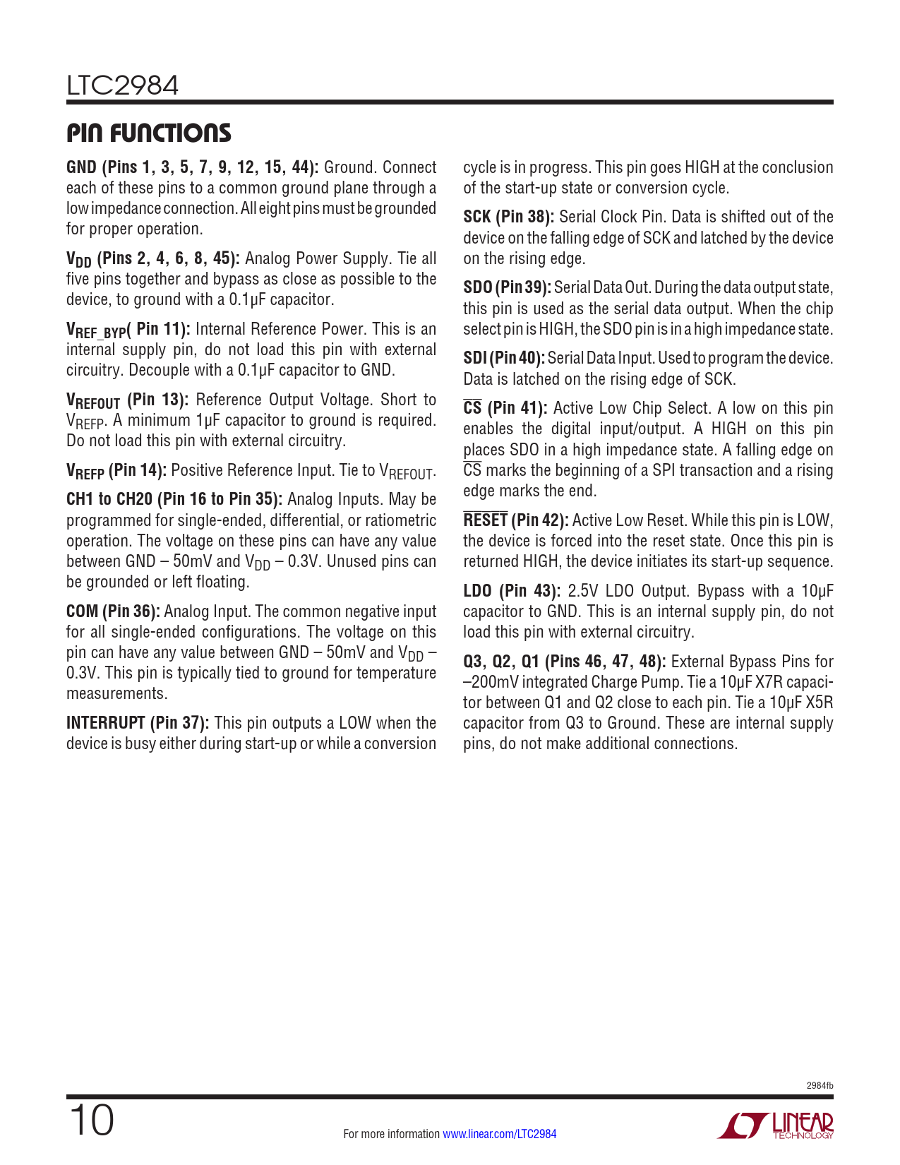 This pin outputs a LOW when the capacitor from Q3 to Ground. These are internal supply device is busy either during start-up or while a conversion pins, do not make additional connections. 2984fb 10 For more information www.linear.com/LTC2984 Document Outline Features Applications Typical Application Description Absolute Maximum Ratings Order Information Pin Configuration Complete System Electrical Characteristics ADC Electrical Characteristics Reference Electrical Characteristics Digital Inputs and Digital Outputs EEPROM Characteristics Typical Performance Characteristics Pin Functions Block Diagram Test Circuits Timing Diagram Overview Applications Information EEPROM Overview Eeprom Read/Write Validation EEPROM Write Operation EEPROM Read Operation Thermocouple Measurements Diode Measurements RTD Measurements Thermistor Measurements Supplemental Information Direct ADC Measurements Fault Protection and Anti-Aliasing 2- and 3-Cycle Conversion Modes Running Conversions Consecutively on Multiple Channels Entering/Exiting Sleep Mode MUX Configuration Delay Global Configuration Register Reference Considerations Custom Thermocouples Custom RTDs Custom Thermistors Package Description Revision History Typical Application Related Parts