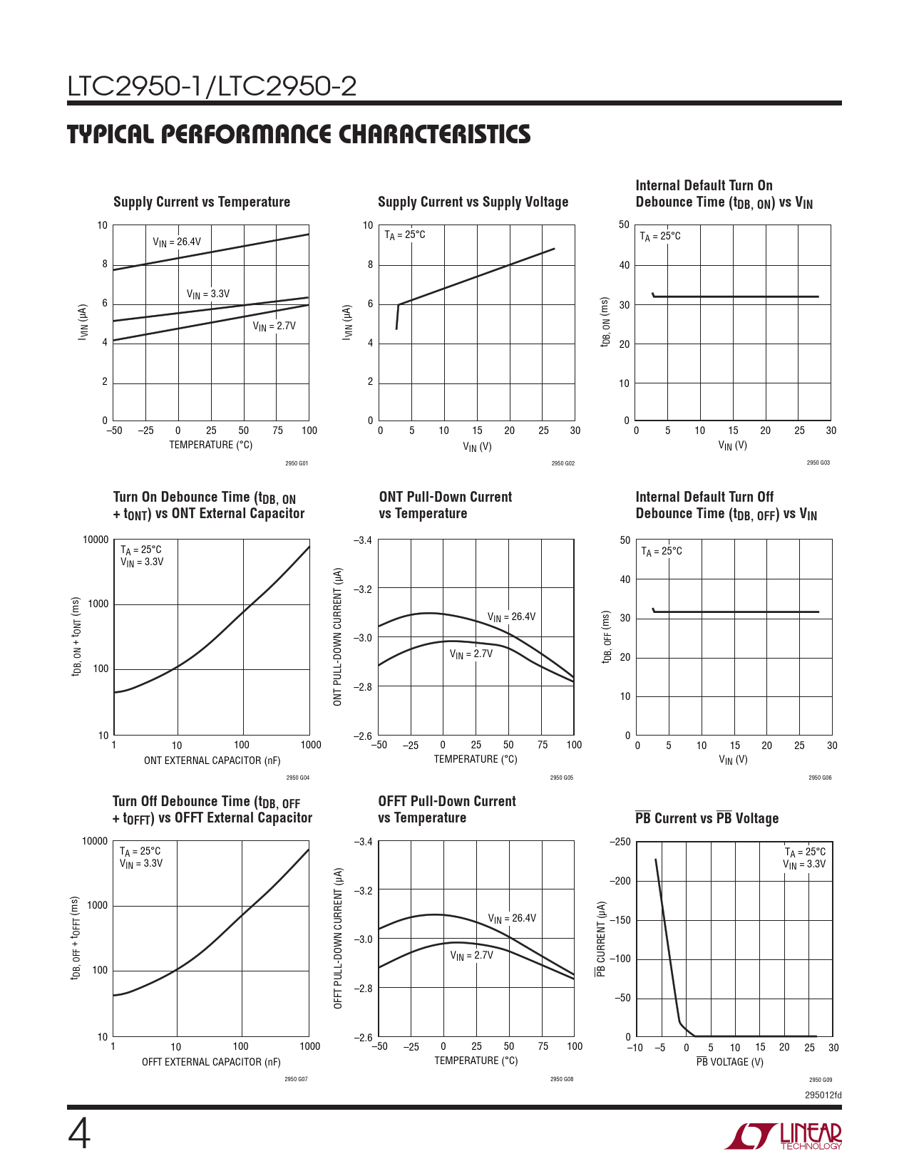 10000 –3.4 50 TA = 25°C TA = 25°C VIN = 3.3V 40 –3.2 1000 (ms) VIN = 26.4V 30 ONT (ms) + t –3.0 VIN = 2.7V t DB, OFF 20 t DB, ON 100 –2.8 ONT PULL-DOWN CURRENT (µA) 10 10 –2.6 0 1 10 100 1000 –50 –25 0 25 50 75 100 0 5 10 15 20 25 30 ONT EXTERNAL CAPACITOR (nF) TEMPERATURE (°C) VIN (V) 2950 G04 2950 G05 2950 G06