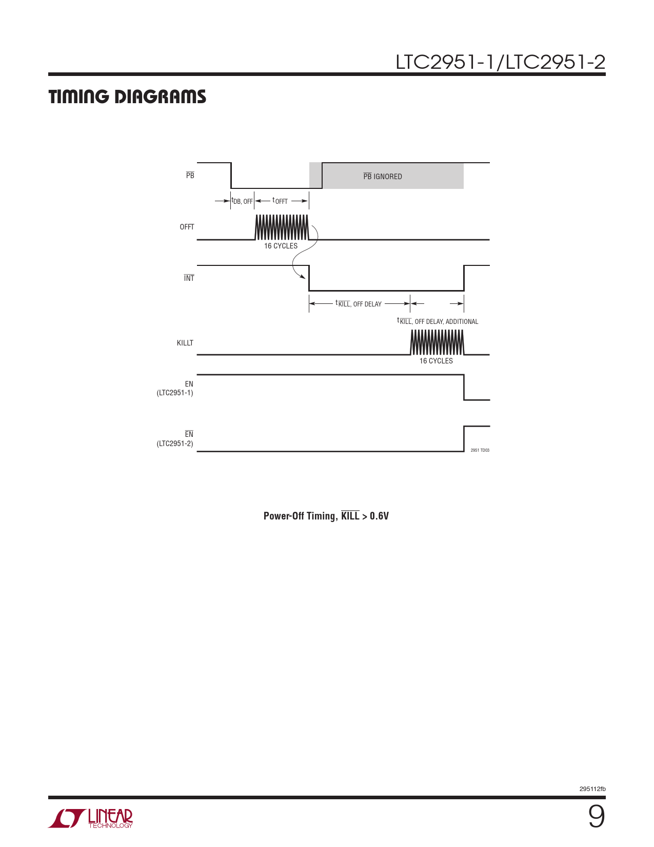 PB PB IGNORED tDB, OFF tOFFT OFFT 16 CYCLES INT tKILL, OFF DELAY tKILL, OFF DELAY, ADDITIONAL KILLT 16 CYCLES EN (LTC2951-1) EN (LTC2951-2) 2951 TD03