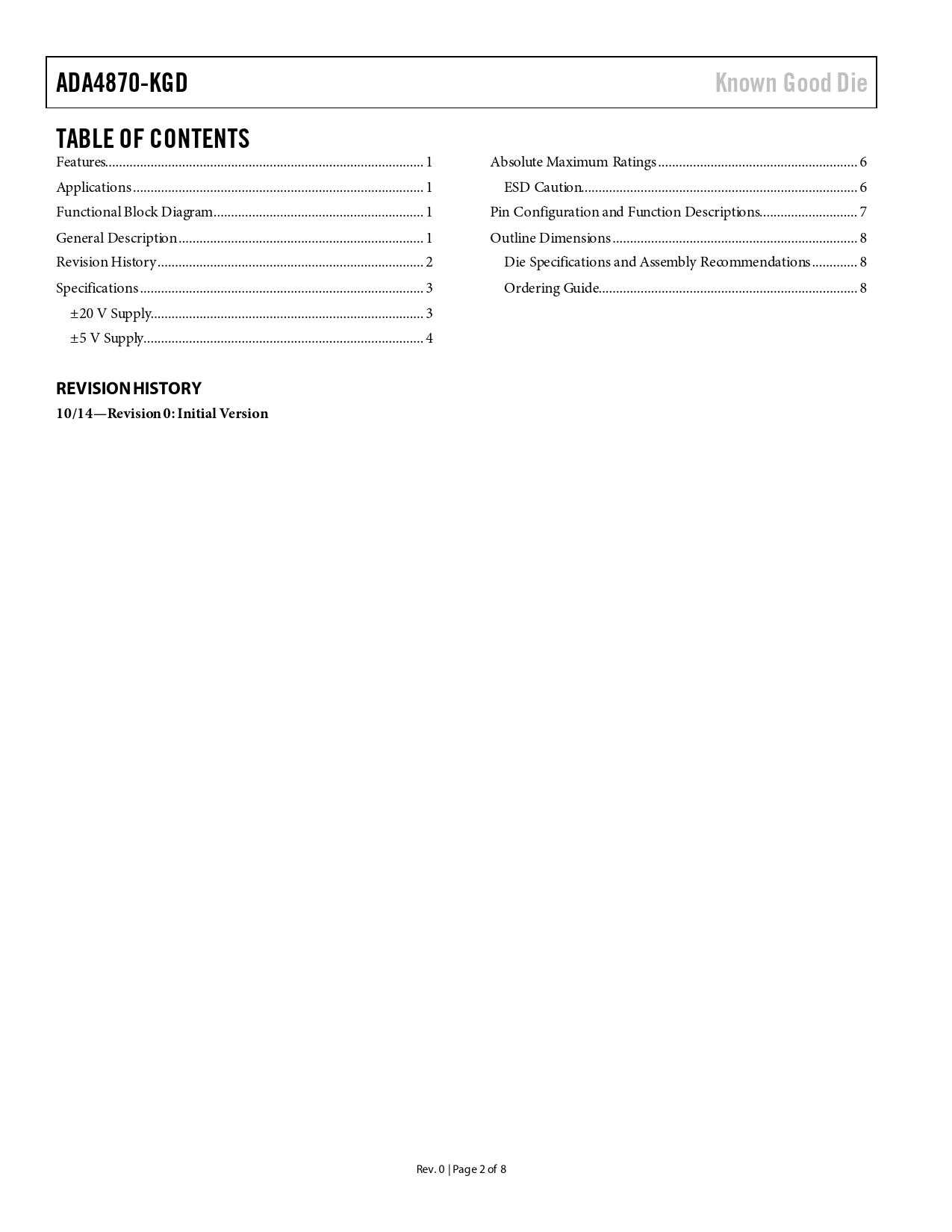 页数 / 页8 / 2 — ADA4870-KGD. Known Good Die. TABLE OF CONTENTS. REVISION HISTORY …