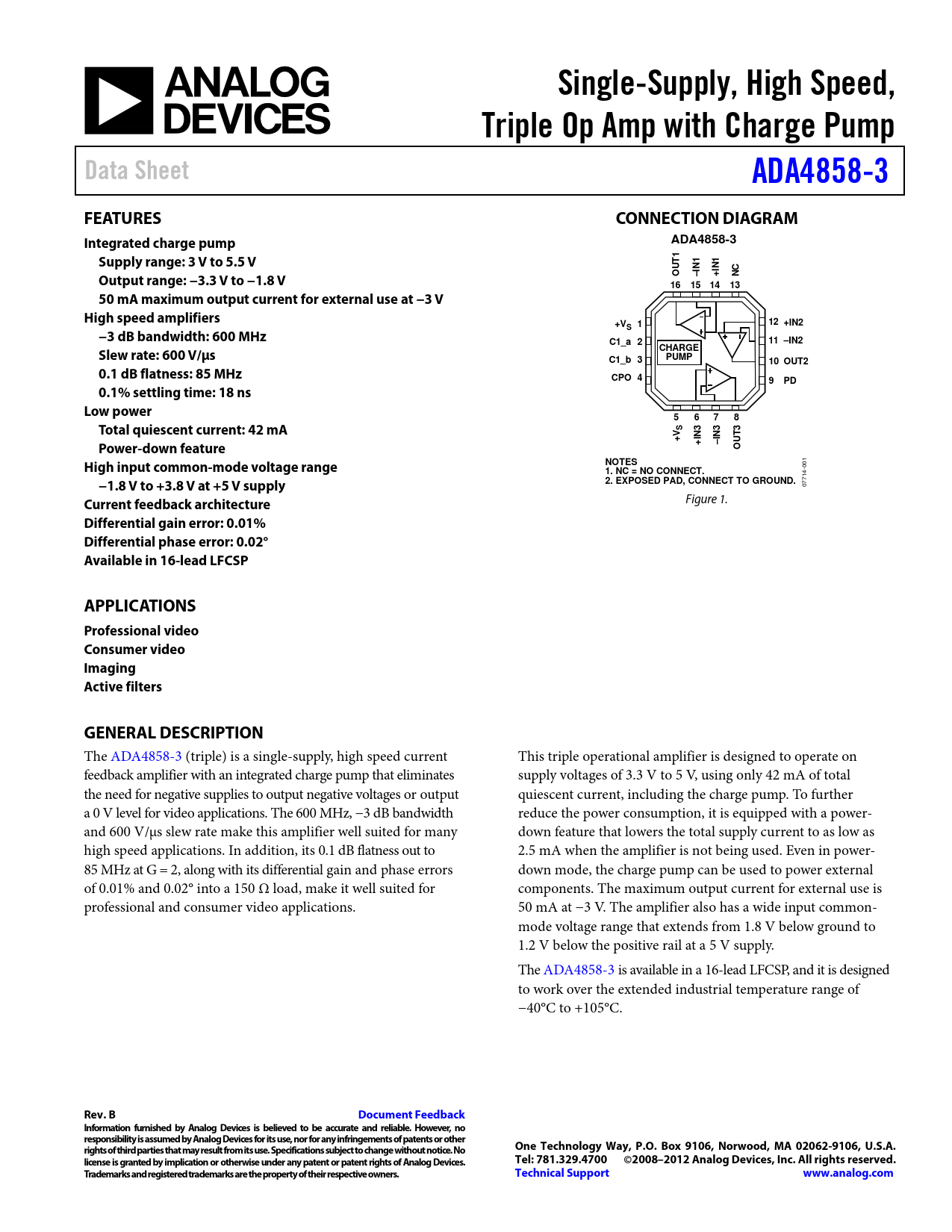 Single-Supply, High Speed,. Triple Op Amp with Charge Pump. Data Sheet. ADA4858-3. FEATURES. CONNECTION DIAGRAM