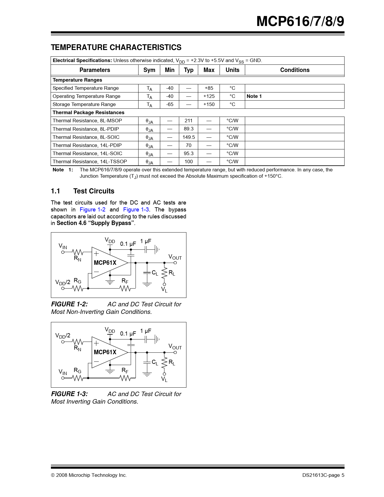 文件文字版本 link to page 5 link to page 5 link to page 5 link to page 17MCP616/7/8/9 TEMPERATURE CHARACTERISTICS Electrical Specifications: Unless otherwise indicated, VDD = +2.3V to +5.5V and VSS = GND.Parameters Sym Min Typ Max Units Conditions Temperature Ranges Specified Temperature Range TA -40 — +85 °C Operating Temperature Range TA -40 — +125 °CNote 1 Storage Temperature Range TA -65 — +150 °CThermal Package Resistances Thermal Resistance, 8L-MSOP θJA — 211 — °C/W Thermal Resistance, 8L-PDIP θJA — 89.3 — °C/W Thermal Resistance, 8L-SOIC θJA — 149.5 — °C/W Thermal Resistance, 14L-PDIP θJA — 70 — °C/W Thermal Resistance, 14L-SOIC θJA — 95.3 — °C/W Thermal Resistance, 14L-TSSOP θJA — 100 — °C/WNote 1: The MCP616/7/8/9 operate over this extended temperature range, but with reduced performance. In any case, the Junction Temperature (TJ) must not exceed the Absolute Maximum specification of +150°C.1.1 Test Circuits The test circuits used for the DC and AC tests are shown in Figure 1-2 and Figure 1-3. The bypass capacitors are laid out according to the rules discussed inSection 4.6 “Supply Bypass” . VDD 1 µF V 0.1 µF IN R V N OUTMCP61X CL RL R V G RF DD/2 VLFIGURE 1-2: AC and DC Test Circuit for Most Non-Inverting Gain Conditions. VDD 1 µF V 0.1 µF DD/2 R V N OUTMCP61X CL RL R V G RF IN VLFIGURE 1-3: AC and DC Test Circuit for Most Inverting Gain Conditions. © 2008 Microchip Technology Inc. DS21613C-page 5 Document Outline 1.0 Electrical Characteristics FIGURE 1-1: Timing Diagram for the CS Pin on the MCP618. 1.1 Test Circuits FIGURE 1-2: AC and DC Test Circuit for Most Non-Inverting Gain Conditions. FIGURE 1-3: AC and DC Test Circuit for Most Inverting Gain Conditions. 2.0 Typical Performance Curves FIGURE 2-1: Input Offset Voltage at VDD = 5.5V. FIGURE 2-2: Input Offset Voltage at VDD = 2.3V. FIGURE 2-3: Input Bias Current at VDD = 5.5V. FIGURE 2-4: Input Offset Voltage Drift at VDD = 5.5V. FIGURE 2-5: Input Offset Voltage Drift at VDD = 2.3V. FIGURE 2-6: Input Offset Current at VDD = 5.5V. FIGURE 2-7: Input Offset Voltage vs. Ambient Temperature. FIGURE 2-8: Quiescent Current vs. Ambient Temperature. FIGURE 2-9: Maximum Output Voltage Swing vs. Ambient Temperature at RL = 5 kW. FIGURE 2-10: Input Bias, Offset Currents vs. Ambient Temperature. FIGURE 2-11: CMRR, PSRR vs. Ambient Temperature. FIGURE 2-12: Maximum Output Voltage Swing vs. Ambient Temperature at RL = 25 kW. FIGURE 2-13: Output Short Circuit Current vs. Ambient Temperature. FIGURE 2-14: Slew Rate vs. Ambient Temperature. FIGURE 2-15: Input Bias, Offset Currents vs. Common Mode Input Voltage. FIGURE 2-16: Gain Bandwidth Product, Phase Margin vs. Ambient Temperature. FIGURE 2-17: Input Offset Voltage vs. Common Mode Input Voltage. FIGURE 2-18: Input Offset Voltage vs. Output Voltage. FIGURE 2-19: Quiescent Current vs. Power Supply Voltage. FIGURE 2-20: DC Open-Loop Gain vs. Load Resistance. FIGURE 2-21: Gain-Bandwidth Product, Phase Margin vs. Load Resistance. FIGURE 2-22: Output Voltage Headroom vs. Output Current Magnitude. FIGURE 2-23: DC Open-Loop Gain vs. Power Supply Voltage. FIGURE 2-24: Channel-to-Channel Separation vs. Frequency (MCP617 and MCP619 only). FIGURE 2-25: Open-Loop Gain, Phase vs. Frequency. FIGURE 2-26: Input Noise Voltage, Current Densities vs. Frequency. FIGURE 2-27: Small-Signal, Non-Inverting Pulse Response. FIGURE 2-28: CMRR, PSRR vs. Frequency. FIGURE 2-29: Maximum Output Voltage Swing vs. Frequency. FIGURE 2-30: Small-Signal, Inverting Pulse Response. FIGURE 2-31: Large-Signal, Non-Inverting Pulse Response. FIGURE 2-32: Chip Select (CS) to Amplifier Output Response Time (MCP618 only). FIGURE 2-33: The MCP616/7/8/9 Show No Phase Reversal. FIGURE 2-34: Large-Signal, Inverting Pulse Response. FIGURE 2-35: Chip Select (CS) Internal Hysteresis (MCP618 only). FIGURE 2-36: Measured Input Current vs. Input Voltage (below VSS). 3.0 Pin Descriptions TABLE 3-1: Pin Function Table 3.1 Analog Outputs 3.2 Analog Inputs 3.3 Chip Select Digital Input (CS) 3.4 Power Supply Pins (VDD, VSS) 4.0 Applications Information 4.1 Rail-to-Rail Inputs FIGURE 4-1: Simplified Analog Input ESD Structures. FIGURE 4-2: Protecting the Analog Inputs. 4.2 DC Offsets FIGURE 4-3: Example Circuit for Calculating DC Offset. FIGURE 4-4: Equivalent DC Circuit. 4.3 Rail-to-Rail Output 4.4 Capacitive Loads FIGURE 4-5: Output Resistor, RISO stabilizes large capacitive loads. FIGURE 4-6: Recommended RISO Values for Capacitive Loads. 4.5 MCP618 Chip Select (CS) 4.6 Supply Bypass 4.7 Unused Op Amps FIGURE 4-7: Unused Op Amps. 4.8 PCB Surface Leakage FIGURE 4-8: Example Guard Ring Layout for Inverting Gain. 4.9 Application Circuits FIGURE 4-9: High Gain Pre-amplifier. FIGURE 4-10: Two-Op Amp Instrumentation Amplifier. FIGURE 4-11: Three-Op Amp Instrumentation Amplifier. FIGURE 4-12: Precision Gain with Good Load Isolation. 5.0 Design Aids 5.1 SPICE Macro Model 5.2 Mindi™ Circuit Designer & Simulator 5.3 Microchip Advanced Part Selector (MAPS) 5.4 Analog Demonstration and Evaluation Boards 5.5 Application Notes 6.0 Packaging Information 6.1 Package Marking Information