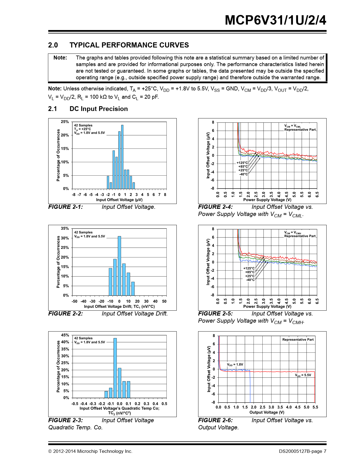 MCP6V31/1U/2/42.0TYPICAL PERFORMANCE CURVESNote: The graphs and tables provided following this note are a statistical summary based on a limited number of samples and are provided for informational purposes only. The performance characteristics listed herein are not tested or guaranteed. In some graphs or tables, the data presented may be outside the specified operating range (e.g., outside specified power supply range) and therefore outside the warranted range. Note: Unless otherwise indicated, TA = +25°C, VDD = +1.8V to 5.5V, VSS = GND, VCM = VDD/3, VOUT = VDD/2, VL = VDD/2, RL = 100 kΩ to VL and CL = 20 pF. 2.1DC Input Precision25%842 SamplesV= VCMCMLT = +25°CA6Representative Part6V= 1.8V and 5.5V20%DD(µV) 4e15%2oltag V 010%ffset+125°Cage of Occurrences-2O+85°C-4+25°C5%-40°CInputPercent-60%-8-8 -7 -6 -5 -4 -3 -2 -1 0 1 2 3 4 5 6 7 80.00.51.01.52.02.53.03.54.04.55.05.56.06.5Input Offset Voltage (µV)Power Supply Voltage (V)FIGURE 2-1: Input Offset Voltage. FIGURE 2-4: Input Offset Voltage vs. Power Supply Voltage with VCM = VCML. 35%842 SamplesV= VCMCMHV= 1.8V and 5.5VRepresentative Partp30%DD6(µV) 425%e220%oltag V 015%ffset+125°Cage of Occurrences-2O+85°CO8510%+25°C-4-40°CInputPercent 5%-60%-8-50 -40 -30 -20 -10010203040500.00.51.01.52.02.53.03.54.04.55.05.56.06.5Input Offset Voltage Drift; TC (nV/°C)Power Supply Voltage (V)1FIGURE 2-2: Input Offset Voltage Drift. FIGURE 2-5: Input Offset Voltage vs. Power Supply Voltage with VCM = VCMH. 45%842 SamplesRepresentative Part40%V= 1.8V and 5.5VDD635%4(µV)30%e225%oltagV= 1.8VDDV20%0V= 5.5V15%tage of Occurrencesffset -2DDnO10%-4Perce5%Input -60%-0.5 -0.4 -0.3 -0.2 -0.1 0.0 0.1 0.2 0.3 0.4 0.5-8Input Offset Voltage's Quadratic Temp Co;0.0 0.5 1.0 1.5 2.0 2.5 3.0 3.5 4.0 4.5 5.0 5.5TC (nV/°C2)Output Voltage (V)2FIGURE 2-3: Input Offset Voltage FIGURE 2-6: Input Offset Voltage vs. Quadratic Temp. Co. Output Voltage. 2012-2014 Microchip Technology Inc. DS20005127B-page 7 Document Outline 1.0 Electrical Characteristics 1.1 Absolute Maximum Ratings † 1.2 Specifications TABLE 1-1: DC Electrical Specifications TABLE 1-2: AC Electrical Specifications TABLE 1-3: Temperature Specifications 1.3 Timing Diagrams FIGURE 1-1: Amplifier Start Up. FIGURE 1-2: Offset Correction Settling Time. FIGURE 1-3: Output Overdrive Recovery. 1.4 Test Circuits FIGURE 1-4: AC and DC Test Circuit for Most Non-Inverting Gain Conditions. FIGURE 1-5: AC and DC Test Circuit for Most Inverting Gain Conditions. FIGURE 1-6: Test Circuit for Dynamic Input Behavior. 2.0 Typical Performance Curves 2.1 DC Input Precision FIGURE 2-1: Input Offset Voltage. FIGURE 2-2: Input Offset Voltage Drift. FIGURE 2-3: Input Offset Voltage Quadratic Temp. Co. FIGURE 2-4: Input Offset Voltage vs. Power Supply Voltage with VCM = VCML. FIGURE 2-5: Input Offset Voltage vs. Power Supply Voltage with VCM = VCMH. FIGURE 2-6: Input Offset Voltage vs. Output Voltage. FIGURE 2-7: Input Offset Voltage vs. Common Mode Voltage with VDD = 1.8V. FIGURE 2-8: Input Offset Voltage vs. Common Mode Voltage with VDD = 5.5V. FIGURE 2-9: CMRR. FIGURE 2-10: PSRR. FIGURE 2-11: DC Open-Loop Gain. FIGURE 2-12: CMRR and PSRR vs. Ambient Temperature. FIGURE 2-13: DC Open-Loop Gain vs. Ambient Temperature. FIGURE 2-14: Input Bias and Offset Currents vs. Common Mode Input Voltage with TA = +85°C. FIGURE 2-15: Input Bias and Offset Currents vs. Common Mode Input Voltage with TA = +125°C. FIGURE 2-16: Input Bias and Offset Currents vs. Ambient Temperature with VDD = +5.5V. FIGURE 2-17: Input Bias Current vs. Input Voltage (below VSS). 2.2 Other DC Voltages and Currents FIGURE 2-18: Input Common Mode Voltage Headroom (Range) vs. Ambient Temperature. FIGURE 2-19: Output Voltage Headroom vs. Output Current. FIGURE 2-20: Output Voltage Headroom vs. Ambient Temperature. FIGURE 2-21: Output Short Circuit Current vs. Power Supply Voltage. FIGURE 2-22: Supply Current vs. Power Supply Voltage. FIGURE 2-23: Power-on Reset Trip Voltage. FIGURE 2-24: Power-on Reset Voltage vs. Ambient Temperature. 2.3 Frequency Response FIGURE 2-25: CMRR and PSRR vs. Frequency. FIGURE 2-26: Open-Loop Gain vs. Frequency with VDD = 1.8V. FIGURE 2-27: Open-Loop Gain vs. Frequency with VDD = 5.5V. FIGURE 2-28: Gain Bandwidth Product and Phase Margin vs. Ambient Temperature. FIGURE 2-29: Gain Bandwidth Product and Phase Margin vs. Common Mode Input Voltage. FIGURE 2-30: Gain Bandwidth Product and Phase Margin vs. Output Voltage. FIGURE 2-31: Closed-Loop Output Impedance vs. Frequency with VDD = 1.8V. FIGURE 2-32: Closed-Loop Output Impedance vs. Frequency with VDD = 5.5V. FIGURE 2-33: Channel-to-Channel Separation vs. Frequency. FIGURE 2-34: Maximum Output Voltage Swing vs. Frequency. 2.4 Input Noise and Distortion FIGURE 2-35: Input Noise Voltage Density and Integrated Input Noise Voltage vs. Frequency. FIGURE 2-36: Input Noise Voltage Density vs. Input Common Mode Voltage. FIGURE 2-37: Inter-Modulation Distortion vs. Frequency with VCM Disturbance (see Figure 1-6). FIGURE 2-38: Inter-Modulation Distortion vs. Frequency with VDD Disturbance (see Figure 1-6). FIGURE 2-39: Input Noise vs. Time with 1 Hz and 10 Hz Filters and VDD = 1.8V. FIGURE 2-40: Input Noise vs. Time with 1 Hz and 10 Hz Filters and VDD = 5.5V. 2.5 Time Response FIGURE 2-41: Input Offset Voltage vs. Time with Temperature Change. FIGURE 2-42: Input Offset Voltage vs. Time at Power Up. FIGURE 2-43: The MCP6V31/1U/2/4 Family Shows No Input Phase Reversal with Overdrive. FIGURE 2-44: Non-inverting Small Signal Step Response. FIGURE 2-45: Non-inverting Large Signal Step Response. FIGURE 2-46: Inverting Small Signal Step Response. FIGURE 2-47: Inverting Large Signal Step Response. FIGURE 2-48: Slew Rate vs. Ambient Temperature. FIGURE 2-49: Output Overdrive Recovery vs. Time with G = -10 V/V. FIGURE 2-50: Output Overdrive Recovery Time vs. Inverting Gain. 3.0 Pin Descriptions TABLE 3-1: Pin Function Table 3.1 Analog Outputs 3.2 Analog Inputs 3.3 Power Supply Pins 3.4 Exposed Thermal