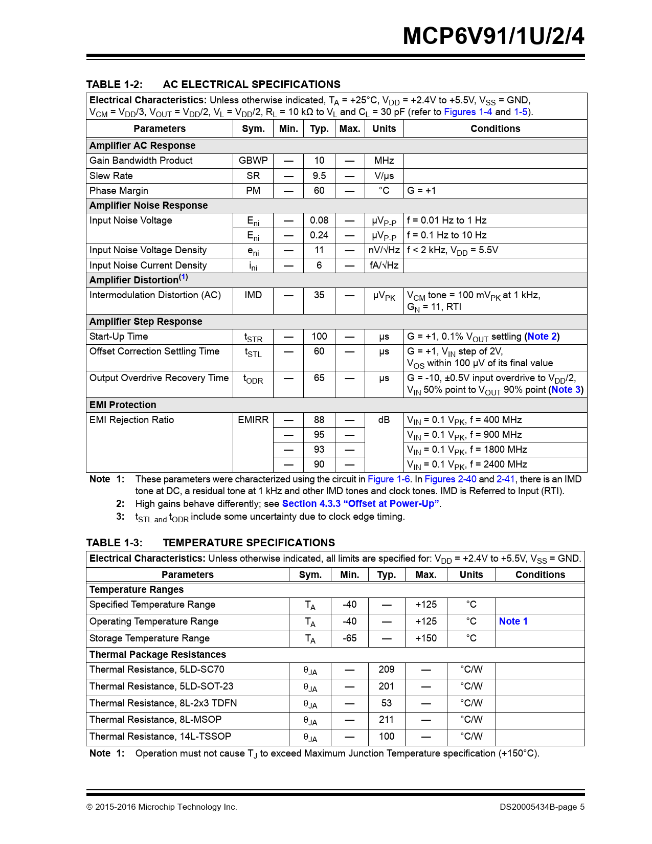 link to page 6 link to page 6 link to page 5 link to page 5 link to page 5 link to page 6 link to page 14 link to page 14 link to page 20 link to page 5 MCP6V91/1U/2/4TABLE 1-2:AC ELECTRICAL SPECIFICATIONSElectrical Characteristics: Unless otherwise indicated, TA = +25°C, VDD = +2.4V to +5.5V, VSS = GND, VCM = VDD/3, VOUT = VDD/2, VL = VDD/2, RL = 10 kΩ to VL and CL = 30 pF (refer to Figures 1-4 and 1-5). ParametersSym.Min.Typ. Max.UnitsConditionsAmplifier AC Response Gain Bandwidth Product GBWP — 10 — MHz Slew Rate SR — 9.5 — V/µs Phase Margin PM — 60 — °C G = +1 Amplifier Noise Response Input Noise Voltage Eni — 0.08 — µVP-P f = 0.01 Hz to 1 Hz Eni — 0.24 — µVP-P f = 0.1 Hz to 10 Hz Input Noise Voltage Density eni — 11 — nV/√Hz f < 2 kHz, VDD = 5.5V Input Noise Current Density ini — 6 — fA/√Hz Amplifier Distortion(1) Intermodulation Distortion (AC) IMD — 35 — µVPK VCM tone = 100 mVPK at 1 kHz, GN = 11, RTI Amplifier Step Response Start-Up Time tSTR — 100 — µs G = +1, 0.1% VOUT settling (Note 2) Offset Correction Settling Time tSTL — 60 — µs G = +1, VIN step of 2V, VOS within 100 µV of its final value Output Overdrive Recovery Time tODR — 65 — µs G = -10, ±0.5V input overdrive to VDD/2, VIN 50% point to VOUT 90% point (Note 3)EMI Protection EMI Rejection Ratio EMIRR — 88 — dB VIN = 0.1 VPK, f = 400 MHz — 95 — VIN = 0.1 VPK, f = 900 MHz — 93 — VIN = 0.1 VPK, f = 1800 MHz — 90 — VIN = 0.1 VPK, f = 2400 MHz Note 1: These parameters were characterized using the circuit in Figure 1-6. In Figures 2-40 and 2-41, there is an IMD tone at DC, a residual tone at 1 kHz and other IMD tones and clock tones. IMD is Referred to Input (RTI). 2: High gains behave differently; see Section 4.3.3 “Offset at Power-Up” . 3: tSTL and tODR include some uncertainty due to clock edge timing. TABLE 1-3:TEMPERATURE SPECIFICATIONSElectrical Characteristics: Unless otherwise indicated, all limits are specified for: VDD = +2.4V to +5.5V, VSS = GND. ParametersSym.Min.Typ.Max.UnitsConditionsTemperature Ranges Specified Temperature Range TA -40 — +125 °C Operating Temperature Range TA -40 — +125 °C Note 1 Storage Temperature Range TA -65 — +150 °C Thermal Package Resistances Thermal Resistance, 5LD-SC70 JA — 209 — °C/W Thermal Resistance, 5LD-SOT-23 JA — 201 — °C/W Thermal Resistance, 8L-2x3 TDFN JA — 53 — °C/W Thermal Resistance, 8L-MSOP JA — 211 — °C/W Thermal Resistance, 14L-TSSOP JA — 100 — °C/W Note 1: Operation must not cause TJ to exceed Maximum Junction Temperature specification (+150°C). 2015-2016 Microchip Technology Inc. DS20005434B-page 5 Document Outline 10 MHz, Zero-Drift Op Amps Features Typical Applications Design Aids Related Parts General Description Package Types Typical Application Circuit 1.0 Electrical Characteristics 1.1 Absolute Maximum Ratings 1.2 Specifications TABLE 1-1: DC Electrical Specifications TABLE 1-2: AC Electrical Specifications TABLE 1-3: Temperature Specifications 1.3 Timing Diagrams FIGURE 1-1: Amplifier Start-Up. FIGURE 1-2: Offset Correction Settling Time. FIGURE 1-3: Output Overdrive Recovery. 1.4 Test Circuits FIGURE 1-4: AC and DC Test Circuit for Most Noninverting Gain Conditions. FIGURE 1-5: AC and DC Test Circuit for Most Inverting Gain Conditions. FIGURE 1-6: Test Circuit for Dynamic Input Behavior. 2.0 Typical Performance Curves 2.1 DC Input Precision FIGURE 2-1: Input Offset Voltage. FIGURE 2-2: Input Offset Voltage Drift. FIGURE 2-3: Input Offset Voltage Quadratic Temperature Coefficient. FIGURE 2-4: Input Offset Voltage vs. Power Supply Voltage with VCM = VCML. FIGURE 2-5: Input Offset Voltage vs. Power Supply Voltage with VCM = VCMH. FIGURE 2-6: Input Offset Voltage vs. Output Voltage with VDD = 2.4V. FIGURE 2-7: Input Offset Voltage vs. Output Voltage with VDD = 5.5V. FIGURE 2-8: Input Offset Voltage vs. Common-Mode Voltage with VDD = 2.4V. FIGURE 2-9: Input Offset Voltage vs. Common-Mode Voltage with VDD = 5.5V. FIGURE 2-10: Common-Mode Rejection Ratio. FIGURE 2-11: Power Supply Rejection Ratio. FIGURE 2-12: DC Open-Loop Gain. FIGURE 2-13: CMRR and PSRR vs. Ambient Temperature. FIGURE 2-14: DC Open-Loop Gain vs. Ambient Temperature. FIGURE 2-15: Input Bias and Offset Currents vs. Common-Mode Input Voltage with TA = +85°C. FIGURE 2-16: Input Bias and Offset Currents vs. Common-Mode Input Voltage with TA = +125°C. FIGURE 2-17: Input Bias and Offset Currents vs. Ambient Temperature with VDD = 5.5V. FIGURE 2-18: Input Bias Current vs. Input Voltage (Below VSS). 2.2 Other DC Voltages and Currents FIGURE 2-19: Input Common-Mode Voltage Headroom (Range) vs. Ambient Temperature. FIGURE 2-20: Output Voltage Headroom vs. Output Current. FIGURE 2-21: Output Voltage Headroom vs. Ambient Temperature. FIGURE 2-22: Output Short-Circuit Current vs. Power Supply Voltage. FIGURE 2-23: Supply Current vs. Power Supply Voltage. FIGURE 2-24: Power-On Reset Trip Voltage. FIGURE 2-25: Power-On Reset Voltage vs. Ambient Temperature. 2.3 Frequency Response FIGURE 2-26: CMRR and PSRR vs. Frequency. FIGURE 2-27: Open-Loop Gain vs. Frequency with VDD = 2.4V. FIGURE 2-28: Open-Loop Gain vs. Frequency with VDD = 5.5V. FIGURE 2-29: Gain Bandwidth Product and Phase Margin vs. Ambient Temperature. FIGURE 2-30: Gain Bandwidth Product and Phase Margin vs. Common-Mode Input Voltage. FIGURE 2-31: Gain Bandwidth Product and Phase Margin vs. Output Voltage. FIGURE 2-32: Closed-Loop Output Impedance vs. Frequency with VDD = 2.2V. FIGURE 2-33: Closed-Loop Output Impedance vs. Frequency with VDD = 5.5V. FIGURE 2-34: Maximum Output Voltage Swing vs. Frequency. FIGURE 2-35: EMIRR vs. Frequency. FIGURE 2-36: EMIRR vs. Input Voltage. FIGURE 2-37: Channel-to Channel Separation vs. Frequency. 2.4 Input Noise and Distortion FIGURE 2-38: Input Noise Voltage Density and Integrated Input Noise Voltage vs. Frequency. FIGURE 2-39: Input Noise Voltage Density vs. Input Common-Mode Voltage. FIGURE 2-40: Int