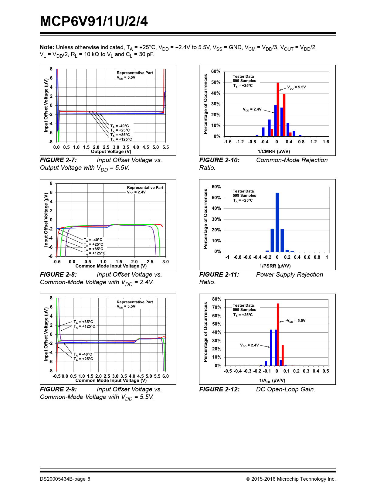 MCP6V91/1U/2/4Note: Unless otherwise indicated, TA = +25°C, VDD = +2.4V to 5.5V, VSS = GND, VCM = VDD/3, VOUT = VDD/2, VL = VDD/2, RL = 10 kΩ to VL and CL = 30 pF. 8Representative Part60%6V= 5.5VTester DataDD50%599 Samples(µV) 4T = +25ºCAV= 5.5VDDage40%2lt o030%et VV= 2.4VDDffs -220%-4put OT = -40°C10%AInT = +25°C-6APercentage of OccurrencesT = +85°CA0%T = +125°C-8A-1.6-1.2-0.8-0.400.40.81.21.60.0 0.5 1.0 1.5 2.0 2.5 3.0 3.5 4.0 4.5 5.0 5.5Output Voltage (V)1/CMRR (µV/V)FIGURE 2-7: Input Offset Voltage vs. FIGURE 2-10: Common-Mode Rejection Output Voltage with VDD = 5.5V. Ratio. 8Representative Part60%6V= 2.4VTester DataDD50%599 Samples(µV) 4T = +25ºCAage40%2lt oOccurrences030%et V ffs -220%-4put OT = -40°CA10%InT = +25°C-6AT = +85°CPercentage ofAT = +125°C0%-8A-1 -0.8 -0.6 -0.4 -0.200.2 0.4 0.6 0.81-0.50.00.51.01.52.02.53.0Common Mode Input Voltage (V)1/PSRR (µV/V)FIGURE 2-8: Input Offset Voltage vs. FIGURE 2-11: Power Supply Rejection Common-Mode Voltage with VDD = 2.4V. Ratio. 880%Representative Part6V= 5.5VTester DataDD70%599 Samples(µV) 460%T = +25ºCAT = +85°CV= 5.5VDDage 2A50%ltT = +125°CAo040%et V30%ffs -2V= 2.4VDD20%-4put OT = -40°CA10%InT = +25°C-6APercentage of Occurrences0%-8-0.5 -0.4 -0.3 -0.2 -0.100.1 0.2 0.3 0.4 0.5-0.5 0.0 0.5 1.0 1.5 2.0 2.5 3.0 3.5 4.0 4.5 5.0 5.5 6.0Common Mode Input Voltage (V)1/A(µV/V)OLFIGURE 2-9: Input Offset Voltage vs. FIGURE 2-12: DC Open-Loop Gain. Common-Mode Voltage with VDD = 5.5V. DS20005434B-page 8 2015-2016 Microchip Technology Inc. Document Outline 10 MHz, Zero-Drift Op Amps Features Typical Applications Design Aids Related Parts General Description Package Types Typical Application Circuit 1.0 Electrical Characteristics 1.1 Absolute Maximum Ratings 1.2 Specifications TABLE 1-1: DC Electrical Specifications TABLE 1-2: AC Electrical Specifications TABLE 1-3: Temperature Specifications 1.3 Timing Diagrams FIGURE 1-1: Amplifier Start-Up. FIGURE 1-2: Offset Correction Settling Time. FIGURE 1-3: Output Overdrive Recovery. 1.4 Test Circuits FIGURE 1-4: AC and DC Test Circuit for Most Noninverting Gain Conditions. FIGURE 1-5: AC and DC Test Circuit for Most Inverting Gain Conditions. FIGURE 1-6: Test Circuit for Dynamic Input Behavior. 2.0 Typical Performance Curves 2.1 DC Input Precision FIGURE 2-1: Input Offset Voltage. FIGURE 2-2: Input Offset Voltage Drift. FIGURE 2-3: Input Offset Voltage Quadratic Temperature Coefficient. FIGURE 2-4: Input Offset Voltage vs. Power Supply Voltage with VCM = VCML. FIGURE 2-5: Input Offset Voltage vs. Power Supply Voltage with VCM = VCMH. FIGURE 2-6: Input Offset Voltage vs. Output Voltage with VDD = 2.4V. FIGURE 2-7: Input Offset Voltage vs. Output Voltage with VDD = 5.5V. FIGURE 2-8: Input Offset Voltage vs. Common-Mode Voltage with VDD = 2.4V. FIGURE 2-9: Input Offset Voltage vs. Common-Mode Voltage with VDD = 5.5V. FIGURE 2-10: Common-Mode Rejection Ratio. FIGURE 2-11: Power Supply Rejection Ratio. FIGURE 2-12: DC Open-Loop Gain. FIGURE 2-13: CMRR and PSRR vs. Ambient Temperature. FIGURE 2-14: DC Open-Loop Gain vs. Ambient Temperature. FIGURE 2-15: Input Bias and Offset Currents vs. Common-Mode Input Voltage with TA = +85°C. FIGURE 2-16: Input Bias and Offset Currents vs. Common-Mode Input Voltage with TA = +125°C. FIGURE 2-17: Input Bias and Offset Currents vs. Ambient Temperature with VDD = 5.5V. FIGURE 2-18: Input Bias Current vs. Input Voltage (Below VSS). 2.2 Other DC Voltages and Currents FIGURE 2-19: Input Common-Mode Voltage Headroom (Range) vs. Ambient Temperature. FIGURE 2-20: Output Voltage Headroom vs. Output Current. FIGURE 2-21: Output Voltage Headroom vs. Ambient Temperature. FIGURE 2-22: Output Short-Circuit Current vs. Power Supply Voltage. FIGURE 2-23: Supply Current vs. Power Supply Voltage. FIGURE 2-24: Power-On Reset Trip Voltage. FIGURE 2-25: Power-On Reset Voltage vs. Ambient Temperature. 2.3 Frequency Response FIGURE 2-26: CMRR and PSRR vs. Frequency. FIGURE 2-27: Open-Loop Gain vs. Frequency with VDD = 2.4V. FIGURE 2-28: Open-Loop Gain vs. Frequency with VDD = 5.5V. FIGURE 2-29: Gain Bandwidth Product and Phase Margin vs. Ambient Temperature. FIGURE 2-30: Gain Bandwidth Product and Phase Margin vs. Common-Mode Input Voltage. FIGURE 2-31: Gain Bandwidth Product and Phase Margin vs. Output Voltage. FIGURE 2-32: Closed-Loop Output Impedance vs. Frequency with VDD = 2.2V. FIGURE 2-33: Closed-Loop Output Impedance vs. Frequency with VDD = 5.5V. FIGURE 2-34: Maximum Output Voltage Swing vs. Frequency. FIGURE 2-35: EMIRR vs. Frequency. FIGURE 2-36: EMIRR vs. Input Voltage. FIGURE 2-37: Channel-to Channel Separation vs. Frequency. 2.4 Input Noise and Distortion FIGURE 2-38: Input Noise Voltage Density and Integrated Input Noise Voltage vs. Frequency. FIGURE 2-39: Input Noise Voltage Density vs. Input Common-Mode Voltage. FIGURE 2-40: Intermodulation Distortion vs. Frequency with VCM Disturbance (see Figure 1-6). FIGURE 2-41: Intermodulation Distortion vs. Frequency with VDD Disturbance (see Figure 1-6). FIGURE 2-42: Input Noise vs. Time with 1 Hz and 10 Hz Filters and VDD = 2.4V. FIGURE 2-43: Input Noise vs. Time with 1 Hz and 10 Hz Filters and VDD = 5.5V. 2.5 Time Response FIGURE 2-44: Input Offset Voltage vs. Time with Temperature Change. FIGURE 2-45: Input Offset Voltage vs. Time at Power-Up. FIGURE 2-46: The MCP6V91/1U/2/4 Family Shows No Input Phase Reversal with Overdrive. FIGURE 2-47: Noninverting Small Signal Step Response. FIGURE 2-48: Noninverting Large Signal Step Response. FIGURE 2-49: Inverting Small Signal Step Response. FIGURE 2-50: Inverting Large Signal Step Response. FIGURE 2-51: Slew Rate vs. Ambient Temperature. FIGURE 2-52: Output Overdrive Recovery vs. Time with G = -10 V/V. FIGURE 2-53: Output Overdrive Recovery Time vs. Inverting Gain. 3.0 Pin Descriptions TABLE 3-1: Pin Function Table 3.1 Analog Outputs (VOUT, VOUTA, VOUTB, VOUTC, VOUTD) 3.2 Analog Inputs (VIN+, VIN-, VINB+, VINB-, VINC-, VINC+, VIND-, VIND+) 3.3 Power Supply Pins (VDD, VS