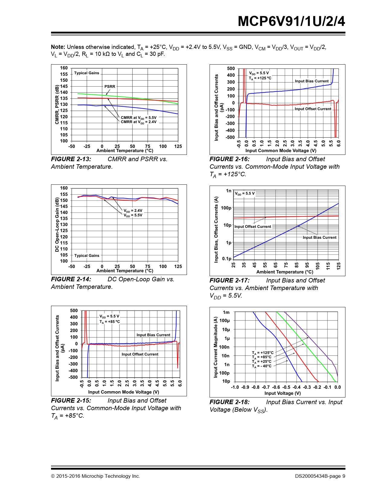 MCP6V91/1U/2/4Note: Unless otherwise indicated, TA = +25°C, VDD = +2.4V to 5.5V, VSS = GND, VCM = VDD/3, VOUT = VDD/2, VL = VDD/2, RL = 10 kΩ to VL and CL = 30 pF. 160500155Typical GainsV= 5.5 V400DD150T = +125 ºCA300Input Bias Current145PSRR200(dB) 140Currents100135fset1300PSRR 125-100(pA)Input Offset CurrentRR, 120CMRR at V= 5.5V-200DDCM 115CMRR at V= 2.4VDD-300110Bias and Of-400105-500100Input0505050505050-50-250255075100125-0.50.0.1.1.2.2.3.3.4.4.5.5.6.Ambient Temperature (°C)Input Common Mode Voltage (V)FIGURE 2-13: CMRR and PSRR vs. FIGURE 2-16: Input Bias and Offset Ambient Temperature. Currents vs. Common-Mode Input Voltage with TA = +125°C. 1601n155V= 5.5 VDD150 145100p140V= 2.4VDDV= 5.5VDD135 13010p Input Offset Current125 120Offset Currents (A)Input Bias Current1151p110DC Open-Loop Gain (dB)105Typical Gains0.1p100Input Bias,-50-2502550751001252535455565758595105115125Ambient Temperature (°C)Ambient Temperature (°C)FIGURE 2-14: DC Open-Loop Gain vs. FIGURE 2-17: Input Bias and Offset Ambient Temperature. Currents vs. Ambient Temperature with VDD = 5.5V. 5001m400V= 5.5 VDDT = +85 ºC100µ300A20010µtude (A)Input Bias Current1001µ)0Offset Currents100n(pA-100Input Offset CurrentT = +125°CA-20010nT = +85°CAT = +25°C-300A1nT = - 40°CA-400put Current Magni 100p-500InInput Bias and.510p-00.00.51.01.52.02.53.03.54.04.55.05.56.0-1.0 -0.9 -0.8 -0.7 -0.6 -0.5 -0.4 -0.3 -0.2 -0.1 0.0Input Common Mode Voltage (V)Input Voltage (V)FIGURE 2-15: Input Bias and Offset FIGURE 2-18: Input Bias Current vs. Input Currents vs. Common-Mode Input Voltage with Voltage (Below VSS). TA = +85°C. 2015-2016 Microchip Technology Inc. DS20005434B-page 9 Document Outline 10 MHz, Zero-Drift Op Amps Features Typical Applications Design Aids Related Parts General Description Package Types Typical Application Circuit 1.0 Electrical Characteristics 1.1 Absolute Maximum Ratings 1.2 Specifications TABLE 1-1: DC Electrical Specifications TABLE 1-2: AC Electrical Specifications TABLE 1-3: Temperature Specifications 1.3 Timing Diagrams FIGURE 1-1: Amplifier Start-Up. FIGURE 1-2: Offset Correction Settling Time. FIGURE 1-3: Output Overdrive Recovery. 1.4 Test Circuits FIGURE 1-4: AC and DC Test Circuit for Most Noninverting Gain Conditions. FIGURE 1-5: AC and DC Test Circuit for Most Inverting Gain Conditions. FIGURE 1-6: Test Circuit for Dynamic Input Behavior. 2.0 Typical Performance Curves 2.1 DC Input Precision FIGURE 2-1: Input Offset Voltage. FIGURE 2-2: Input Offset Voltage Drift. FIGURE 2-3: Input Offset Voltage Quadratic Temperature Coefficient. FIGURE 2-4: Input Offset Voltage vs. Power Supply Voltage with VCM = VCML. FIGURE 2-5: Input Offset Voltage vs. Power Supply Voltage with VCM = VCMH. FIGURE 2-6: Input Offset Voltage vs. Output Voltage with VDD = 2.4V. FIGURE 2-7: Input Offset Voltage vs. Output Voltage with VDD = 5.5V. FIGURE 2-8: Input Offset Voltage vs. Common-Mode Voltage with VDD = 2.4V. FIGURE 2-9: Input Offset Voltage vs. Common-Mode Voltage with VDD = 5.5V. FIGURE 2-10: Common-Mode Rejection Ratio. FIGURE 2-11: Power Supply Rejection Ratio. FIGURE 2-12: DC Open-Loop Gain. FIGURE 2-13: CMRR and PSRR vs. Ambient Temperature. FIGURE 2-14: DC Open-Loop Gain vs. Ambient Temperature. FIGURE 2-15: Input Bias and Offset Currents vs. Common-Mode Input Voltage with TA = +85°C. FIGURE 2-16: Input Bias and Offset Currents vs. Common-Mode Input Voltage with TA = +125°C. FIGURE 2-17: Input Bias and Offset Currents vs. Ambient Temperature with VDD = 5.5V. FIGURE 2-18: Input Bias Current vs. Input Voltage (Below VSS). 2.2 Other DC Voltages and Currents FIGURE 2-19: Input Common-Mode Voltage Headroom (Range) vs. Ambient Temperature. FIGURE 2-20: Output Voltage Headroom vs. Output Current. FIGURE 2-21: Output Voltage Headroom vs. Ambient Temperature. FIGURE 2-22: Output Short-Circuit Current vs. Power Supply Voltage. FIGURE 2-23: Supply Current vs. Power Supply Voltage. FIGURE 2-24: Power-On Reset Trip Voltage. FIGURE 2-25: Power-On Reset Voltage vs. Ambient Temperature. 2.3 Frequency Response FIGURE 2-26: CMRR and PSRR vs. Frequency. FIGURE 2-27: Open-Loop Gain vs. Frequency with VDD = 2.4V. FIGURE 2-28: Open-Loop Gain vs. Frequency with VDD = 5.5V. FIGURE 2-29: Gain Bandwidth Product and Phase Margin vs. Ambient Temperature. FIGURE 2-30: Gain Bandwidth Product and Phase Margin vs. Common-Mode Input Voltage. FIGURE 2-31: Gain Bandwidth Product and Phase Margin vs. Output Voltage. FIGURE 2-32: Closed-Loop Output Impedance vs. Frequency with VDD = 2.2V. FIGURE 2-33: Closed-Loop Output Impedance vs. Frequency with VDD = 5.5V. FIGURE 2-34: Maximum Output Voltage Swing vs. Frequency. FIGURE 2-35: EMIRR vs. Frequency. FIGURE 2-36: EMIRR vs. Input Voltage. FIGURE 2-37: Channel-to Channel Separation vs. Frequency. 2.4 Input Noise and Distortion FIGURE 2-38: Input Noise Voltage Density and Integrated Input Noise Voltage vs. Frequency. FIGURE 2-39: Input Noise Voltage Density vs. Input Common-Mode Voltage. FIGURE 2-40: Intermodulation Distortion vs. Frequency with VCM Disturbance (see Figure 1-6). FIGURE 2-41: Intermodulation Distortion vs. Frequency with VDD Disturbance (see Figure 1-6). FIGURE 2-42: Input Noise vs. Time with 1 Hz and 10 Hz Filters and VDD = 2.4V. FIGURE 2-43: Input Noise vs. Time with 1 Hz and 10 Hz Filters and VDD = 5.5V. 2.5 Time Response FIGURE 2-44: Input Offset Voltage vs. Time with Temperature Change. FIGURE 2-45: Input Offset Voltage vs. Time at Power-Up. FIGURE 2-46: The MCP6V91/1U/2/4 Family Shows No Input Phase Reversal with Overdrive. FIGURE 2-47: Noninverting Small Signal Step Response. FIGURE 2-48: Noninverting Large Signal Step Response. FIGURE 2-49: Inverting Small Signal Step Response. FIGURE 2-50: Inverting Large Signal Step Response. FIGURE 2-51: Slew Rate vs. Ambient Temperature. FIGURE 2-52: Output Overdrive Recovery vs. Time with G = -10 V/V. FIGURE 2-53: Output Overdrive Recovery Time vs. Inverting Gain. 3.0 Pin Descriptions TABLE 3-1: Pin Function Table 3.1 Analog Out