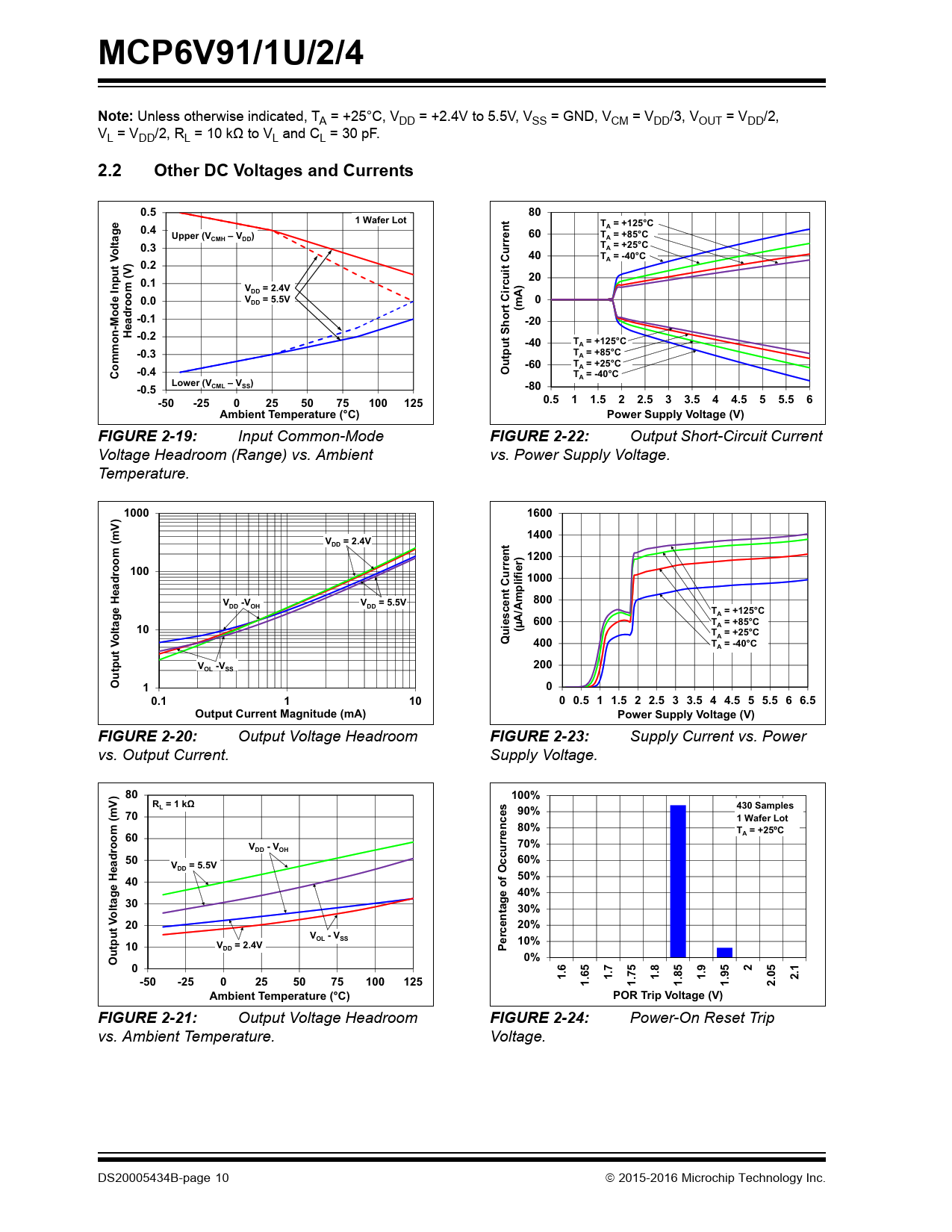MCP6V91/1U/2/4Note: Unless otherwise indicated, TA = +25°C, VDD = +2.4V to 5.5V, VSS = GND, VCM = VDD/3, VOUT = VDD/2, VL = VDD/2, RL = 10 kΩ to VL and CL = 30 pF. 2.2Other DC Voltages and Currents0.5801 Wafer LotT = +125°C0.4AUpper (V– V)60T = +85°CCMHDDA0.3T = +25°ColtageA40T = -40°CA0.2put V200.1nV= 2.4Vrcuit Current)DD0.0V= 5.5V0DD(mA-0.1-20Headroom (V) -0.2-40T = +125°CA-0.3T = +85°CA-60T = +25°CA-0.4Common-Mode IOutput Short CiT = -40°CALower (V– V )-0.5CMLSS-80-50-2502550751001250.511.522.533.544.555.56Ambient Temperature (°C)Power Supply Voltage (V)FIGURE 2-19: Input Common-Mode FIGURE 2-22: Output Short-Circuit Current Voltage Headroom (Range) vs. Ambient vs. Power Supply Voltage. Temperature. 100016001400(mV)V= 2.4VDD1200100er) ifi 1000V-VV= 5.5V800DDOHDDT = +125°CA600T = +85°CAltage Headroom10(µA/AmploT = +25°CQuiescent CurrentA400T = -40°CAV-V200OLSSOutput V100.11100 0.5 1 1.5 2 2.5 3 3.5 4 4.5 5 5.5 6 6.5Output Current Magnitude (mA)Power Supply Voltage (V)FIGURE 2-20: Output Voltage Headroom FIGURE 2-23: Supply Current vs. Power vs. Output Current. Supply Voltage. 80100%R = 1 kȍL430 Samples90%(mV) 701 Wafer Lot80%T = +25ºC60AV- V70%DDOH5060%V= 5.5VDD50%4040%30ltage Headroom30%o20t V20%V- VOLSStpu10%10V= 2.4VDDPercentage of OccurrencesOu0%021.61.71.81.92.1-50-2502550751001251.651.751.851.952.05Ambient Temperature (°C)POR Trip Voltage (V)FIGURE 2-21: Output Voltage Headroom FIGURE 2-24: Power-On Reset Trip vs. Ambient Temperature. Voltage. DS20005434B-page 10 2015-2016 Microchip Technology Inc. Document Outline 10 MHz, Zero-Drift Op Amps Features Typical Applications Design Aids Related Parts General Description Package Types Typical Application Circuit 1.0 Electrical Characteristics 1.1 Absolute Maximum Ratings 1.2 Specifications TABLE 1-1: DC Electrical Specifications TABLE 1-2: AC Electrical Specifications TABLE 1-3: Temperature Specifications 1.3 Timing Diagrams FIGURE 1-1: Amplifier Start-Up. FIGURE 1-2: Offset Correction Settling Time. FIGURE 1-3: Output Overdrive Recovery. 1.4 Test Circuits FIGURE 1-4: AC and DC Test Circuit for Most Noninverting Gain Conditions. FIGURE 1-5: AC and DC Test Circuit for Most Inverting Gain Conditions. FIGURE 1-6: Test Circuit for Dynamic Input Behavior. 2.0 Typical Performance Curves 2.1 DC Input Precision FIGURE 2-1: Input Offset Voltage. FIGURE 2-2: Input Offset Voltage Drift. FIGURE 2-3: Input Offset Voltage Quadratic Temperature Coefficient. FIGURE 2-4: Input Offset Voltage vs. Power Supply Voltage with VCM = VCML. FIGURE 2-5: Input Offset Voltage vs. Power Supply Voltage with VCM = VCMH. FIGURE 2-6: Input Offset Voltage vs. Output Voltage with VDD = 2.4V. FIGURE 2-7: Input Offset Voltage vs. Output Voltage with VDD = 5.5V. FIGURE 2-8: Input Offset Voltage vs. Common-Mode Voltage with VDD = 2.4V. FIGURE 2-9: Input Offset Voltage vs. Common-Mode Voltage with VDD = 5.5V. FIGURE 2-10: Common-Mode Rejection Ratio. FIGURE 2-11: Power Supply Rejection Ratio. FIGURE 2-12: DC Open-Loop Gain. FIGURE 2-13: CMRR and PSRR vs. Ambient Temperature. FIGURE 2-14: DC Open-Loop Gain vs. Ambient Temperature. FIGURE 2-15: Input Bias and Offset Currents vs. Common-Mode Input Voltage with TA = +85°C. FIGURE 2-16: Input Bias and Offset Currents vs. Common-Mode Input Voltage with TA = +125°C. FIGURE 2-17: Input Bias and Offset Currents vs. Ambient Temperature with VDD = 5.5V. FIGURE 2-18: Input Bias Current vs. Input Voltage (Below VSS). 2.2 Other DC Voltages and Currents FIGURE 2-19: Input Common-Mode Voltage Headroom (Range) vs. Ambient Temperature. FIGURE 2-20: Output Voltage Headroom vs. Output Current. FIGURE 2-21: Output Voltage Headroom vs. Ambient Temperature. FIGURE 2-22: Output Short-Circuit Current vs. Power Supply Voltage. FIGURE 2-23: Supply Current vs. Power Supply Voltage. FIGURE 2-24: Power-On Reset Trip Voltage. FIGURE 2-25: Power-On Reset Voltage vs. Ambient Temperature. 2.3 Frequency Response FIGURE 2-26: CMRR and PSRR vs. Frequency. FIGURE 2-27: Open-Loop Gain vs. Frequency with VDD = 2.4V. FIGURE 2-28: Open-Loop Gain vs. Frequency with VDD = 5.5V. FIGURE 2-29: Gain Bandwidth Product and Phase Margin vs. Ambient Temperature. FIGURE 2-30: Gain Bandwidth Product and Phase Margin vs. Common-Mode Input Voltage. FIGURE 2-31: Gain Bandwidth Product and Phase Margin vs. Output Voltage. FIGURE 2-32: Closed-Loop Output Impedance vs. Frequency with VDD = 2.2V. FIGURE 2-33: Closed-Loop Output Impedance vs. Frequency with VDD = 5.5V. FIGURE 2-34: Maximum Output Voltage Swing vs. Frequency. FIGURE 2-35: EMIRR vs. Frequency. FIGURE 2-36: EMIRR vs. Input Voltage. FIGURE 2-37: Channel-to Channel Separation vs. Frequency. 2.4 Input Noise and Distortion FIGURE 2-38: Input Noise Voltage Density and Integrated Input Noise Voltage vs. Frequency. FIGURE 2-39: Input Noise Voltage Density vs. Input Common-Mode Voltage. FIGURE 2-40: Intermodulation Distortion vs. Frequency with VCM Disturbance (see Figure 1-6). FIGURE 2-41: Intermodulation Distortion vs. Frequency with VDD Disturbance (see Figure 1-6). FIGURE 2-42: Input Noise vs. Time with 1 Hz and 10 Hz Filters and VDD = 2.4V. FIGURE 2-43: Input Noise vs. Time with 1 Hz and 10 Hz Filters and VDD = 5.5V. 2.5 Time Response FIGURE 2-44: Input Offset Voltage vs. Time with Temperature Change. FIGURE 2-45: Input Offset Voltage vs. Time at Power-Up. FIGURE 2-46: The MCP6V91/1U/2/4 Family Shows No Input Phase Reversal with Overdrive. FIGURE 2-47: Noninverting Small Signal Step Response. FIGURE 2-48: Noninverting Large Signal Step Response. FIGURE 2-49: Inverting Small Signal Step Response. FIGURE 2-50: Inverting Large Signal Step Response. FIGURE 2-51: Slew Rate vs. Ambient Temperature. FIGURE 2-52: Output Overdrive Recovery vs. Time with G = -10 V/V. FIGURE 2-53: Output Overdrive Recovery Time vs. Inverting Gain. 3.0 Pin Descriptions TABLE 3-1: Pin Function Table 3.1 Analog Outputs (VOUT, VOUTA, VOUTB, VOUTC, VOUTD) 3.2 Analog Inputs (VIN+, VIN-, VINB+, VINB-, VINC-, VINC+, VIND-, VIND+) 3.3 