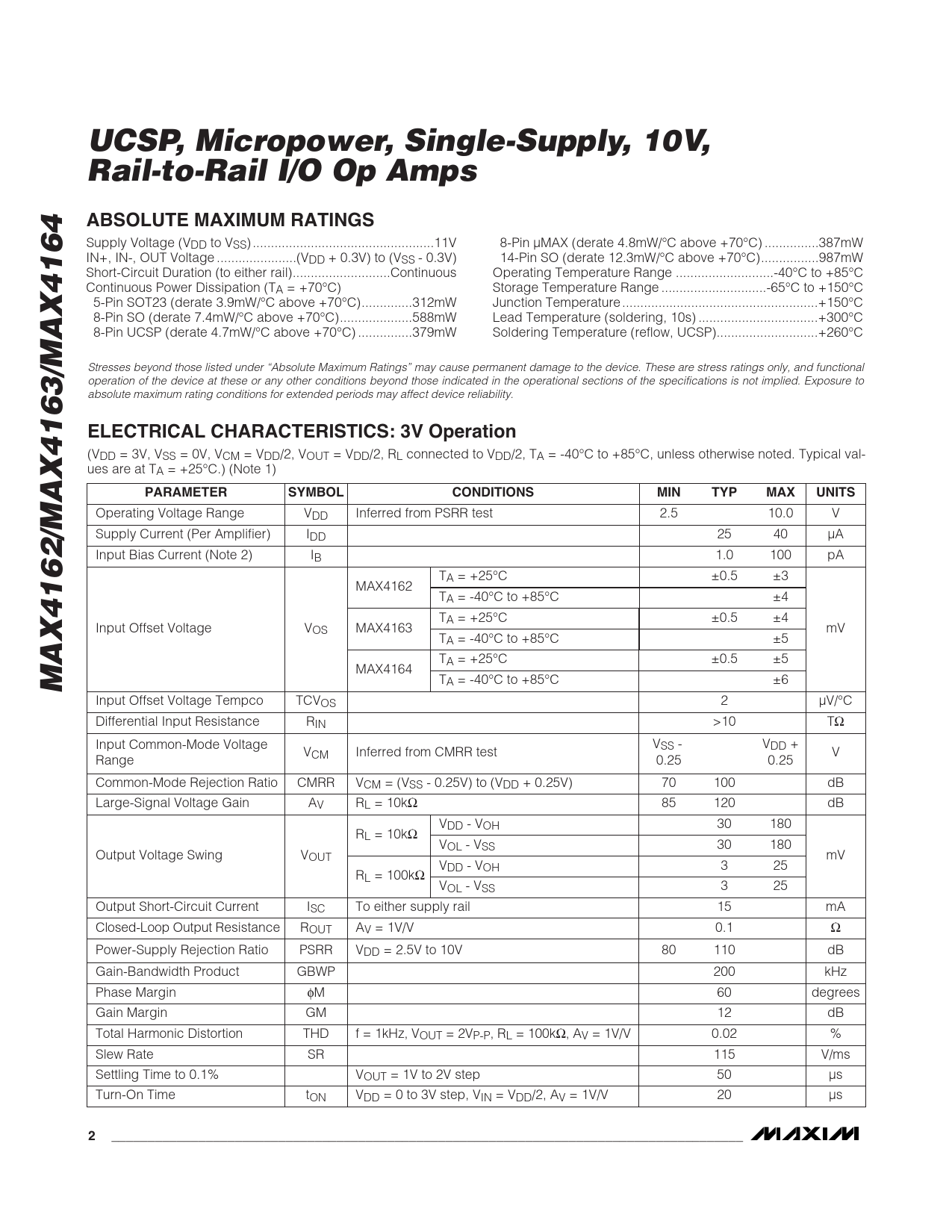 UCSP, Micropower, Single-Supply, 10V, Rail-to-Rail I/O Op AmpsABSOLUTE MAXIMUM RATINGS Supply Voltage (VDD to VSS) ..11V 8-Pin µMAX (derate 4.8mW/°C above +70°C) ...387mW IN+, IN-, OUT Voltage ..(VDD + 0.3V) to (VSS - 0.3V) 14-Pin SO (derate 12.3mW/°C above +70°C)..987mW Short-Circuit Duration (to either rail)...Continuous Operating Temperature Range ...-40°C to +85°C Continuous Power Dissipation (TA = +70°C) Storage Temperature Range ...-65°C to +150°C 5-Pin SOT23 (derate 3.9mW/°C above +70°C)..312mW Junction Temperature ..+150°C 8-Pin SO (derate 7.4mW/°C above +70°C)..588mW Lead Temperature (soldering, 10s) ...+300°C 8-Pin UCSP (derate 4.7mW/°C above +70°C) ...379mW Soldering Temperature (reflow, UCSP)..+260°C Stresses beyond those listed under “Absolute Maximum Ratings” may cause permanent damage to the device. These are stress ratings only, and functional operation of the device at these or any other conditions beyond those indicated in the operational sections of the specifications is not implied. Exposure to absolute maximum rating conditions for extended periods may affect device reliability. ELECTRICAL CHARACTERISTICS: 3V Operation (VDD = 3V, VSS = 0V, VCM = VDD/2, VOUT = VDD/2, RL connected to VDD/2, TA = -40°C to +85°C, unless otherwise noted. Typical val- ues are at TA = +25°C.) (Note 1) PARAMETERSYMBOLCONDITIONSMINTYPMAXUNITS Operating Voltage Range VDD Inferred from PSRR test 2.5 10.0 V Supply Current (Per Amplifier) IDD 25 40 µA Input Bias Current (Note 2) IB 1.0 100 pA TA = +25°C ±0.5 ±3 MAX4162 TA = -40°C to +85°C ±4 TA = +25°C ±0.5 ±4 Input Offset Voltage VOS MAX4163 mV TA = -40°C to +85°C ±5 TA = +25°C ±0.5 ±5 MAX4164 MAX4162/MAX4163/MAX4164 TA = -40°C to +85°C ±6 Input Offset Voltage Tempco TCVOS 2 µV/°C Differential Input Resistance RIN >10 TΩ Input Common-Mode Voltage VSS - VDD + VCM Inferred from CMRR test V Range 0.25 0.25 Common-Mode Rejection Ratio CMRR VCM = (VSS - 0.25V) to (VDD + 0.25V) 70 100 dB Large-Signal Voltage Gain AV RL = 10kΩ 85 120 dB VDD - VOH 30 180 RL = 10kΩ VOL - VSS 30 180 Output Voltage Swing VOUT mV VDD - VOH 3 25 RL = 100kΩ VOL - VSS 3 25 Output Short-Circuit Current ISC To either supply rail 15 mA Closed-Loop Output Resistance ROUT AV = 1V/V 0.1 Ω Power-Supply Rejection Ratio PSRR VDD = 2.5V to 10V 80 110 dB Gain-Bandwidth Product GBWP 200 kHz Phase Margin φM 60 degrees Gain Margin GM 12 dB Total Harmonic Distortion THD f = 1kHz, VOUT = 2VP-P, RL = 100kΩ, AV = 1V/V 0.02 % Slew Rate SR 115 V/ms Settling Time to 0.1% VOUT = 1V to 2V step 50 µs Turn-On Time tON VDD = 0 to 3V step, VIN = VDD/2, AV = 1V/V 20 µs 2_______________________________________________________________________________________