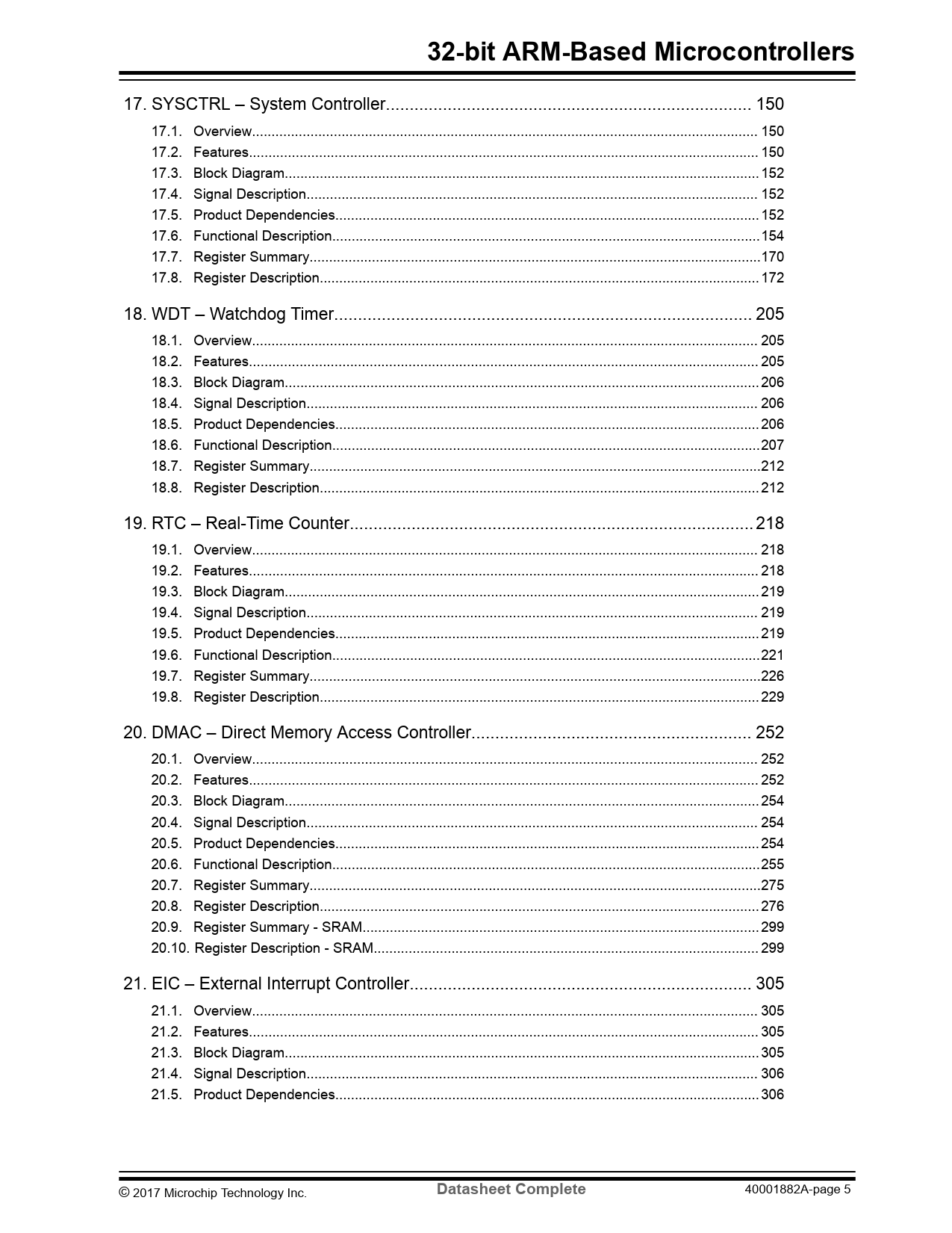 17. SYSCTRL – System Controller... 150 17.1. Overview.. 150 17.2. Features... 150 17.3. Block Diagram.. 152 17.4. Signal Description.. 152 17.5. Product Dependencies... 152 17.6. Functional Description..154 17.7. Register Summary..170 17.8. Register Description... 172 18. WDT – Watchdog Timer.. 205 18.1. Overview.. 205 18.2. Features... 205 18.3. Block Diagram.. 206 18.4. Signal Description.. 206 18.5. Product Dependencies... 206 18.6. Functional Description..207 18.7. Register Summary..212 18.8. Register Description... 212 19. RTC – Real-Time Counter... 218 19.1. Overview.. 218 19.2. Features... 218 19.3. Block Diagram.. 219 19.4. Signal Description.. 219 19.5. Product Dependencies... 219 19.6. Functional Description..221 19.7. Register Summary..226 19.8. Register Description... 229 20. DMAC – Direct Memory Access Controller... 252 20.1. Overview.. 252 20.2. Features... 252 20.3. Block Diagram.. 254 20.4. Signal Description.. 254 20.5. Product Dependencies... 254 20.6. Functional Description..255 20.7. Register Summary..275 20.8. Register Description... 276 20.9. Register Summary - SRAM.. 299 20.10. Register Description - SRAM... 299 21. EIC – External Interrupt Controller.. 305 21.1. Overview.. 305 21.2. Features... 305 21.3. Block Diagram.. 305 21.4. Signal Description.. 306 21.5. Product Dependencies... 306 © 2017 Microchip Technology Inc.