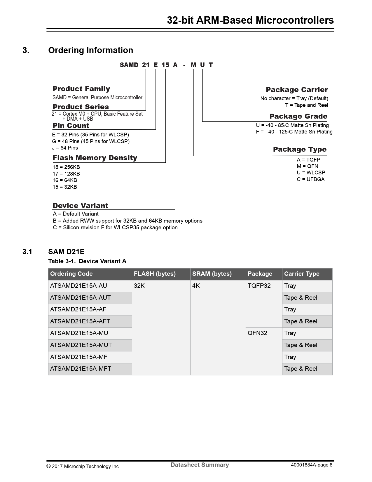 32-bit ARM-Based Microcontrollers. Ordering Information. 3.1. SAM D21E Table 3-1. Device Variant A. Ordering Code. FLASH (bytes)