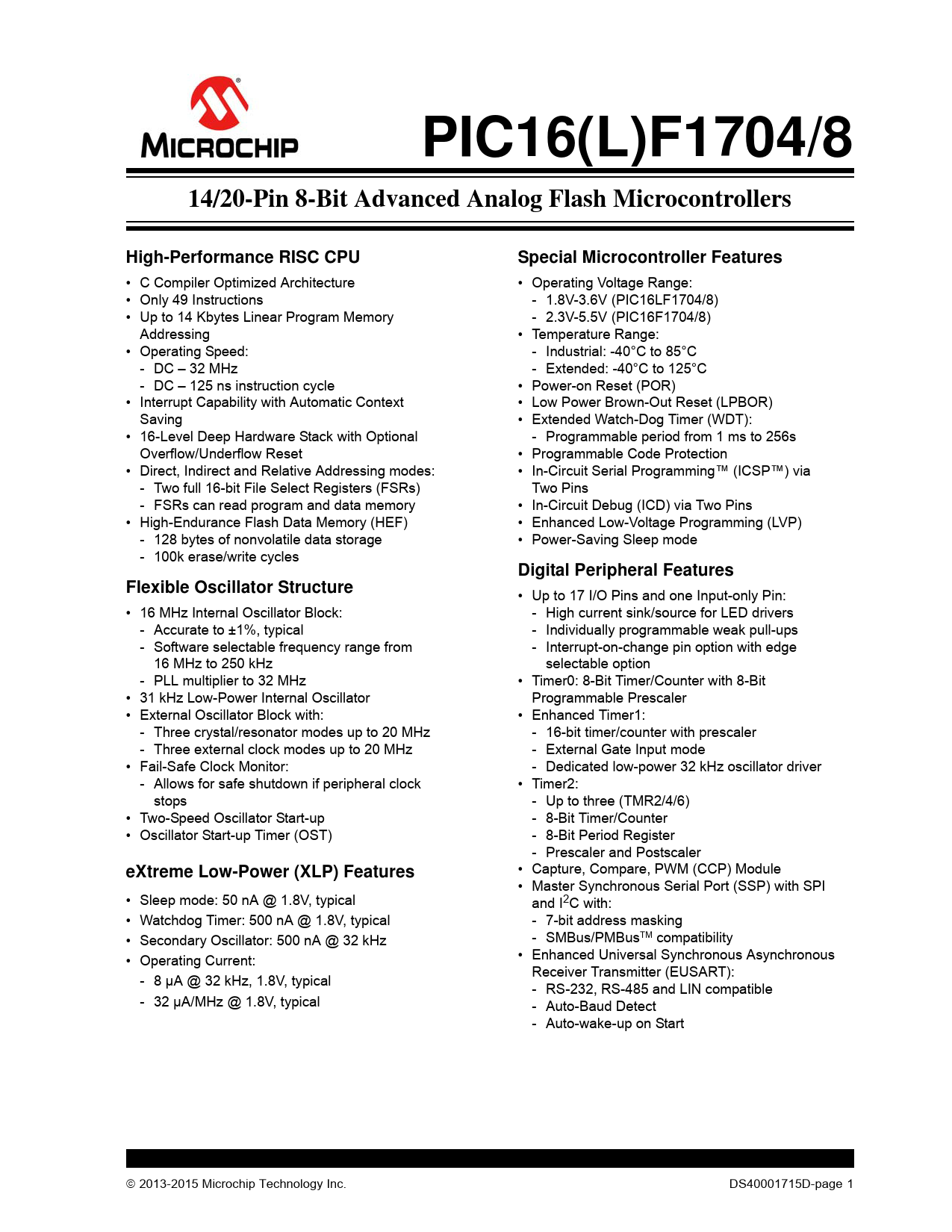 PIC16(L)F1704/8 14/20-Pin 8-Bit Advanced Analog Flash Microcontrollers High-Performance RISC CPU Special Microcontroller Features