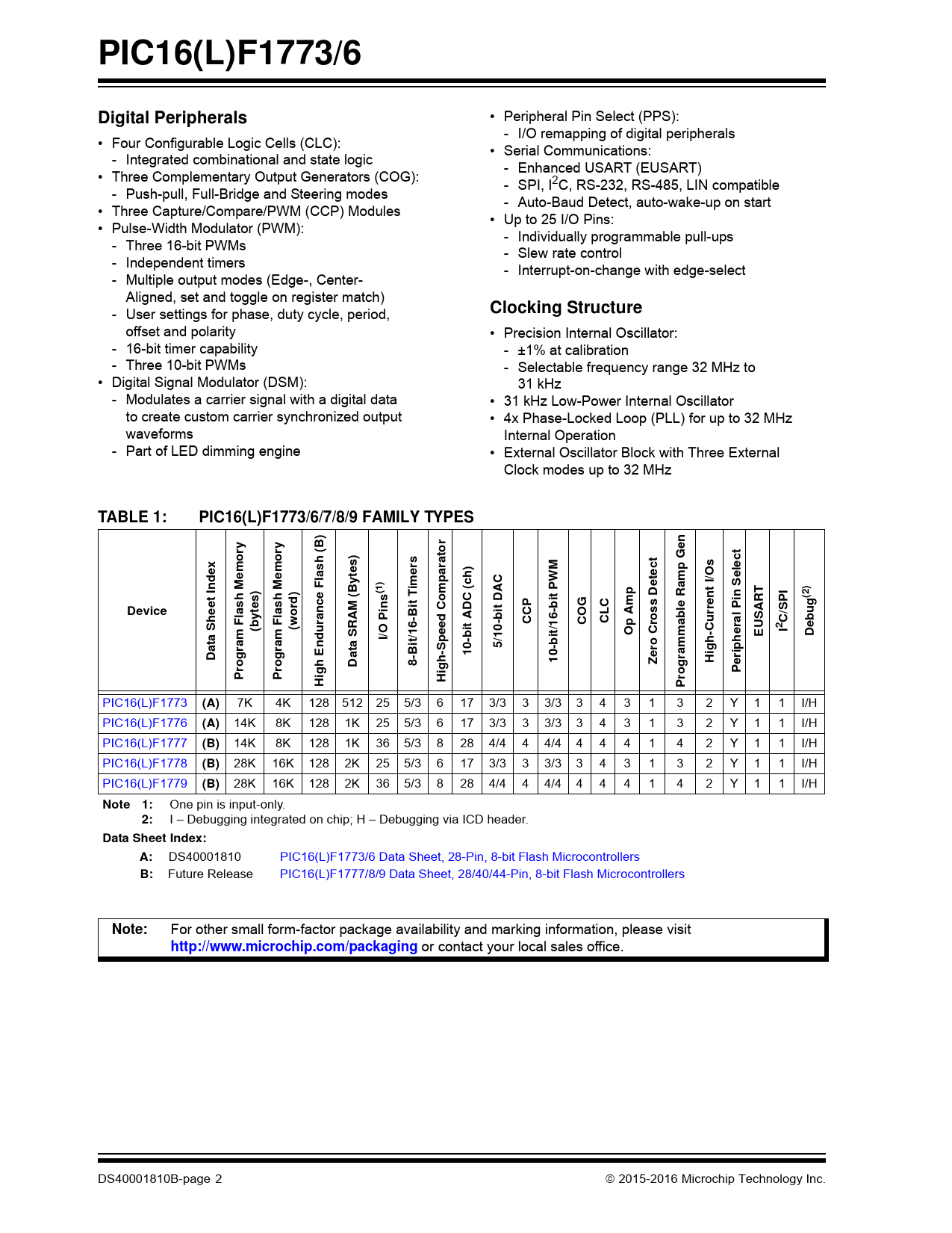 PIC16(L)F1773/6. Digital Peripherals. Clocking Structure. TABLE 1:. PIC16(L)F1773/6/7/8/9 FAMILY TYPES. (B). es). arato. lect. lash. tect