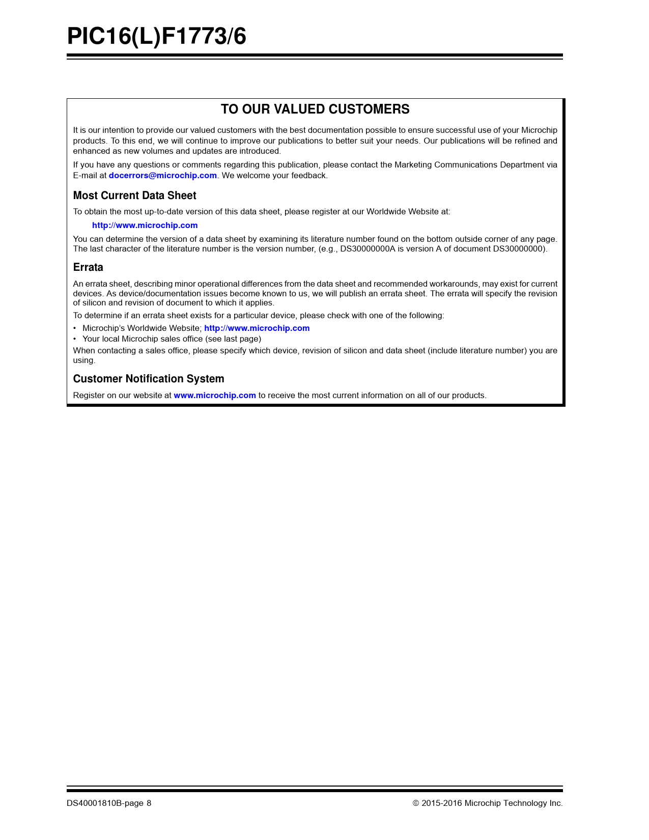 PIC16(L)F1773/6 TO OUR VALUED CUSTOMERS