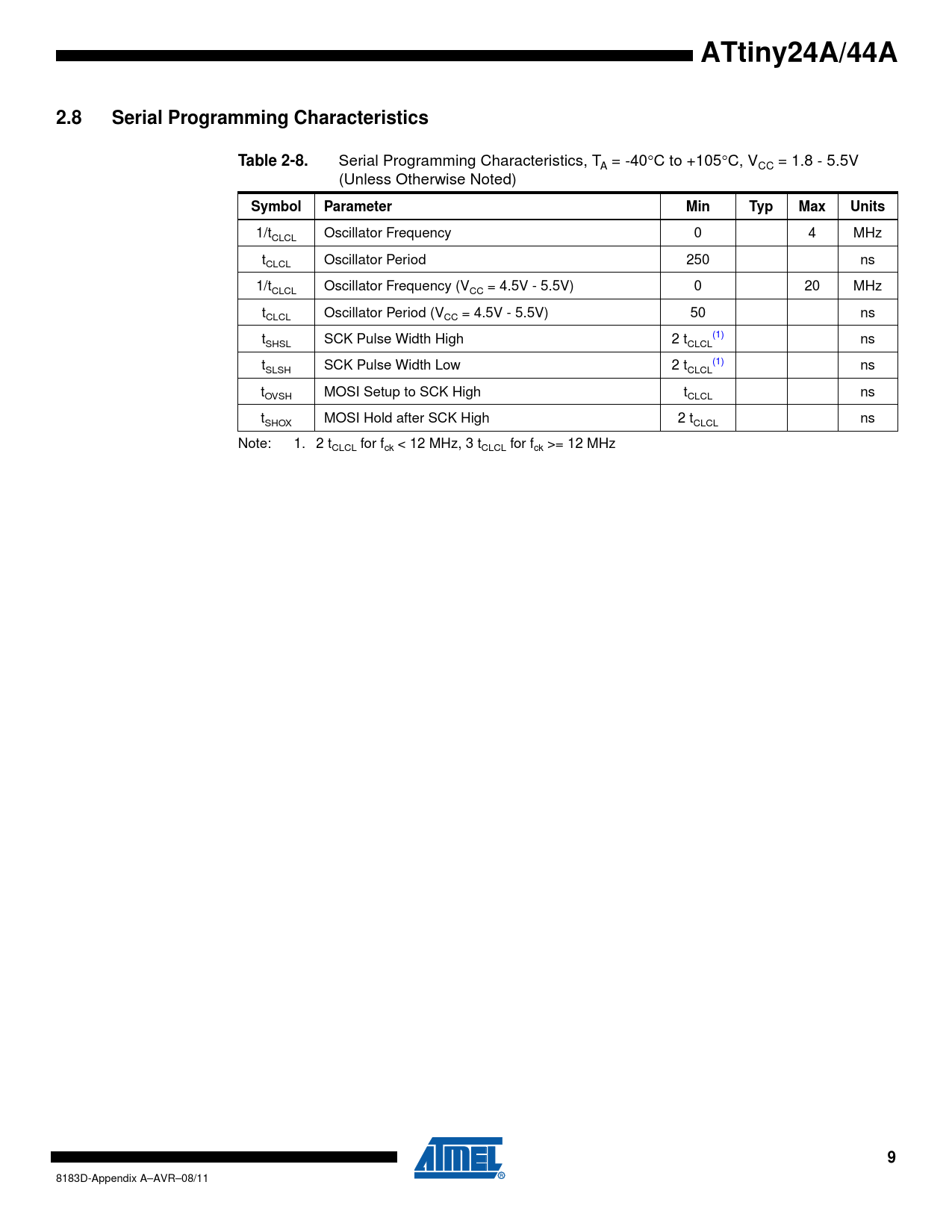 link to page 9 link to page 9 ATtiny24A/44A2.8Serial Programming CharacteristicsTable 2-8. Serial Programming Characteristics, T = -40°C to +105°C, V = 1.8 - 5.5V A CC (Unless Otherwise Noted) SymbolParameterMinTypMaxUnits 1/tCLCL Oscillator Frequency 0 4 MHz t Oscillator Period 250 ns CLCL 1/tCLCL Oscillator Frequency (VCC = 4.5V - 5.5V) 0 20 MHz tCLCL Oscillator Period (VCC = 4.5V - 5.5V) 50 ns t SCK Pulse Width High 2 t (1) ns SHSL CLCL t (1) SLSH SCK Pulse Width Low 2 tCLCL ns tOVSH MOSI Setup to SCK High tCLCL ns t MOSI Hold after SCK High 2 t ns SHOX CLCL Note: 1. 2 tCLCL for fck < 12 MHz, 3 tCLCL for fck >= 12 MHz 9 8183D-Appendix A–AVR–08/11 Document Outline Appendix A – ATtiny24A/44A Specification at 105°C 1. Memories 1.1 EEPROM Data Memory 2. Electrical Characteristics 2.1 Absolute Maximum Ratings* 2.2 DC Characteristics 2.3 Speed 2.4 Clock Characteristics 2.4.1 Accuracy of Calibrated Internal Oscillator 2.5 System and Reset Characteristics 2.5.1 Power-On Reset 2.6 Analog Comparator Characteristics 2.7 ADC Characteristics 2.8 Serial Programming Characteristics 3. Typical Characteristics 3.1 ATtiny24A 3.1.1 Current Consumption in Active Mode 3.1.2 Current Consumption in Idle Mode 3.1.3 Current Consumption of Standby Supply 3.1.4 Current Consumption in Power-down Mode 3.1.5 Current Consumption of Peripheral Units 3.1.6 Pull-up Resistors 3.1.7 Output Driver Strength 3.1.8 Input Threshold and Hysteresis (for I/O Ports) 3.1.9 BOD and Bandgap 3.1.10 Analog Comparator Offset 3.1.11 Internal Oscillator Speed 3.2 ATtiny44A 3.2.1 Current Consumption in Active Mode 3.2.2 Current Consumption in Idle Mode 3.2.3 Current Consumption of Standby Supply 3.2.4 Current Consumption in Power-down Supply Mode 3.2.5 Current Consumption of Peripheral Units 3.2.6 Pull-up Resistors 3.2.7 Output Driver Strength 3.2.8 Input Threshold and Hysteresis (for I/O Ports) 3.2.9 BOD and Bandgap and Reset 3.2.10 Analog Comparator Offset 3.2.11 Internal Oscillator Speed 4. Ordering Information 4.1 ATtiny24A 4.2 ATtiny44A 5. Revision History