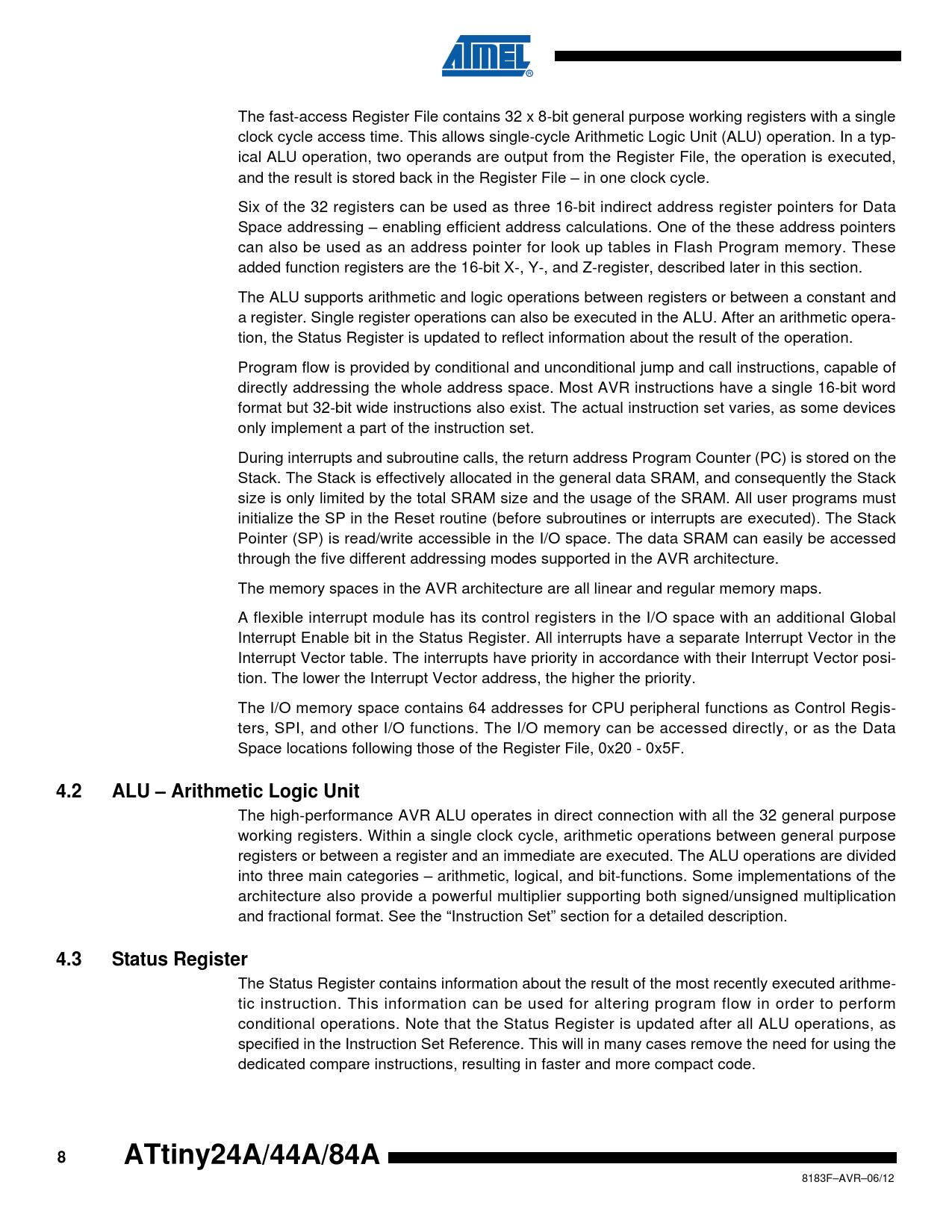 页数 / 页286 / 8 — 4.2. ALU – Arithmetic Logic Unit. 4.3. Status Register. ATtiny24A/44A/84A
