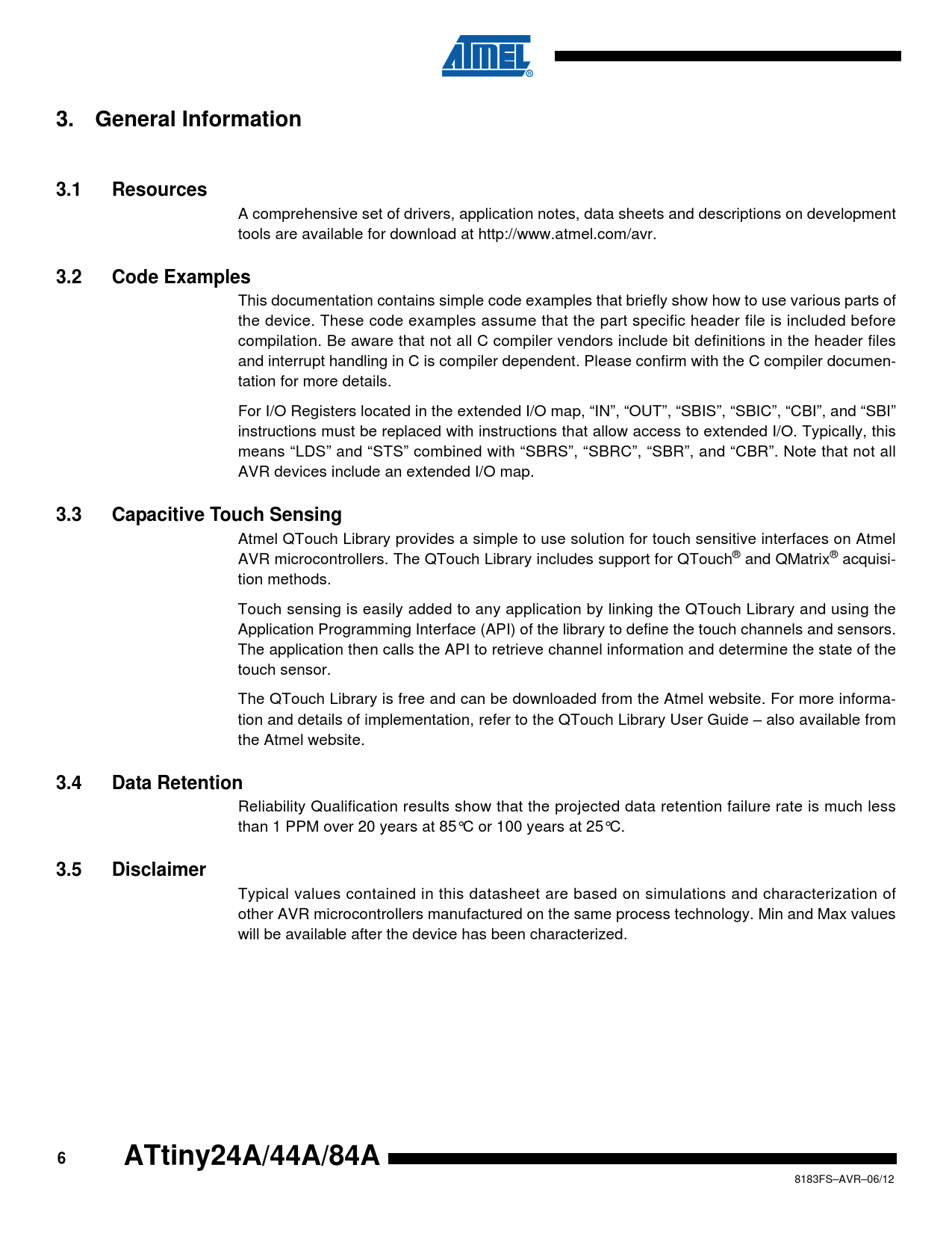 General Information 3.1 Resources 3.2 Code Examples 3.3 Capacitive Touch Sensing 3.4 Data Retention 3.5 Disclaimer
