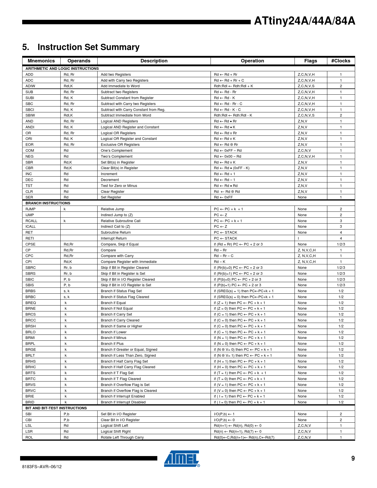 ATtiny24A/44A/84A5.Instruction Set SummaryMnemonicsOperandsDescriptionOperationFlags#ClocksARITHMETIC AND LOGIC INSTRUCTIONS ADD Rd, Rr Add two Registers Rd ← Rd + Rr Z,C,N,V,H 1 ADC Rd, Rr Add with Carry two Registers Rd ← Rd + Rr + C Z,C,N,V,H 1 ADIW Rdl,K Add Immediate to Word Rdh:Rdl ← Rdh:Rdl + K Z,C,N,V,S 2 SUB Rd, Rr Subtract two Registers Rd ← Rd - Rr Z,C,N,V,H 1 SUBI Rd, K Subtract Constant from Register Rd ← Rd - K Z,C,N,V,H 1 SBC Rd, Rr Subtract with Carry two Registers Rd ← Rd - Rr - C Z,C,N,V,H 1 SBCI Rd, K Subtract with Carry Constant from Reg. Rd ← Rd - K - C Z,C,N,V,H 1 SBIW Rdl,K Subtract Immediate from Word Rdh:Rdl ← Rdh:Rdl - K Z,C,N,V,S 2 AND Rd, Rr Logical AND Registers Rd ← Rd • Rr Z,N,V 1 ANDI Rd, K Logical AND Register and Constant Rd ← Rd • K Z,N,V 1 OR Rd, Rr Logical OR Registers Rd ← Rd v Rr Z,N,V 1 ORI Rd, K Logical OR Register and Constant Rd ← Rd v K Z,N,V 1 EOR Rd, Rr Exclusive OR Registers Rd ← Rd ⊕ Rr Z,N,V 1 COM Rd One’s Complement Rd ← 0xFF − Rd Z,C,N,V 1 NEG Rd Two’s Complement Rd ← 0x00 − Rd Z,C,N,V,H 1 SBR Rd,K Set Bit(s) in Register Rd ← Rd v K Z,N,V 1 CBR Rd,K Clear Bit(s) in Register Rd ← Rd • (0xFF - K) Z,N,V 1 INC Rd Increment Rd ← Rd + 1 Z,N,V 1 DEC Rd Decrement Rd ← Rd − 1 Z,N,V 1 TST Rd Test for Zero or Minus Rd ← Rd • Rd Z,N,V 1 CLR Rd Clear Register Rd ← Rd ⊕ Rd Z,N,V 1 SER Rd Set Register Rd ← 0xFF None 1 BRANCH INSTRUCTIONS RJMP k Relative Jump PC ← PC + k + 1 None 2 IJMP Indirect Jump to (Z) PC ← Z None 2 RCALL k Relative Subroutine Call PC ← PC + k + 1 None 3 ICALL Indirect Call to (Z) PC ← Z None 3 RET Subroutine Return PC ← STACK None 4 RETI Interrupt Return PC ← STACK I 4 CPSE Rd,Rr Compare, Skip if Equal if (Rd = Rr) PC ← PC + 2 or 3 None 1/2/3 CP Rd,Rr Compare Rd − Rr Z, N,V,C,H 1 CPC Rd,Rr Compare with Carry Rd − Rr − C Z, N,V,C,H 1 CPI Rd,K Compare Register with Immediate Rd − K Z, N,V,C,H 1 SBRC Rr, b Skip if Bit in Register Cleared if (Rr(b)=0) PC ← PC + 2 or 3 None 1/2/3 SBRS Rr, b Skip if Bit in Register is Set if (Rr(b)=1) PC ← PC + 2 or 3 None 1/2/3 SBIC P, b Skip if Bit in I/O Register Cleared if (P(b)=0) PC ← PC + 2 or 3 None 1/2/3 SBIS P, b Skip if Bit in I/O Register is Set if (P(b)=1) PC ← PC + 2 or 3 None 1/2/3 BRBS s, k Branch if Status Flag Set if (SREG(s) = 1) then PC←PC+k + 1 None 1/2 BRBC s, k Branch if Status Flag Cleared if (SREG(s) = 0) then PC←PC+k + 1 None 1/2 BREQ k Branch if Equal if (Z = 1) then PC ← PC + k + 1 None 1/2 BRNE k Branch if Not Equal if (Z = 0) then PC ← PC + k + 1 None 1/2 BRCS k Branch if Carry Set if (C = 1) then PC ← PC + k + 1 None 1/2 BRCC k Branch if Carry Cleared if (C = 0) then PC ← PC + k + 1 None 1/2 BRSH k Branch if Same or Higher if (C = 0) then PC ← PC + k + 1 None 1/2 BRLO k Branch if Lower if (C = 1) then PC ← PC + k + 1 None 1/2 BRMI k Branch if Minus if (N = 1) then PC ← PC + k + 1 None 1/2 BRPL k Branch if Plus if (N = 0) then PC ← PC + k + 1 None 1/2 BRGE k Branch if Greater or Equal, Signed if (N ⊕ V= 0) then PC ← PC + k + 1 None 1/2 BRLT k Branch if Less Than Zero, Signed if (N ⊕ V= 1) then PC ← PC + k + 1 None 1/2 BRHS k Branch if Half Carry Flag Set if (H = 1) then PC ← PC + k + 1 None 1/2 BRHC k Branch if Half Carry Flag Cleared if (H = 0) then PC ← PC + k + 1 None 1/2 BRTS k Branch if T Flag Set if (T = 1) then PC ← PC + k + 1 None 1/2 BRTC k Branch if T Flag Cleared if (T = 0) then PC ← PC + k + 1 None 1/2 BRVS k Branch if Overflow Flag is Set if (V = 1) then PC ← PC + k + 1 None 1/2 BRVC k Branch if Overflow Flag is Cleared if (V = 0) then PC ← PC + k + 1 None 1/2 BRIE k Branch if Interrupt Enabled if ( I = 1) then PC ← PC + k + 1 None 1/2 BRID k Branch if Interrupt Disabled if ( I = 0) then PC ← PC + k + 1 None 1/2 BIT AND BIT-TEST INSTRUCTIONS SBI P,b Set Bit in I/O Register I/O(P,b) ← 1 None 2 CBI P,b Clear Bit in I/O Register I/O(P,b) ← 0 None 2 LSL Rd Logical Shift Left Rd(n+1) ← Rd(n), Rd(0) ← 0 Z,C,N,V 1 LSR Rd Logical Shift Right Rd(n) ← Rd(n+1), Rd(7) ← 0 Z,C,N,V 1 ROL Rd Rotate Left Through Carry Rd(0)←C,Rd(n+1)← Rd(n),C←Rd(7) Z,C,N,V 1 9 8183FS–AVR–06/12 Document Outline Features 1. Pin Configurations 1.1 Pin Descriptions 1.1.1 VCC 1.1.2 GND 1.1.3 Port B (PB3:PB0) 1.1.4 RESET 1.1.5 Port A (PA7:PA0) 2. Overview 3. General Information 3.1 Resources 3.2 Code Examples 3.3 Capacitive Touch Sensing 3.4 Data Retention 3.5 Disclaimer 4. Register Summary 5. Instruction Set Summary 6. Ordering Information 6.1 ATtiny24A 6.2 ATtiny44A 6.3 ATtiny84A 7. Packaging Information 7.1 14S1 7.2 14P3 7.3 15CC1 7.4 20M1 7.5 20M2 8. Errata 8.1 ATtiny24A 8.1.1 Rev. H 8.1.2 Rev. G 8.1.3 Rev. F 8.2 ATtiny44A 8.2.1 Rev. G 8.2.2 Rev. F 8.2.3 Rev. E 8.3 ATtiny84A 8.3.1 Rev. C 9. Datasheet Revision History 9.1 Rev. 8183F – 06/12 9.2 Rev. 8183E – 01/12 9.3 Rev. 8183D – 04/11 9.4 Rev. 8183C – 03/11 9.5 Rev. 8183B – 03/10 9.6 Rev. 8183A – 12/08