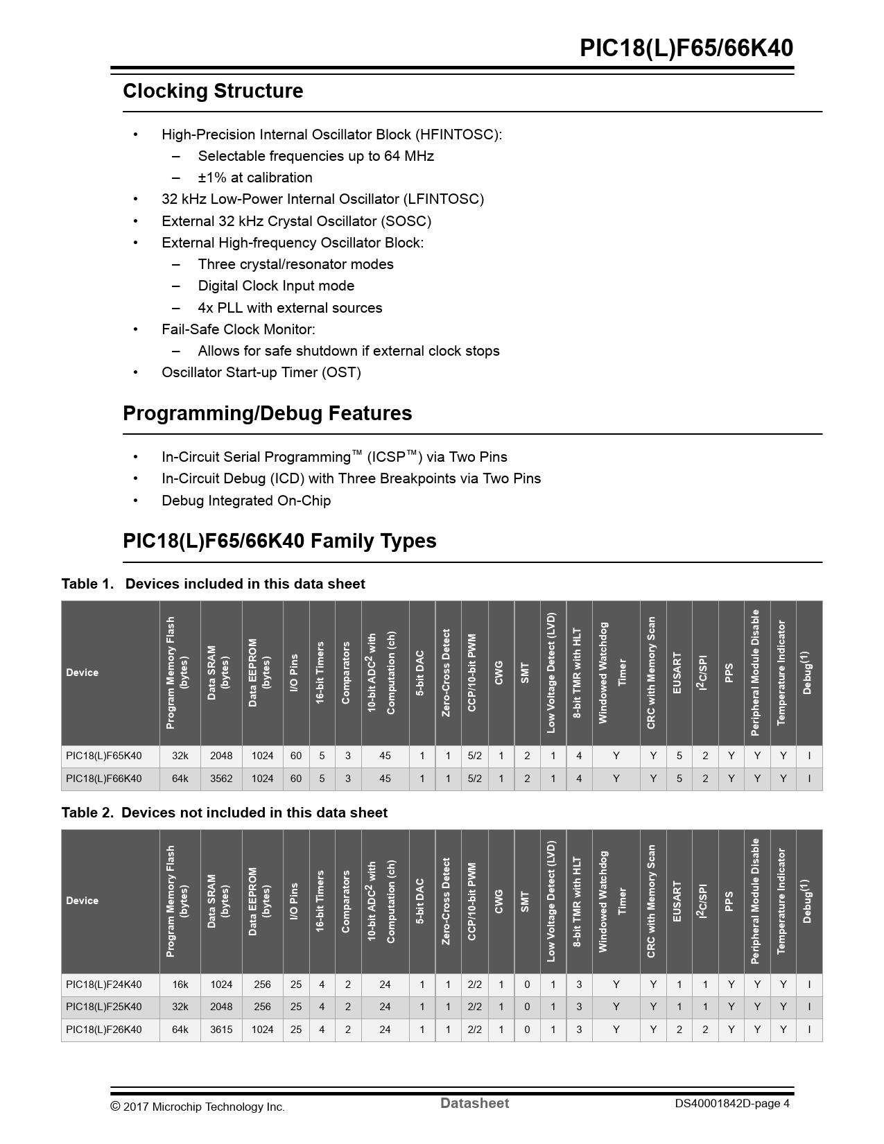PIC18(L)F65/66K40 Family Types Table 1. Devices included in this data sheet VD) T 2 with atchdog imers (1) Device imer (bytes) (bytes) (bytes) CWG SMT I/O Pins T 2 C/SPI PPS EUSART I Data SRAM 5-bit DAC Debug Data EEPROM 16-bit T Comparators oltage Detect (L 10-bit ADC Computation (ch) Zero-Cross Detect CCP/10-bit PWM 8-bit TMR with HL indowed W Program Memory Flash W Temperature Indicator Low V CRC with Memory Scan Peripheral Module Disable