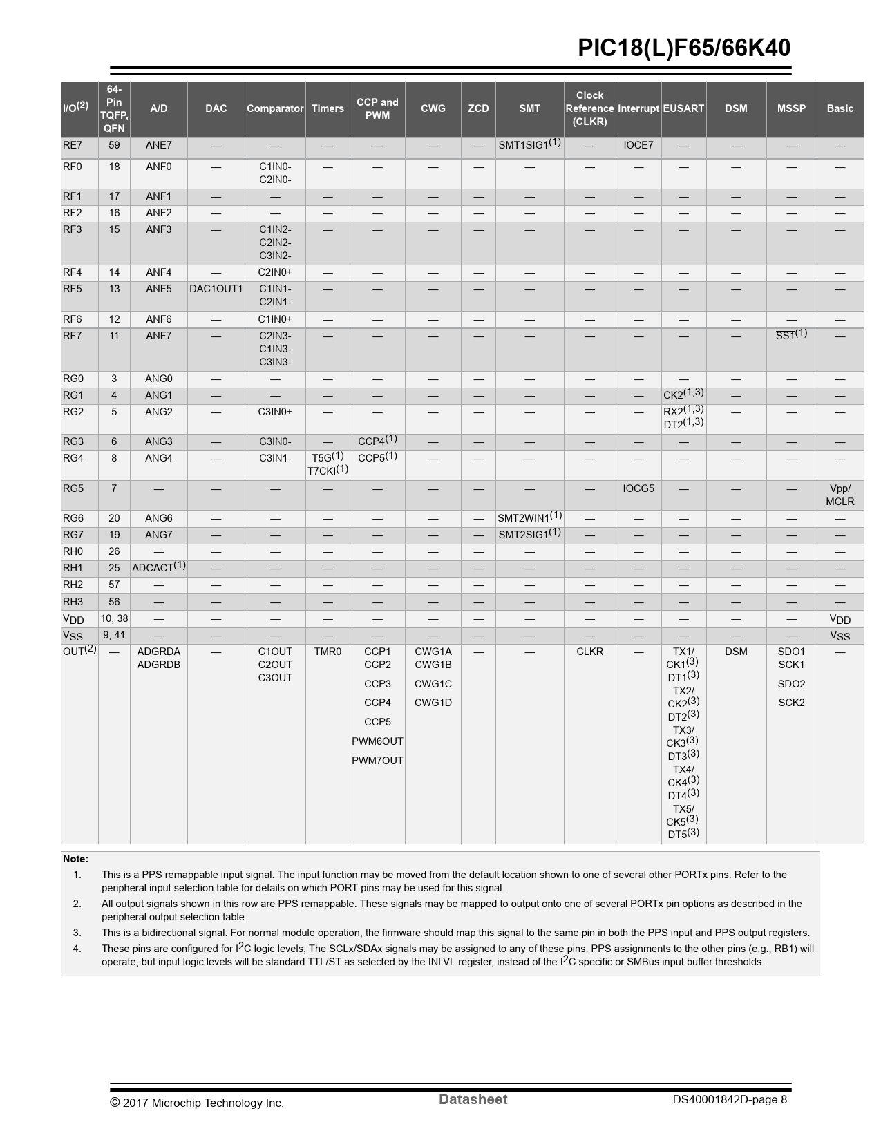 1. This is a PPS remappable input signal. The input function may be moved from the default location shown to one of several other PORTx pins. Refer to the peripheral input selection table for details on which PORT pins may be used for this signal. 2. All output signals shown in this row are PPS remappable. These signals may be mapped to output onto one of several PORTx pin options as described in the peripheral output selection table. 3. This is a bidirectional signal. For normal module operation, the firmware should map this signal to the same pin in both the PPS input and PPS output registers. 4. These pins are configured for I2C logic levels; The SCLx/SDAx signals may be assigned to any of these pins. PPS assignments to the other pins (e.g., RB1) will operate, but input logic levels will be standard TTL/ST as selected by the INLVL register, instead of the I2C specific or SMBus input buffer thresholds. © 2017 Microchip Technology Inc.