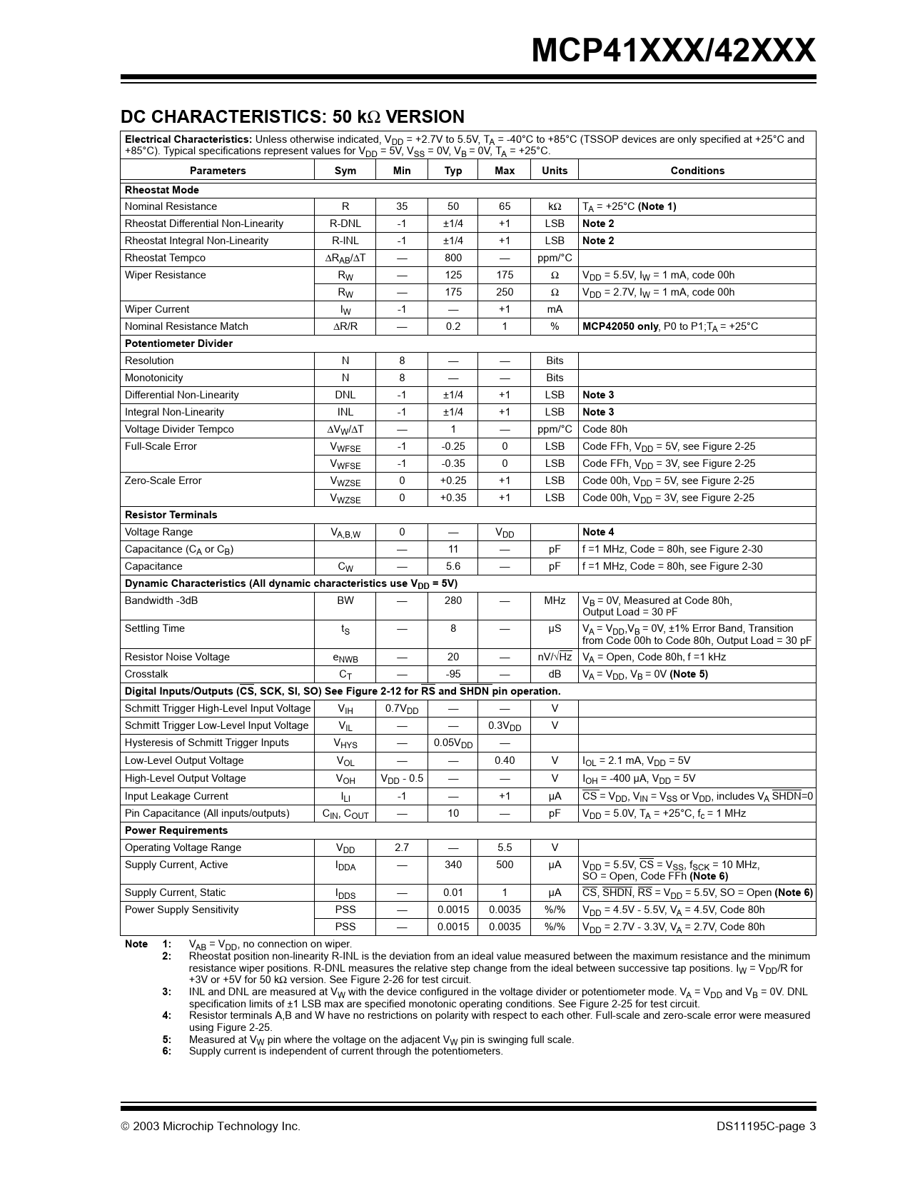 MCP41XXX/42XXX DC CHARACTERISTICS: 50 k