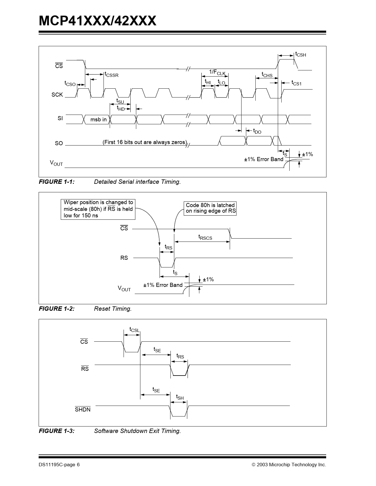 MCP41XXX/42XXX tCSH CS t 1/F CSSR CLK tCHS t t HI tLO CSO tCS1 SCK tSU tHD SI msb in tDO SO (First 16 bits out are always zeros) tS ±1% ±1% Error Band VOUT FIGURE 1-1: Detailed Serial interface Timing. Wiper position is changed to Code 80h is latched mid-scale (80h) if RS is held on rising edge of RS low for 150 ns CS tRSCS tRS RS tS ±1% ±1% Error Band VOUT FIGURE 1-2: Reset Timing. tCSL CS tSE tRS RS tSE tSH SHDN FIGURE 1-3: Software Shutdown Exit Timing. DS11195C-page 6 2003 Microchip Technology Inc. Document Outline 1.0 Electrical Characteristics Figure 1-1: Detailed Serial interface Timing. Figure 1-2: Reset Timing. Figure 1-3: Software Shutdown Exit Timing. 2.0 Typical Performance Curves Figure 2-1: Normalized Wiper to End Terminal Resistance vs. Code. Figure 2-2: Potentiometer INL Error vs. Code. Figure 2-3: Potentiometer Mode Tempco vs. Code. Figure 2-4: Nominal Resistance 10kW vs. Temperature. Figure 2-5: Nominal Resistance 50kW vs. Temperature. Figure 2-6: Nominal Resistance 100kW vs. Temperature. Figure 2-7: Rheostat INL Error vs. Code. Figure 2-8: Rheostat Mode Tempco vs. Code. Figure 2-9: Static Current vs. Temperature. Figure 2-10: Active Supply Current vs. Temperature. Figure 2-11: Active Supply Current vs. Clock Frequency. Figure 2-12: Reset & Shutdown Pins Current vs. Voltage. Figure 2-13: 10kW Device Wiper Resistance Histogram. Figure 2-14: 50kW, 100kW Device Wiper Resistance Histogram. Figure 2-15: One Position Settling Time. Figure 2-16: Full-Scale Settling Time. Figure 2-17: Digital Feed through vs. Time. Figure 2-18: Gain vs. Frequency for 10kW Potentiometer. Figure 2-19: Gain vs. Frequency for 50kW Potentiometer. Figure 2-20: Gain vs. Frequency for 100kW Potentiometer. Figure 2-21: -3 dB Bandwidths. Figure 2-22: Power Supply Rejection Ratio vs. Frequency. Figure 2-23: 10kW Wiper Resistance vs. Voltage. Figure 2-24: 50kW & 100kW Wiper Resistance vs. Voltage. 2.1 Parametric Test Circuits Figure 2-25: Potentiometer Divider Non- Linearity Error Test Circuit (DNL, INL). Figure 2-26: Resistor Position Non- Linearity Error Test Circuit (Rheostat operation DNL, INL). Figure 2-27: Wiper Resistance Test Circuit. Figure 2-28: Power Supply Sensitivity Test Circuit (PSS, PSRR). Figure 2-29: Gain vs. Frequency Test Circuit. Figure 2-30: Capacitance Test Circuit. 3.0 Pin Descriptions 3.1 PA0, PA1 3.2 PB0, PB1 3.3 PW0, PW1 3.4 Chip Select (CS) 3.5 Serial Clock (SCK) 3.6 Serial Data Input (SI) 3.7 Serial Data Output (SO) (MCP42XXX devices only) 3.8 Reset (RS) (MCP42XXX devices only) 3.9 Shutdown (SHDN) (MCP42XXX devices only) Table 3-1: MCP41XXX Pins Table 3-2: MCP42XXX Pins 4.0 Applications Information Figure 4-1: Block diagram showing the MCP42XXX dual digital potentiometer. Data register 0 and da... 4.1 Modes of Operation Figure 4-2: Two-terminal or rheostat configuration for the digital potentiometer. Acting as a res... Figure 4-3: Three terminal or voltage divider mode. 4.2 Typical Applications Figure 4-4: Single-supply, programmable, inverting gain amplifier using a digital potentiometer. Figure 4-5: Single-supply, programmable, non-inverting gain amplifier. Figure 4-6: Gain vs. Code for inverting and differential amplifier circuits. Figure 4-7: Single Supply programmable differential amplifier using digital potentiometers. Figure 4-8: By changing the values of R1 and R2, the voltage output resolution of this programmab... 4.3 Calculating Resistances Figure 4-9: Potentiometer resistances are a function of code. It should be noted that, when using... Figure 4-10: Example Resistance calculations. 5.0 Serial Interface 5.1 Command Byte 5.2 Writing Data Into Data Registers 5.3 Using The Shutdown Command Figure 5-1: Timing Diagram for Writing Instructions or Data to a Digital Potentiometer. Figure 5-2: Command Byte Format. 5.4 Daisy-Chain Configuration Figure 5-3: Timing Diagram for Daisy-Chain Configuration. Figure 5-4: Daisy-Chain Configuration. 5.5 Reset (RS) Pin Operation 5.6 Shutdown (SHDN) Pin Operation 5.7 Power-up Considerations Table 5-1: Truth Table for Logic Inputs 5.8 Using the MCP41XXX/42XXX in SPI Mode 1,1 Figure 5-5: Timing Diagram for SPI Mode 1,1 Operation. 6.0 Packaging Information 6.1 Package Marking Information
