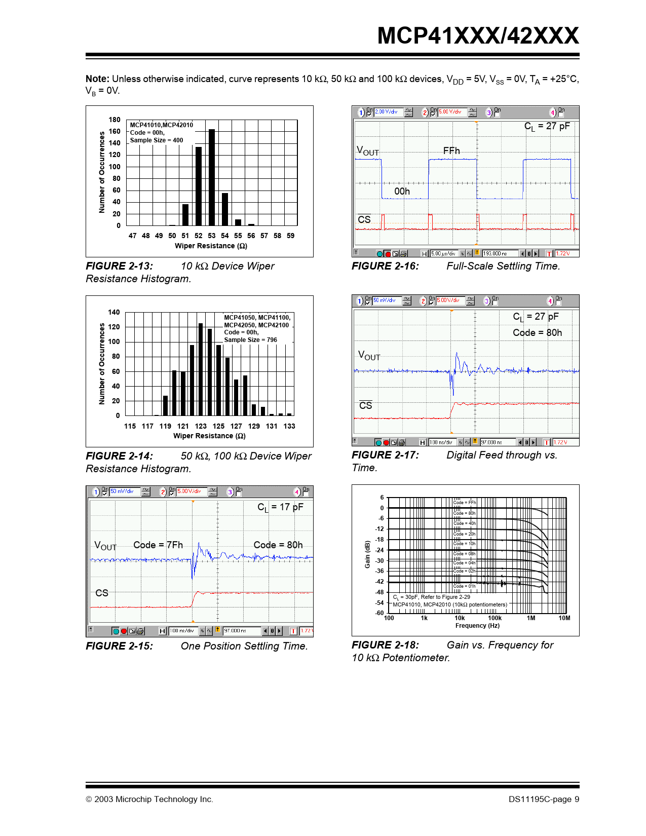 MCP41XXX/42XXXNote: Unless otherwise indicated, curve represents 10 kΩ, 50 kΩ and 100 kΩ devices, VDD = 5V, V = 0V, T SS A = +25°C, V = 0V. B 180MCP41010,MCP42010 C 160 L = 27 pF Code = 00h,140Sample Size = 400 V FFh 120 OUT 10080 60 00h 40Number of Occurrences20 CS 047 48 49 50 51 52 53 54 55 56 57 58 59Wiper Resistance ( Ω )FIGURE 2-13: 10 kΩ Device Wiper FIGURE 2-16: Full-Scale Settling Time. Resistance Histogram. 140MCP41050, MCP41100, CL = 27 pF 120MCP42050, MCP42100 Code = 00h, Code = 80h 100Sample Size = 79680 VOUT 6040Number of Occurrences 20 CS 0115 117 119 121 123 125 127 129 131 133Wiper Resistance ( Ω )FIGURE 2-14: 50 kΩ, 100 kΩ Device Wiper FIGURE 2-17: Digital Feed through vs. Resistance Histogram. Time. 6 C Code = FFh L = 17 pF 0 Code = 80h -6 Code = 40h -12 Code = 20h V -18 OUT Code = 7Fh Code = 80h Code = 10h -24 Code = 08h -30Gain (dB) Code = 04h -36 Code = 02h -42 Code = 01h CS -48 CL = 30pF, Refer to Figure 2-29 -54 MCP41010, MCP42010 (10kΩ potentiometers) -601001k10k100k1M10MFrequency (Hz)FIGURE 2-15: One Position Settling Time. FIGURE 2-18: Gain vs. Frequency for 10 kΩ Potentiometer. 2003 Microchip Technology Inc. DS11195C-page 9 Document Outline 1.0 Electrical Characteristics Figure 1-1: Detailed Serial interface Timing. Figure 1-2: Reset Timing. Figure 1-3: Software Shutdown Exit Timing. 2.0 Typical Performance Curves Figure 2-1: Normalized Wiper to End Terminal Resistance vs. Code. Figure 2-2: Potentiometer INL Error vs. Code. Figure 2-3: Potentiometer Mode Tempco vs. Code. Figure 2-4: Nominal Resistance 10kW vs. Temperature. Figure 2-5: Nominal Resistance 50kW vs. Temperature. Figure 2-6: Nominal Resistance 100kW vs. Temperature. Figure 2-7: Rheostat INL Error vs. Code. Figure 2-8: Rheostat Mode Tempco vs. Code. Figure 2-9: Static Current vs. Temperature. Figure 2-10: Active Supply Current vs. Temperature. Figure 2-11: Active Supply Current vs. Clock Frequency. Figure 2-12: Reset & Shutdown Pins Current vs. Voltage. Figure 2-13: 10kW Device Wiper Resistance Histogram. Figure 2-14: 50kW, 100kW Device Wiper Resistance Histogram. Figure 2-15: One Position Settling Time. Figure 2-16: Full-Scale Settling Time. Figure 2-17: Digital Feed through vs. Time. Figure 2-18: Gain vs. Frequency for 10kW Potentiometer. Figure 2-19: Gain vs. Frequency for 50kW Potentiometer. Figure 2-20: Gain vs. Frequency for 100kW Potentiometer. Figure 2-21: -3 dB Bandwidths. Figure 2-22: Power Supply Rejection Ratio vs. Frequency. Figure 2-23: 10kW Wiper Resistance vs. Voltage. Figure 2-24: 50kW & 100kW Wiper Resistance vs. Voltage. 2.1 Parametric Test Circuits Figure 2-25: Potentiometer Divider Non- Linearity Error Test Circuit (DNL, INL). Figure 2-26: Resistor Position Non- Linearity Error Test Circuit (Rheostat operation DNL, INL). Figure 2-27: Wiper Resistance Test Circuit. Figure 2-28: Power Supply Sensitivity Test Circuit (PSS, PSRR). Figure 2-29: Gain vs. Frequency Test Circuit. Figure 2-30: Capacitance Test Circuit. 3.0 Pin Descriptions 3.1 PA0, PA1 3.2 PB0, PB1 3.3 PW0, PW1 3.4 Chip Select (CS) 3.5 Serial Clock (SCK) 3.6 Serial Data Input (SI) 3.7 Serial Data Output (SO) (MCP42XXX devices only) 3.8 Reset (RS) (MCP42XXX devices only) 3.9 Shutdown (SHDN) (MCP42XXX devices only) Table 3-1: MCP41XXX Pins Table 3-2: MCP42XXX Pins 4.0 Applications Information Figure 4-1: Block diagram showing the MCP42XXX dual digital potentiometer. Data register 0 and da... 4.1 Modes of Operation Figure 4-2: Two-terminal or rheostat configuration for the digital potentiometer. Acting as a res... Figure 4-3: Three terminal or voltage divider mode. 4.2 Typical Applications Figure 4-4: Single-supply, programmable, inverting gain amplifier using a digital potentiometer. Figure 4-5: Single-supply, programmable, non-inverting gain amplifier. Figure 4-6: Gain vs. Code for inverting and differential amplifier circuits. Figure 4-7: Single Supply programmable differential amplifier using digital potentiometers. Figure 4-8: By changing the values of R1 and R2, the voltage output resolution of this programmab... 4.3 Calculating Resistances Figure 4-9: Potentiometer resistances are a function of code. It should be noted that, when using... Figure 4-10: Example Resistance calculations. 5.0 Serial Interface 5.1 Command Byte 5.2 Writing Data Into Data Registers 5.3 Using The Shutdown Command Figure 5-1: Timing Diagram for Writing Instructions or Data to a Digital Potentiometer. Figure 5-2: Command Byte Format. 5.4 Daisy-Chain Configuration Figure 5-3: Timing Diagram for Daisy-Chain Configuration. Figure 5-4: Daisy-Chain Configuration. 5.5 Reset (RS) Pin Operation 5.6 Shutdown (SHDN) Pin Operation 5.7 Power-up Considerations Table 5-1: Truth Table for Logic Inputs 5.8 Using the MCP41XXX/42XXX in SPI Mode 1,1 Figure 5-5: Timing Diagram for SPI Mode 1,1 Operation. 6.0 Packaging Information 6.1 Package Marking Information