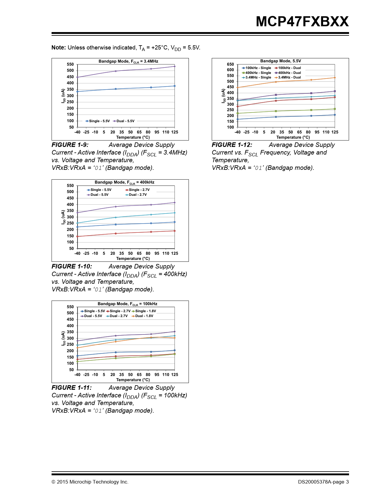 Bandgap Mode, F = 400kHz 550 CLK Single - 5.5V Single - 2.7V 500 Dual - 5.5V Dual - 2.7V 450 400 ) 350 A (u 300 I DD 250 200 150 100 50 -40 -25 -10 5 20 35 50 65 80 95 110 125 Temperature (°C) FIGURE 1-10: