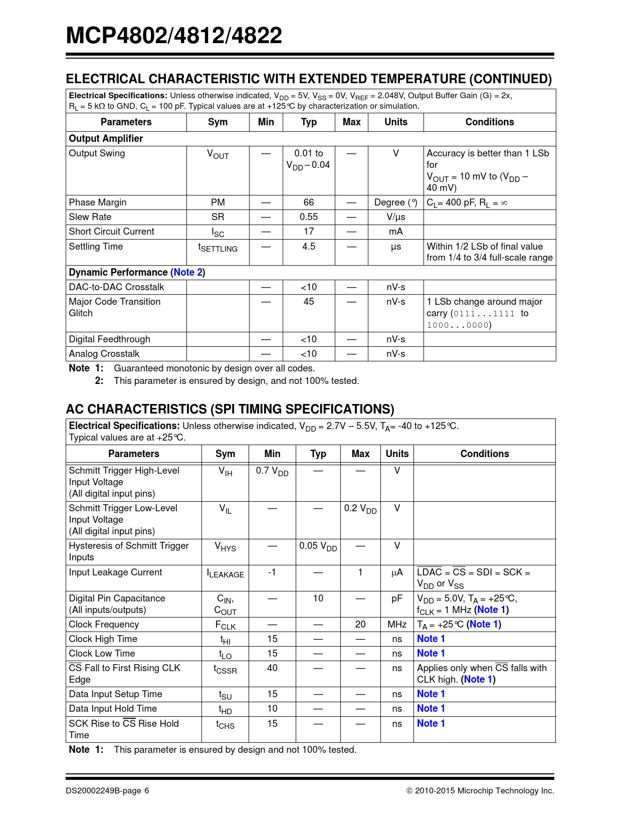 This parameter is ensured by design and not 100% tested. DS20002249B-page 6  2010-2015 Microchip Technology Inc. Document Outline 1.0 Electrical Characteristics FIGURE 1-1: SPI Input Timing Data. 2.0 Typical Performance Curves FIGURE 2-1: DNL vs. Code (MCP4822). FIGURE 2-2: DNL vs. Code and Temperature (MCP4822). FIGURE 2-3: Absolute DNL vs. Temperature (MCP4822). FIGURE 2-4: INL vs. Code and Temperature (MCP4822). FIGURE 2-5: Absolute INL vs. Temperature (MCP4822). FIGURE 2-6: INL vs. Code (MCP4822). FIGURE 2-7: DNL vs. Code and Temperature (MCP4812). FIGURE 2-8: INL vs. Code and Temperature (MCP4812). FIGURE 2-9: DNL vs. Code and Temperature (MCP4802). FIGURE 2-10: INL vs. Code and Temperature (MCP4802). FIGURE 2-11: Full-Scale VOUTA vs. Ambient Temperature and VDD. Gain = 1x. FIGURE 2-12: Full-Scale VOUTA vs. Ambient Temperature and VDD. Gain = 2x. FIGURE 2-13: Output Noise Voltage Density (VREF Noise Density) vs. Frequency. Gain = 1x. FIGURE 2-14: Output Noise Voltage (VREF Noise Voltage) vs. Bandwidth. Gain = 1x. FIGURE 2-15: IDD vs. Temperature and VDD. FIGURE 2-16: IDD Histogram (VDD = 2.7V). FIGURE 2-17: IDD Histogram (VDD = 5.0V). FIGURE 2-18: Software Shutdown Current vs. Temperature and VDD. FIGURE 2-19: Offset Error vs. Temperature and VDD. FIGURE 2-20: Gain Error vs. Temperature and VDD. FIGURE 2-21: VIN High Threshold vs. Temperature and VDD. FIGURE 2-22: VIN Low Threshold vs. Temperature and VDD. FIGURE 2-23: Input Hysteresis vs. Temperature and VDD. FIGURE 2-24: VOUT High Limit vs.Temperature and VDD. FIGURE 2-25: VOUT Low Limit vs. Temperature and VDD. FIGURE 2-26: IOUT High Short vs. Temperature and VDD. FIGURE 2-27: IOUT vs. VOUT. Gain = 2x. FIGURE 2-28: VOUT Rise Time. FIGURE 2-29: VOUT Fall Time. FIGURE 2-30: VOUT Rise Time. FIGURE 2-31: VOUT Rise Time. FIGURE 2-32: VOUT Rise Time Exit Shutdown. FIGURE 2-33: PSRR vs. Frequency. 3.0 Pin descriptions TABLE 3-1: Pin Function Table for MCP4802/4812/4822 3.1 Supply Voltage Pins (VDD, VSS) 3.2 Chip Select (CS) 3.3 Serial Clock Input (SCK) 3.4 Serial Data Input (SDI) 3.5 Latch DAC Input (LDAC) 3.6 Analog Outputs (VOUTA, VOUTB) 4.0 General Overview TABLE 4-1: LSb of each device FIGURE 4-1: Example for INL Error. FIGURE 4-2: Example for DNL Error. 4.1 Circuit Descriptions FIGURE 4-3: Typical Transient Response. FIGURE 4-4: Output Stage for Shutdown Mode. 5.0 Serial Interface 5.1 Overview 5.2 Write Command FIGURE 5-1: Write Command for MCP4822 (12-bit DAC). FIGURE 5-2: Write Command for MCP4812 (10-bit DAC). FIGURE 5-3: Write Command for MCP4802 (8-bit DAC). 6.0 Typical Applications 6.1 Digital Interface 6.2 Power Supply Considerations 6.3 Output Noise Considerations FIGURE 6-1: Typical Connection Diagram. 6.4 Layout Considerations 6.5 Single-Supply Operation 6.6 Bipolar Operation 6.7 Selectable Gain and Offset Bipolar Voltage Output Using a Dual Output DAC 6.8 Designing a Double-Precision DAC Using a Dual DAC 6.9 Building Programmable Current Source 7.0 Development support 7.1 Evaluation and Demonstration Boards 8.0 Packaging Information 8.1 Package Marking Information AMERICAS Corporate Office Atlanta Austin, TX Boston Chicago Cleveland Dallas Detroit Houston, TX Indianapolis Los Angeles New York, NY San Jose, CA Canada - Toronto ASIA/PACIFIC Asia Pacific Office Hong Kong Australia - Sydney China - Beijing China - Chengdu China - Chongqing China - Dongguan China - Hangzhou China - Hong Kong SAR China - Nanjing China - Qingdao China - Shanghai China - Shenyang China - Shenzhen China - Wuhan China - Xian ASIA/PACIFIC China - Xiamen China - Zhuhai India - Bangalore India - New Delhi India - Pune Japan - Osaka Japan - Tokyo Korea - Daegu Korea - Seoul Malaysia - Kuala Lumpur Malaysia - Penang Philippines - Manila Singapore Taiwan - Hsin Chu Taiwan - Kaohsiung Taiwan - Taipei Thailand - Bangkok EUROPE Austria - Wels Denmark - Copenhagen France - Paris Germany - Dusseldorf Germany - Munich Germany - Pforzheim Italy - Milan Italy - Venice Netherlands - Drunen Poland - Warsaw Spain - Madrid Sweden - Stockholm UK - Wokingham Worldwide Sales and Service