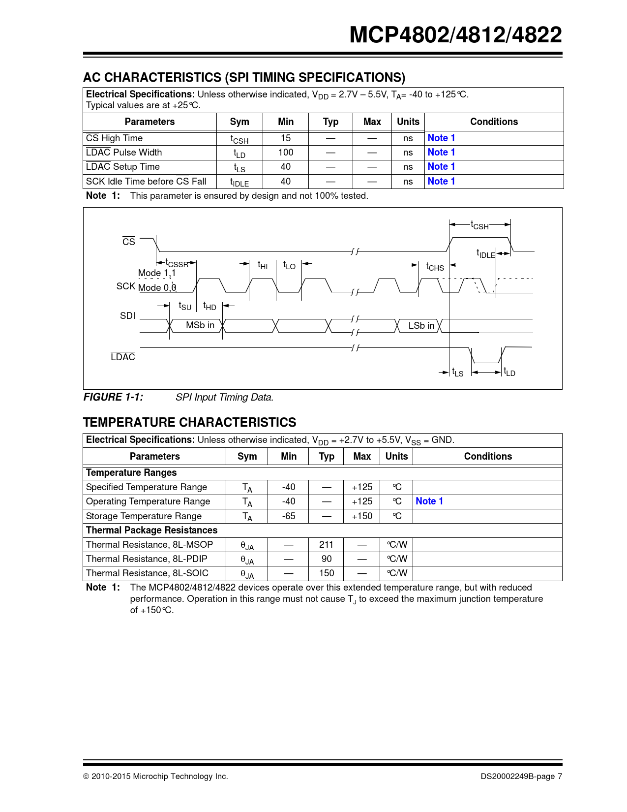 The MCP4802/4812/4822 devices operate over this extended temperature range, but with reduced performance. Operation in this range must not cause T to exceed the maximum junction temperature J of +150°C.  2010-2015 Microchip Technology Inc. DS20002249B-page 7 Document Outline 1.0 Electrical Characteristics FIGURE 1-1: SPI Input Timing Data. 2.0 Typical Performance Curves FIGURE 2-1: DNL vs. Code (MCP4822). FIGURE 2-2: DNL vs. Code and Temperature (MCP4822). FIGURE 2-3: Absolute DNL vs. Temperature (MCP4822). FIGURE 2-4: INL vs. Code and Temperature (MCP4822). FIGURE 2-5: Absolute INL vs. Temperature (MCP4822). FIGURE 2-6: INL vs. Code (MCP4822). FIGURE 2-7: DNL vs. Code and Temperature (MCP4812). FIGURE 2-8: INL vs. Code and Temperature (MCP4812). FIGURE 2-9: DNL vs. Code and Temperature (MCP4802). FIGURE 2-10: INL vs. Code and Temperature (MCP4802). FIGURE 2-11: Full-Scale VOUTA vs. Ambient Temperature and VDD. Gain = 1x. FIGURE 2-12: Full-Scale VOUTA vs. Ambient Temperature and VDD. Gain = 2x. FIGURE 2-13: Output Noise Voltage Density (VREF Noise Density) vs. Frequency. Gain = 1x. FIGURE 2-14: Output Noise Voltage (VREF Noise Voltage) vs. Bandwidth. Gain = 1x. FIGURE 2-15: IDD vs. Temperature and VDD. FIGURE 2-16: IDD Histogram (VDD = 2.7V). FIGURE 2-17: IDD Histogram (VDD = 5.0V). FIGURE 2-18: Software Shutdown Current vs. Temperature and VDD. FIGURE 2-19: Offset Error vs. Temperature and VDD. FIGURE 2-20: Gain Error vs. Temperature and VDD. FIGURE 2-21: VIN High Threshold vs. Temperature and VDD. FIGURE 2-22: VIN Low Threshold vs. Temperature and VDD. FIGURE 2-23: Input Hysteresis vs. Temperature and VDD. FIGURE 2-24: VOUT High Limit vs.Temperature and VDD. FIGURE 2-25: VOUT Low Limit vs. Temperature and VDD. FIGURE 2-26: IOUT High Short vs. Temperature and VDD. FIGURE 2-27: IOUT vs. VOUT. Gain = 2x. FIGURE 2-28: VOUT Rise Time. FIGURE 2-29: VOUT Fall Time. FIGURE 2-30: VOUT Rise Time. FIGURE 2-31: VOUT Rise Time. FIGURE 2-32: VOUT Rise Time Exit Shutdown. FIGURE 2-33: PSRR vs. Frequency. 3.0 Pin descriptions TABLE 3-1: Pin Function Table for MCP4802/4812/4822 3.1 Supply Voltage Pins (VDD, VSS) 3.2 Chip Select (CS) 3.3 Serial Clock Input (SCK) 3.4 Serial Data Input (SDI) 3.5 Latch DAC Input (LDAC) 3.6 Analog Outputs (VOUTA, VOUTB) 4.0 General Overview TABLE 4-1: LSb of each device FIGURE 4-1: Example for INL Error. FIGURE 4-2: Example for DNL Error. 4.1 Circuit Descriptions FIGURE 4-3: Typical Transient Response. FIGURE 4-4: Output Stage for Shutdown Mode. 5.0 Serial Interface 5.1 Overview 5.2 Write Command FIGURE 5-1: Write Command for MCP4822 (12-bit DAC). FIGURE 5-2: Write Command for MCP4812 (10-bit DAC). FIGURE 5-3: Write Command for MCP4802 (8-bit DAC). 6.0 Typical Applications 6.1 Digital Interface 6.2 Power Supply Considerations 6.3 Output Noise Considerations FIGURE 6-1: Typical Connection Diagram. 6.4 Layout Considerations 6.5 Single-Supply Operation 6.6 Bipolar Operation 6.7 Selectable Gain and Offset Bipolar Voltage Output Using a Dual Output DAC 6.8 Designing a Double-Precision DAC Using a Dual DAC 6.9 Building Programmable Current Source 7.0 Development support 7.1 Evaluation and Demonstration Boards 8.0 Packaging Information 8.1 Package Marking Information AMERICAS Corporate Office Atlanta Austin, TX Boston Chicago Cleveland Dallas Detroit Houston, TX Indianapolis Los Angeles New York, NY San Jose, CA Canada - Toronto ASIA/PACIFIC Asia Pacific Office Hong Kong Australia - Sydney China - Beijing China - Chengdu China - Chongqing China - Dongguan China - Hangzhou China - Hong Kong SAR China - Nanjing China - Qingdao China - Shanghai China - Shenyang China - Shenzhen China - Wuhan China - Xian ASIA/PACIFIC China - Xiamen China - Zhuhai India - Bangalore India - New Delhi India - Pune Japan - Osaka Japan - Tokyo Korea - Daegu Korea - Seoul Malaysia - Kuala Lumpur Malaysia - Penang Philippines - Manila Singapore Taiwan - Hsin Chu Taiwan - Kaohsiung Taiwan - Taipei Thailand - Bangkok EUROPE Austria - Wels Denmark - Copenhagen France - Paris Germany - Dusseldorf Germany - Munich Germany - Pforzheim Italy - Milan Italy - Venice Netherlands - Drunen Poland - Warsaw Spain - Madrid Sweden - Stockholm UK - Wokingham Worldwide Sales and Service