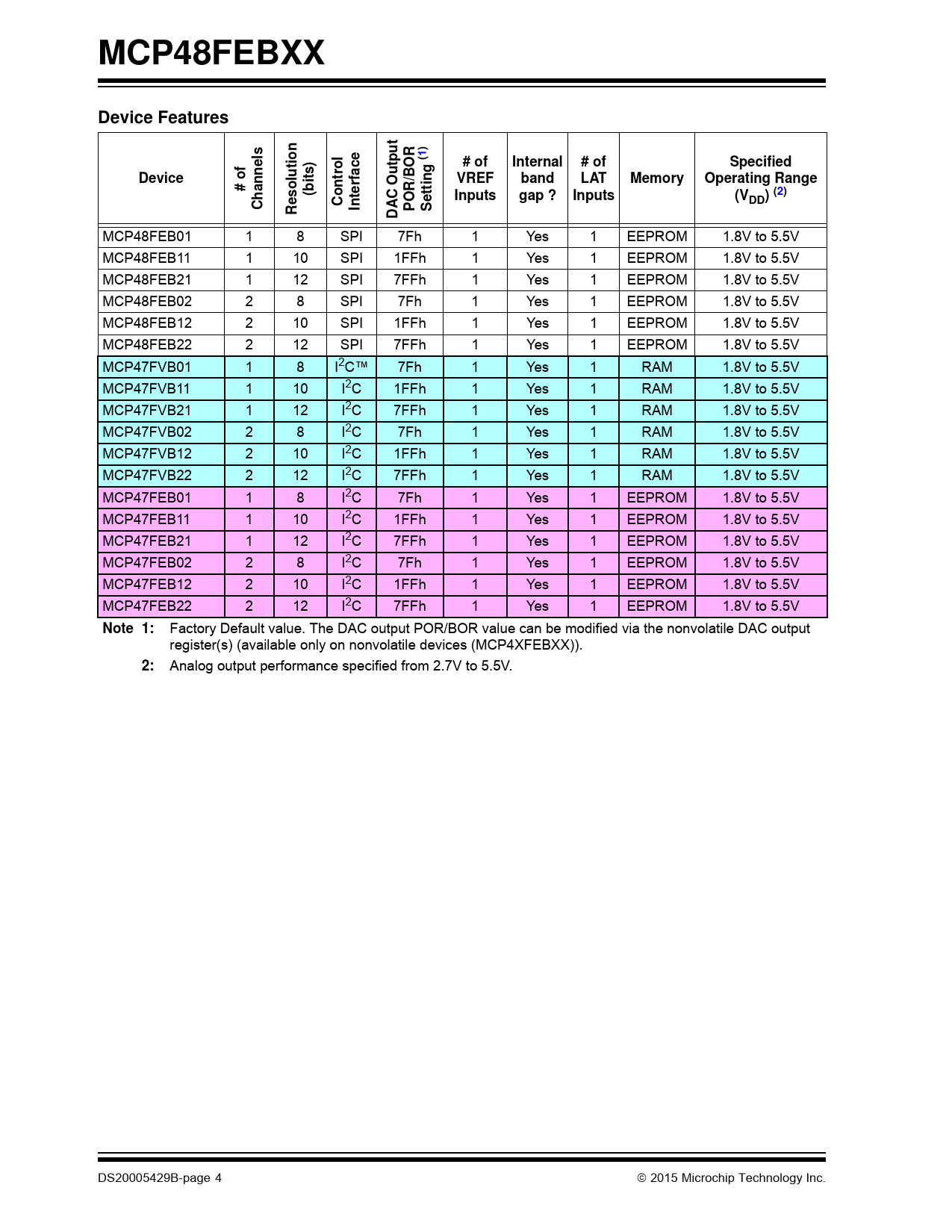 MCP48FEBXX. Device Features. # of. Internal. Specified. Device. lutio. trol. VREF. band. LAT. Memory. Operating Range. # o. o s. (bit. terfac. tting