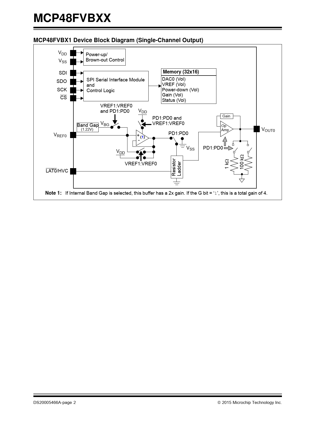 If Internal Band Gap is selected, this buffer has a 2x gain. If the G bit = ‘1’, this is a total gain of 4. DS20005466A-page 2 2015 Microchip Technology Inc. Document Outline 8-/10-/12-Bit Single/Dual Voltage Output Volatile Digital-to-Analog Converters with SPI Interface Features Package Types General Description Applications MCP48FVBX1 Device Block Diagram (Single-Channel Output) MCP48FVBX2 Device Block Diagram (Dual-Channel Output) Device Features 1.0 Electrical Characteristics Absolute Maximum Ratings (†) DC Characteristics DC Notes: 1.1 Reset, Power-Down, and SPI Mode Timing Waveforms and Requirements FIGURE 1-1: Power-on and Brown-out Reset Waveforms. FIGURE 1-2: SPI Power-Down Command Waveforms. TABLE 1-1: RESET and Power-Down Timing FIGURE 1-3: VOUT Settling Time Waveform. TABLE 1-2: VOUT Settling Timing FIGURE 1-4: SPI Timing (Mode = 11) Waveforms. FIGURE 1-5: SPI Timing (Mode = 00) Waveforms. TABLE 1-3: SPI Requirements (Mode = 11) TABLE 1-4: SPI Requirements (Mode = 00) Timing Table Notes: Temperature Specifications 2.0 Typical Performance Curves 3.0 Pin Descriptions TABLE 3-1: MCP48FVBX1 (Single-DAC) Pinout Description TABLE 3-2: MCP48FVBX2 (Dual-DAC) Pinout Description 3.1 Positive Power Supply Input (VDD) 3.2 Voltage Reference Pin (VREF) 3.3 Analog Output Voltage Pin (VOUT) 3.4 No Connect (NC) 3.5 Ground (VSS) 3.6 Latch Pin (LAT)/High-Voltage Command (HVC) 3.7 SPI - Chip Select Pin (CS) 3.8 SPI - Serial Data In Pin (SDI) 3.9 SPI - Serial Data Out Pin (SDO) 3.10 SPI - Serial Clock Pin (SCK) 4.0 General Description 4.1 Power-on Reset/Brown-out Reset (POR/BOR) FIGURE 4-1: Power-on Reset Operation. 4.2 Device Memory TABLE 4-1: Memory Map (x16) TABLE 4-2: FACTORY DEFAULT POR / BOR VALUES Register 4-1: DAC0 and DAC1 Registers Register 4-2: Voltage Reference (VREF) Control Register (Address 08h) Register 4-3: Power-down Control Register (Address 09h) Register 4-4: Gain Control and System Status Register (Address 0Ah) 5.0 DAC Circuitry FIGURE 5-1: MCP48FVBXX DAC Module Block Diagram. 5.1 Resistor Ladder FIGURE 5-2: Resistor Ladder Model Block Diagram. 5.2 Voltage Reference Selection FIGURE 5-3: Resistor Ladder Reference Voltage Selection Block Diagram. FIGURE 5-4: Reference Voltage Selection Implementation Block Diagram. 5.3 Output Buffer/VOUT Operation TABLE 5-1: Output Driver Gain FIGURE 5-5: Output Driver Block Diagram. TABLE 5-2: Theoretical Step Voltage (VS) (1) FIGURE 5-6: VOUT Pin Slew Rate. FIGURE 5-7: Circuit to Stabilize Output Buffer for Large Capacitive Loads (CL). TABLE 5-3: DAC Input Code Vs. Calculated Analog Output (VOUT) (VDD = 5.0V) 5.4 Internal Band Gap TABLE 5-4: VOUT USING BAND GAP 5.5 Latch Pin (LAT) FIGURE 5-8: LAT and DAC Interaction. FIGURE 5-9: Example Use of LAT Pin Operation. 5.6 Power-Down Operation FIGURE 5-10: VOUT Power-Down Block Diagram. TABLE 5-5: POWER-DOWN BITS AND OUTPUT RESISTIVE LOAD TABLE 5-6: DAC CURRENT SOURCES 5.7 DAC Registers, Configuration Bits, and Status Bits 6.0 SPI Serial Interface Module 6.1 Overview 6.2 SPI Serial Interface 6.3 Communication Data Rates 6.4 POR/BOR FIGURE 6-1: Typical SPI Interface Block Diagram. 6.5 Interface Pins (CS, SCK, SDI, SDO, and LAT/HVC) TABLE 6-1: SCK Frequency 6.6 The SPI Modes 7.0 SPI Commands TABLE 7-1: SPI Commands - Number of Clocks TABLE 7-2: Command Bits Overview FIGURE 7-1: 24-bit SPI Command Format. 7.1 Write Command TABLE 7-3: Volatile Memory Addresses FIGURE 7-2: Write Command - SDI and SDO States. FIGURE 7-3: Continuous Write Sequence. FIGURE 7-4: 24-Bit Write Command (C1:C0 = “00”) - SPI Waveform with PIC MCU (Mode 1,1). FIGURE 7-5: 24-Bit Write Command (C1:C0 = “00”) - SPI Waveform with PIC MCU (Mode 0,0). 7.2 Read Command FIGURE 7-6: Read Command - SDI and SDO States. FIGURE 7-7: Continuous-Reads Sequence. FIGURE 7-8: 24-Bit Read Command (C1:C0 = “11”) - SPI Waveform with PIC MCU (Mode 1,1). FIGURE 7-9: 24-Bit Read Command (C1:C0 = “11”) - SPI Waveform with PIC MCU (Mode 0,0). 8.0 Typical Applications 8.1 Power Supply Considerations FIGURE 8-1: Bypass Filtering Example Circuit. 8.2 Application Examples FIGURE 8-2: Example Circuit Of Set-Point or Threshold Calibration. FIGURE 8-3: Single-Supply “Window” DAC. 8.3 Bipolar Operation FIGURE 8-4: Digitally-Controlled Bipolar Voltage Source Example Circuit. 8.4 Selectable Gain and Offset Bipolar Voltage Output FIGURE 8-5: Bipolar Voltage Source with Selectable Gain and Offset. 8.5 Designing a Double-Precision DAC FIGURE 8-6: Simple Double-Precision DAC using MCP48FVBX2. 8.6 Building Programmable Current Source FIGURE 8-7: Digitally-Controlled Current Source. 8.7 Serial Interface Communication Times TABLE 8-1: Serial Interface Times / Frequencies 8.8 Design Considerations FIGURE 8-8: Typical Microcontroller Connections. TABLE 8-2: Package Footprint (1) 9.0 Development Support 9.1 Development Tools 9.2 Technical Documentation TABLE 9-1: Technical Documentation 10.0 Packaging Information 10.1 Package Marking Information Appendix A: Revision History Appendix B: Terminology B.1 Resolution B.2 Least Significant Bit (LSb) B.3 Monotonic Operation FIGURE B-1: VW (VOUT). B.4 Full-Scale Error (EFS) B.5 Zero-Scale Error (EZS) B.6 Total Unadjusted Error (ET) B.7 Offset Error (EOS) FIGURE B-2: Offset Error and Zero-Scale Error. B.8 Offset Error Drift (EOSD) B.9 Gain Error (EG) FIGURE B-3: Gain Error and Full-Scale Error Example. B.10 Gain-Error Drift (EGD) B.11 Integral Nonlinearity (INL) FIGURE B-4: INL Accuracy. B.12 Differential Nonlinearity (DNL) FIGURE B-5: DNL Accuracy. B.13 Settling Time B.14 Major-Code Transition Glitch B.15 Digital Feedthrough B.16 -3 dB Bandwidth B.17 Power-Supply Sensitivity (PSS) B.18 Power-Supply Rejection Ratio (PSRR) B.19 VOUT Temperature Coefficient B.20 Absolute Temperature Coefficient B.21 Noise Spectral Density Product Identification System Trademarks Worldwide Sales and Service