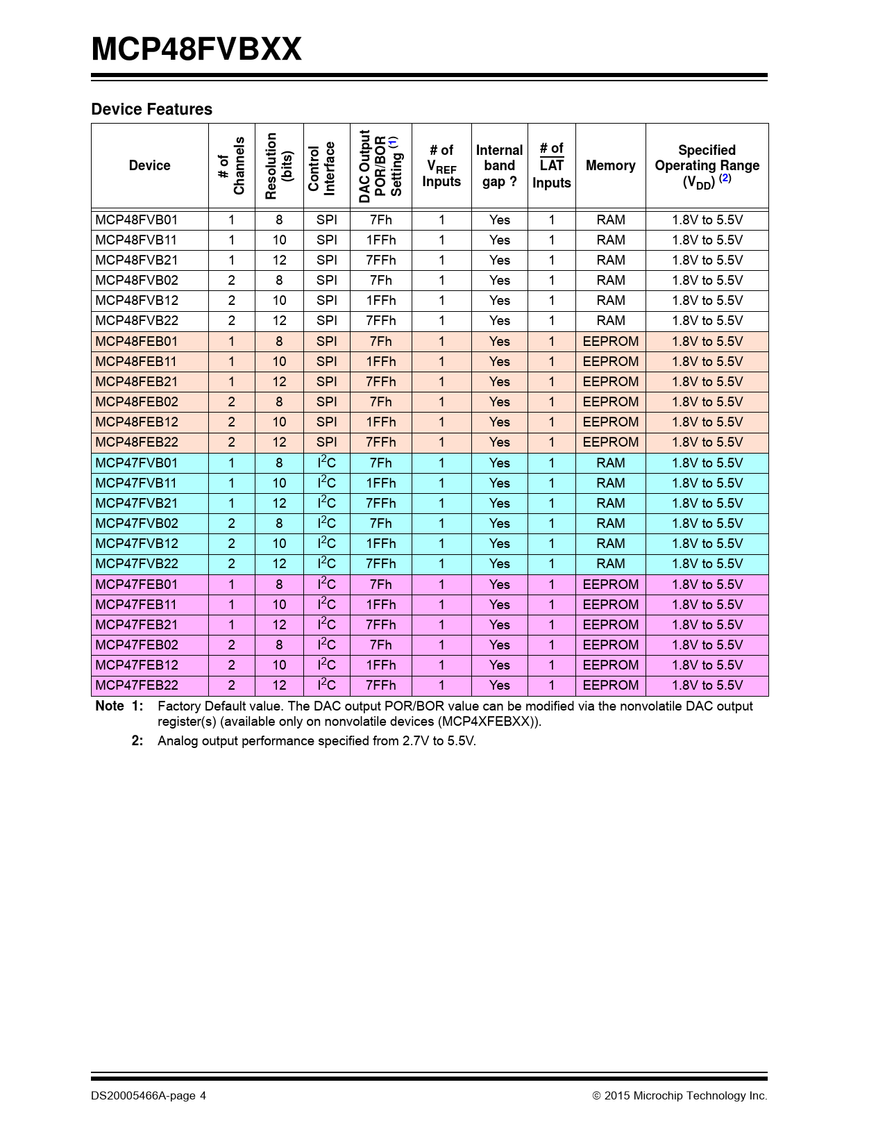 MCP48FVBXX. Device Features. # of. Internal. Specified. Device. lutio. trol. band. LAT. Memory. Operating Range. # o. REF. (bit. terfac. tting. Inputs
