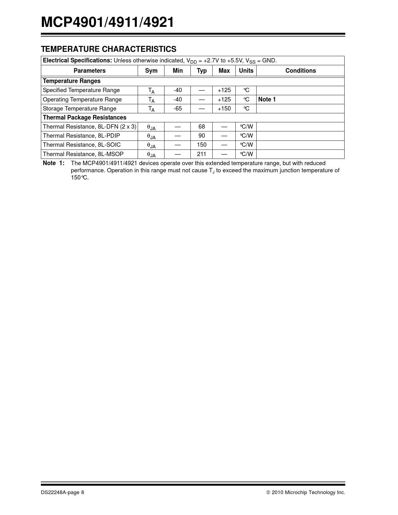 link to page 8 MCP4901/4911/4921TEMPERATURE CHARACTERISTICSElectrical Specifications: Unless otherwise indicated, VDD = +2.7V to +5.5V, VSS = GND. ParametersSymMinTypMaxUnitsConditionsTemperature Ranges Specified Temperature Range TA -40 — +125 °C Operating Temperature Range TA -40 — +125 °C Note 1 Storage Temperature Range TA -65 — +150 °C Thermal Package Resistances Thermal Resistance, 8L-DFN (2 x 3) JA — 68 — °C/W Thermal Resistance, 8L-PDIP JA — 90 — °C/W Thermal Resistance, 8L-SOIC JA — 150 — °C/W Thermal Resistance, 8L-MSOP JA — 211 — °C/W Note 1: The MCP4901/4911/4921 devices operate over this extended temperature range, but with reduced performance. Operation in this range must not cause T to exceed the maximum junction temperature of J 150°C. DS22248A-page 8 2010 Microchip Technology Inc. Document Outline 1.0 Electrical Characteristics FIGURE 1-1: SPI Input Timing Data. 2.0 Typical Performance Curves FIGURE 2-1: DNL vs. Code (MCP4921). FIGURE 2-2: DNL vs. Code and Temperature (MCP4921). FIGURE 2-3: DNL vs. Code and VREF, Gain=1 (MCP4921). FIGURE 2-4: Absolute DNL vs. Temperature (MCP4921). FIGURE 2-5: Absolute DNL vs. Voltage Reference (MCP4921). FIGURE 2-6: INL vs. Code and Temperature (MCP4921). FIGURE 2-7: Absolute INL vs. Temperature (MCP4921). FIGURE 2-8: Absolute INL vs. VREF (MCP4921). FIGURE 2-9: INL vs. Code and VREF (MCP4921). FIGURE 2-10: INL vs. Code (MCP4921). FIGURE 2-11: DNL vs. Code and Temperature (MCP4911). FIGURE 2-12: INL vs. Code and Temperature (MCP4911). FIGURE 2-13: DNL vs. Code and Temperature (MCP4901). FIGURE 2-14: INL vs. Code and Temperature (MCP4901). FIGURE 2-15: IDD vs. Temperature and VDD. FIGURE 2-16: IDD Histogram (VDD = 2.7V). FIGURE 2-17: IDD Histogram (VDD = 5.0V). FIGURE 2-18: Shutdown Current vs. Temperature and VDD. FIGURE 2-19: Offset Error vs.Temperature and VDD. FIGURE 2-20: Gain Error vs. Temperature and VDD. FIGURE 2-21: VIN High Threshold vs. Temperature and VDD. FIGURE 2-22: VIN Low Threshold vs. Temperature and VDD. FIGURE 2-23: Input Hysteresis vs. Temperature and VDD. FIGURE 2-24: VREF Input Impedance vs. Temperature and VDD. FIGURE 2-25: VOUT High Limit vs. Temperature and VDD. FIGURE 2-26: VOUT Low Limit vs. Temperature and VDD. FIGURE 2-27: IOUT High Short vs. Temperature and VDD. FIGURE 2-28: IOUT vs. VOUT. Gain = 1. FIGURE 2-29: VOUT Rise Time FIGURE 2-30: VOUT Fall Time. FIGURE 2-31: VOUT Rise Time FIGURE 2-32: VOUT Rise Time FIGURE 2-33: VOUT Rise Time Exit Shutdown. FIGURE 2-34: PSRR vs. Frequency. FIGURE 2-35: Multiplier Mode Bandwidth. FIGURE 2-36: -3 db Bandwidth vs. Worst Codes. FIGURE 2-37: Phase Shift. 3.0 Pin Descriptions TABLE 3-1: Pin Function Table 3.1 Supply Voltage Pins (VDD, VSS) 3.2 Chip Select (CS) 3.3 Serial Clock Input (SCK) 3.4 Serial Data Input (SDI) 3.5 Latch DAC Input (LDAC) 3.6 Analog Output (VOUT) 3.7 Voltage Reference Input (VREF) 3.8 Exposed Thermal Pad (EP) 4.0 General Overview TABLE 4-1: LSb of each device 4.1 DC Accuracy FIGURE 4-1: Example for INL Error. FIGURE 4-2: Example for DNL Accuracy. 4.2 Circuit Descriptions FIGURE 4-3: Typical Transient Response. FIGURE 4-4: Output Stage for Shutdown Mode. 5.0 Serial Interface 5.1 Overview 5.2 Write Command FIGURE 5-1: Write Command for MCP4921 (12-bit DAC). FIGURE 5-2: Write Command for MCP4911 (10-bit DAC). Note: X are don’t care bits. FIGURE 5-3: Write Command for MCP4901(8-bit DAC). Note: X are don’t care bits. 6.0 Typical Applications 6.1 Digital Interface 6.2 Power Supply Considerations FIGURE 6-1: Typical Connection Diagram. 6.3 Layout Considerations 6.4 Single-Supply Operation 6.5 Bipolar Operation 6.6 Selectable Gain and Offset Bipolar Voltage Output Using DAC Devices 6.7 Designing a Double-Precision DAC 6.8 Building Programmable Current Source 6.9 Using Multiplier Mode 7.0 Development support 7.1 Evaluation & Demonstration Boards 8.0 Packaging Information 8.1 Package Marking Information Corporate Office Atlanta Boston Chicago Cleveland Fax: 216-447-0643 Dallas Detroit Kokomo Toronto Fax: 852-2401-3431 Australia - Sydney China - Beijing China - Shanghai India - Bangalore Korea - Daegu Korea - Seoul Singapore Taiwan - Taipei Fax: 43-7242-2244-393 Denmark - Copenhagen France - Paris Germany - Munich Italy - Milan Spain - Madrid UK - Wokingham Worldwide Sales and Service