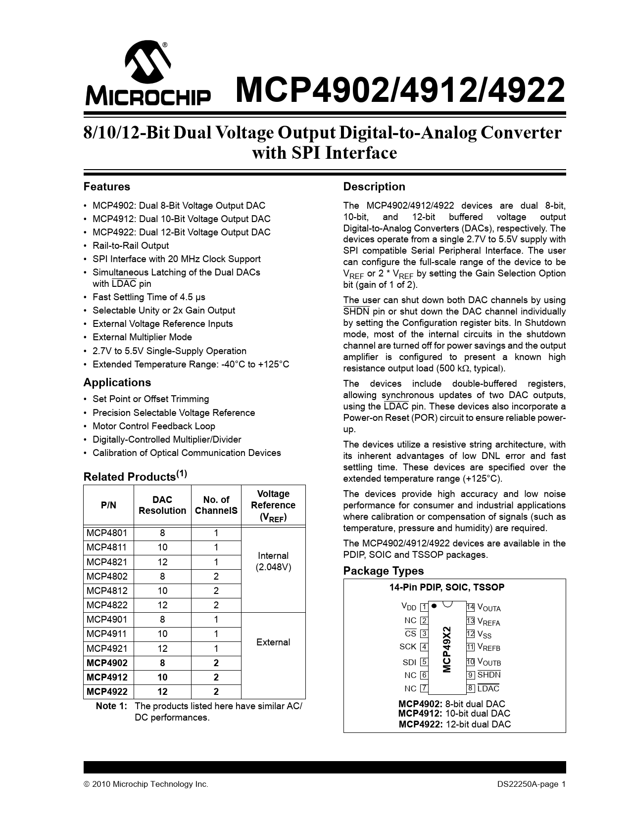 MCP4902/4912/49228/10/12-Bit Dual Voltage Output Digital-to-Analog Converterwith SPI InterfaceFeaturesDescription • MCP4902: Dual 8-Bit Voltage Output DAC The MCP4902/4912/4922 devices are dual 8-bit, • MCP4912: Dual 10-Bit Voltage Output DAC 10-bit, and 12-bit buffered voltage output • MCP4922: Dual 12-Bit Voltage Output DAC Digital-to-Analog Converters (DACs), respectively. The devices operate from a single 2.7V to 5.5V supply with • Rail-to-Rail Output SPI compatible Serial Peripheral Interface. The user • SPI Interface with 20 MHz Clock Support can configure the full-scale range of the device to be • Simultaneous Latching of the Dual DACs VREF or 2 * VREF by setting the Gain Selection Option with LDAC pin bit (gain of 1 of 2). • Fast Settling Time of 4.5 µs The user can shut down both DAC channels by using • Selectable Unity or 2x Gain Output SHDN pin or shut down the DAC channel individually • External Voltage Reference Inputs by setting the Configuration register bits. In Shutdown • External Multiplier Mode mode, most of the internal circuits in the shutdown channel are turned off for power savings and the output • 2.7V to 5.5V Single-Supply Operation amplifier is configured to present a known high • Extended Temperature Range: -40°C to +125°C resistance output load (500 ktypical. Applications The devices include double-buffered registers, • Set Point or Offset Trimming allowing synchronous updates of two DAC outputs, using the LDAC pin. These devices also incorporate a • Precision Selectable Voltage Reference Power-on Reset (POR) circuit to ensure reliable power- • Motor Control Feedback Loop up. • Digitally-Controlled Multiplier/Divider The devices utilize a resistive string architecture, with • Calibration of Optical Communication Devices its inherent advantages of low DNL error and fast settling time. These devices are specified over the Related Products(1) extended temperature range (+125°C). Voltage The devices provide high accuracy and low noise DACNo. ofP/NReference performance for consumer and industrial applications Resolution ChannelS(V where calibration or compensation of signals (such as REF) temperature, pressure and humidity) are required. MCP4801 8 1 The MCP4902/4912/4922 devices are available in the MCP4811 10 1 Internal PDIP, SOIC and TSSOP packages. MCP4821 12 1 (2.048V) Package Types MCP4802 8 2 MCP4812 10 2 14-Pin PDIP, SOIC, TSSOP MCP4822 12 2 VDD 1 14 VOUTA MCP4901 8 1 NC 2 13 VREFA 2 MCP4911 10 1 CS 3 12 V X SS External MCP4921 12 1 SCK 4 11 VREFB P49MCP490282 SDI 5 10 VOUTB MCMCP4912102 NC 6 9 SHDN MCP4922122 NC 7 8 LDAC Note 1: The products listed here have similar AC/ MCP4902: 8-bit dual DAC DC performances. MCP4912: 10-bit dual DAC MCP4922: 12-bit dual DAC 2010 Microchip Technology Inc. DS22250A-page 1 Document Outline 1.0 Electrical Characteristics FIGURE 1-1: SPI Input Timing Data. 2.0 Typical Performance Curves FIGURE 2-1: DNL vs. Code (MCP4922). FIGURE 2-2: DNL vs. Code and Temperature (MCP4922). FIGURE 2-3: DNL vs. Code and VREF, Gain = 1 (MCP4922). FIGURE 2-4: Absolute DNL vs. Temperature (MCP4922). FIGURE 2-5: Absolute DNL vs. Voltage Reference (MCP4922). FIGURE 2-6: INL vs. Code and Temperature (MCP4922). FIGURE 2-7: Absolute INL vs. Temperature (MCP4922). FIGURE 2-8: Absolute INL vs. VREF (MCP4922). FIGURE 2-9: INL vs. Code and VREF (MCP4922). FIGURE 2-10: INL vs. Code (MCP4922). FIGURE 2-11: DNL vs. Code and Temperature (MCP4912). FIGURE 2-12: INL vs. Code and Temperature (MCP4912). FIGURE 2-13: DNL vs. Code and Temperature (MCP4902). FIGURE 2-14: INL vs. Code and Temperature (MCP4902). FIGURE 2-15: IDD vs. Temperature and VDD. FIGURE 2-16: IDD Histogram (VDD = 2.7V). FIGURE 2-17: IDD Histogram (VDD = 5.0V). FIGURE 2-18: Hardware Shutdown Current vs. Ambient Temperature and VDD. FIGURE 2-19: Software Shutdown Current vs. Ambient Temperature and VDD. FIGURE 2-20: Offset Error vs. Ambient Temperature and VDD. FIGURE 2-21: Gain Error vs. Ambient Temperature and VDD. FIGURE 2-22: VIN High Threshold vs Ambient Temperature and VDD. FIGURE 2-23: VIN Low Threshold vs Ambient Temperature and VDD. FIGURE 2-24: Input Hysteresis vs. Ambient Temperature and VDD. FIGURE 2-25: VREF Input Impedance vs. Ambient Temperature and VDD. FIGURE 2-26: VOUT High Limit vs. Ambient Temperature and VDD. FIGURE 2-27: VOUT Low Limit vs. Ambient Temperature and VDD. FIGURE 2-28: IOUT High Short vs. Ambient Temperature and VDD. FIGURE 2-29: IOUT vs VOUT. Gain = 1x. FIGURE 2-30: VOUT Rise Time. FIGURE 2-31: VOUT Fall Time. FIGURE 2-32: VOUT Rise Time. FIGURE 2-33: VOUT Rise Time. FIGURE 2-34: VOUT Rise Time Exit Shutdown. FIGURE 2-35: PSRR vs. Frequency. FIGURE 2-36: Multiplier Mode Bandwidth. FIGURE 2-37: -3 db Bandwidth vs. Worst Codes. FIGURE 2-38: Phase Shift. 3.0 Pin Descriptions TABLE 3-1: Pin Function Table 3.1 Supply Voltage Pins (VDD, VSS) 3.2 Chip Select (CS) 3.3 Serial Clock Input (SCK) 3.4 Serial Data Input (SDI) 3.5 Latch DAC Input (LDAC) 3.6 Hardware Shutdown Input (SHDN) 3.7 Analog Outputs (VOUTA, VOUTB) 3.8 Voltage Reference Inputs (VREFA, VREFB) 4.0 General Overview TABLE 4-1: LSb of each device 4.1 DC Accuracy FIGURE 4-1: Example for INL Error. FIGURE 4-2: Example for DNL Accuracy. 4.2 Circuit Descriptions FIGURE 4-3: Typical Transient Response. FIGURE 4-4: Output Stage for Shutdown Mode. 5.0 Serial Interface 5.1 Overview 5.2 Write Command FIGURE 5-1: Write Command for MCP4922 (12-bit DAC). FIGURE 5-2: Write Command for MCP4912 (10-bit DAC). FIGURE 5-3: Write Command for MCP4902 (8-bit DAC). 6.0 Typical Applications 6.1 Digital Interface 6.2 Power Supply Considerations FIGURE 6-1: Typical Connection Diagram. 6.3 Layout Considerations 6.4 Single-Supply Operation 6.5 Bipolar Operation 6.6 Selectable Gain and Offset Bipolar Voltage Output Using a Dual DAC 6.7 Designing a Double-Precision DAC Using a Dual DAC 6.8 Building Programmable Current Source 6.9 Using Multiplier Mode 7.0 Development support 7.1 Evaluation and Demonstr