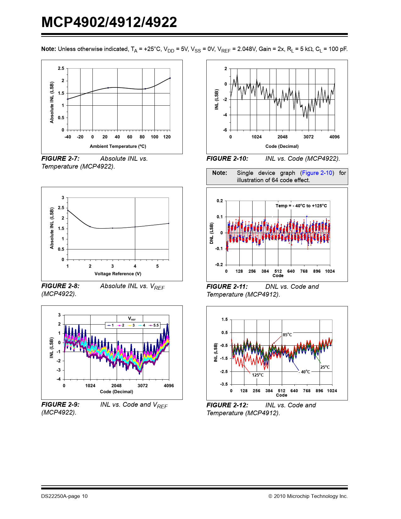 INL vs. Code and (MCP4922). Temperature (MCP4912). DS22250A-page 10  2010 Microchip Technology Inc. Document Outline 1.0 Electrical Characteristics FIGURE 1-1: SPI Input Timing Data. 2.0 Typical Performance Curves FIGURE 2-1: DNL vs. Code (MCP4922). FIGURE 2-2: DNL vs. Code and Temperature (MCP4922). FIGURE 2-3: DNL vs. Code and VREF, Gain = 1 (MCP4922). FIGURE 2-4: Absolute DNL vs. Temperature (MCP4922). FIGURE 2-5: Absolute DNL vs. Voltage Reference (MCP4922). FIGURE 2-6: INL vs. Code and Temperature (MCP4922). FIGURE 2-7: Absolute INL vs. Temperature (MCP4922). FIGURE 2-8: Absolute INL vs. VREF (MCP4922). FIGURE 2-9: INL vs. Code and VREF (MCP4922). FIGURE 2-10: INL vs. Code (MCP4922). FIGURE 2-11: DNL vs. Code and Temperature (MCP4912). FIGURE 2-12: INL vs. Code and Temperature (MCP4912). FIGURE 2-13: DNL vs. Code and Temperature (MCP4902). FIGURE 2-14: INL vs. Code and Temperature (MCP4902). FIGURE 2-15: IDD vs. Temperature and VDD. FIGURE 2-16: IDD Histogram (VDD = 2.7V). FIGURE 2-17: IDD Histogram (VDD = 5.0V). FIGURE 2-18: Hardware Shutdown Current vs. Ambient Temperature and VDD. FIGURE 2-19: Software Shutdown Current vs. Ambient Temperature and VDD. FIGURE 2-20: Offset Error vs. Ambient Temperature and VDD. FIGURE 2-21: Gain Error vs. Ambient Temperature and VDD. FIGURE 2-22: VIN High Threshold vs Ambient Temperature and VDD. FIGURE 2-23: VIN Low Threshold vs Ambient Temperature and VDD. FIGURE 2-24: Input Hysteresis vs. Ambient Temperature and VDD. FIGURE 2-25: VREF Input Impedance vs. Ambient Temperature and VDD. FIGURE 2-26: VOUT High Limit vs. Ambient Temperature and VDD. FIGURE 2-27: VOUT Low Limit vs. Ambient Temperature and VDD. FIGURE 2-28: IOUT High Short vs. Ambient Temperature and VDD. FIGURE 2-29: IOUT vs VOUT. Gain = 1x. FIGURE 2-30: VOUT Rise Time. FIGURE 2-31: VOUT Fall Time. FIGURE 2-32: VOUT Rise Time. FIGURE 2-33: VOUT Rise Time. FIGURE 2-34: VOUT Rise Time Exit Shutdown. FIGURE 2-35: PSRR vs. Frequency. FIGURE 2-36: Multiplier Mode Bandwidth. FIGURE 2-37: -3 db Bandwidth vs. Worst Codes. FIGURE 2-38: Phase Shift. 3.0 Pin Descriptions TABLE 3-1: Pin Function Table 3.1 Supply Voltage Pins (VDD, VSS) 3.2 Chip Select (CS) 3.3 Serial Clock Input (SCK) 3.4 Serial Data Input (SDI) 3.5 Latch DAC Input (LDAC) 3.6 Hardware Shutdown Input (SHDN) 3.7 Analog Outputs (VOUTA, VOUTB) 3.8 Voltage Reference Inputs (VREFA, VREFB) 4.0 General Overview TABLE 4-1: LSb of each device 4.1 DC Accuracy FIGURE 4-1: Example for INL Error. FIGURE 4-2: Example for DNL Accuracy. 4.2 Circuit Descriptions FIGURE 4-3: Typical Transient Response. FIGURE 4-4: Output Stage for Shutdown Mode. 5.0 Serial Interface 5.1 Overview 5.2 Write Command FIGURE 5-1: Write Command for MCP4922 (12-bit DAC). FIGURE 5-2: Write Command for MCP4912 (10-bit DAC). FIGURE 5-3: Write Command for MCP4902 (8-bit DAC). 6.0 Typical Applications 6.1 Digital Interface 6.2 Power Supply Considerations FIGURE 6-1: Typical Connection Diagram. 6.3 Layout Considerations 6.4 Single-Supply Operation 6.5 Bipolar Operation 6.6 Selectable Gain and Offset Bipolar Voltage Output Using a Dual DAC 6.7 Designing a Double-Precision DAC Using a Dual DAC 6.8 Building Programmable Current Source 6.9 Using Multiplier Mode 7.0 Development support 7.1 Evaluation and Demonstration Boards 8.0 Packaging Information 8.1 Package Marking Information Trademarks Worldwide Sales and Service
