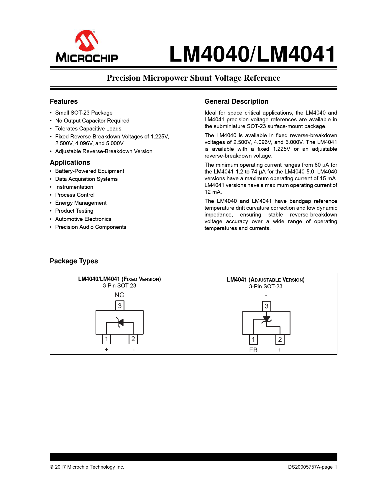 LM4040/LM4041Precision Micropower Shunt Voltage ReferenceFeaturesGeneral Description • Small SOT-23 Package Ideal for space critical applications, the LM4040 and • No Output Capacitor Required LM4041 precision voltage references are available in • Tolerates Capacitive Loads the subminiature SOT-23 surface-mount package. • Fixed Reverse-Breakdown Voltages of 1.225V, The LM4040 is available in fixed reverse-breakdown 2.500V, 4.096V, and 5.000V voltages of 2.500V, 4.096V, and 5.000V. The LM4041 • Adjustable Reverse-Breakdown Version is available with a fixed 1.225V or an adjustable reverse-breakdown voltage. Applications The minimum operating current ranges from 60 μA for • Battery-Powered Equipment the LM4041-1.2 to 74 μA for the LM4040-5.0. LM4040 • Data Acquisition Systems versions have a maximum operating current of 15 mA. • Instrumentation LM4041 versions have a maximum operating current of • Process Control 12 mA. • Energy Management The LM4040 and LM4041 have bandgap reference • Product Testing temperature drift curvature correction and low dynamic impedance, ensuring stable reverse-breakdown • Automotive Electronics voltage accuracy over a wide range of operating • Precision Audio Components temperatures and currents. Package TypesLM4040/LM4041 (FIXED VERSION)LM4041 (ADJUSTABLE VERSION) 3-Pin SOT-23 3-Pin SOT-23 NC - 3 3 1 2 1 2 + - FB + 2017 Microchip Technology Inc. DS20005757A-page 1 Document Outline 1.0 Electrical Characteristics 2.0 Typical Performance Curves 3.0 Pin Descriptions 4.0 Application Information 4.1 Schottky Diode 4.2 Conventional Shunt Regulator 4.3 Adjustable Regulator 5.0 Typical Application Circuits 6.0 Packaging Information 6.1 Package Marking Information APPENDIX A: Revision History Product Identification System Worldwide Sales and Service