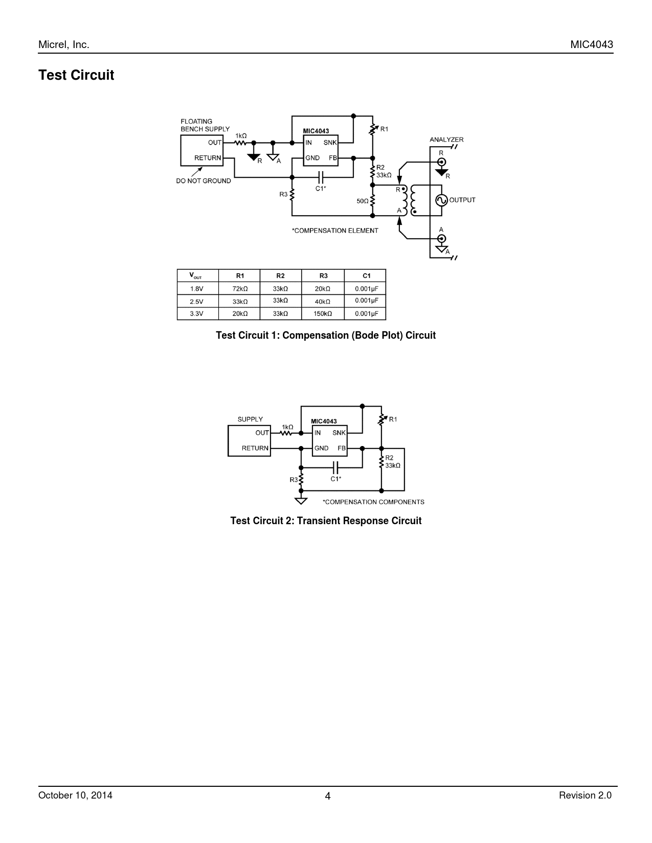Micrel, Inc. MIC4043 Test Circuit Test Circuit 1: Compensation (Bode Plot) Circuit Test Circuit 2: Transient Response Circuit October 10, 2014 4 Revision 2.0